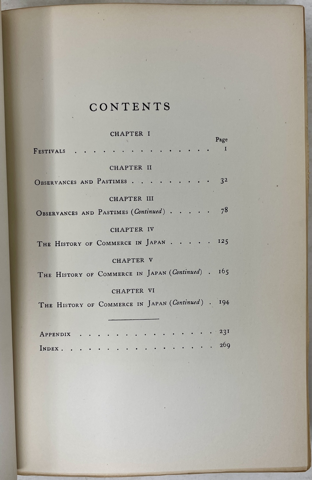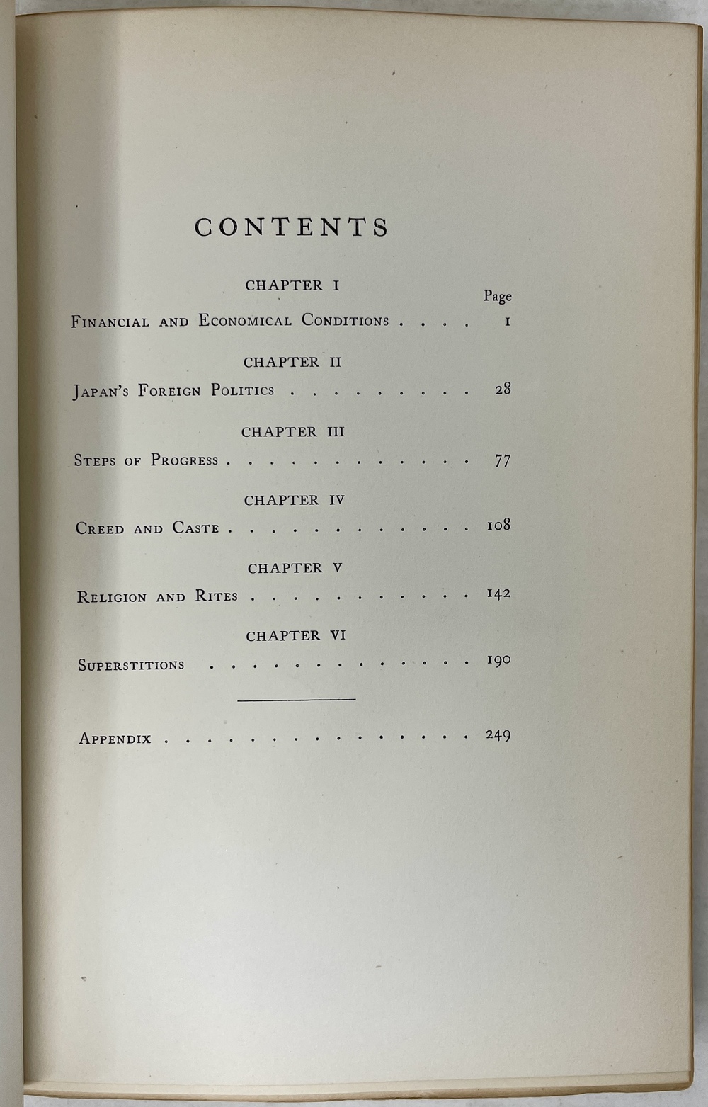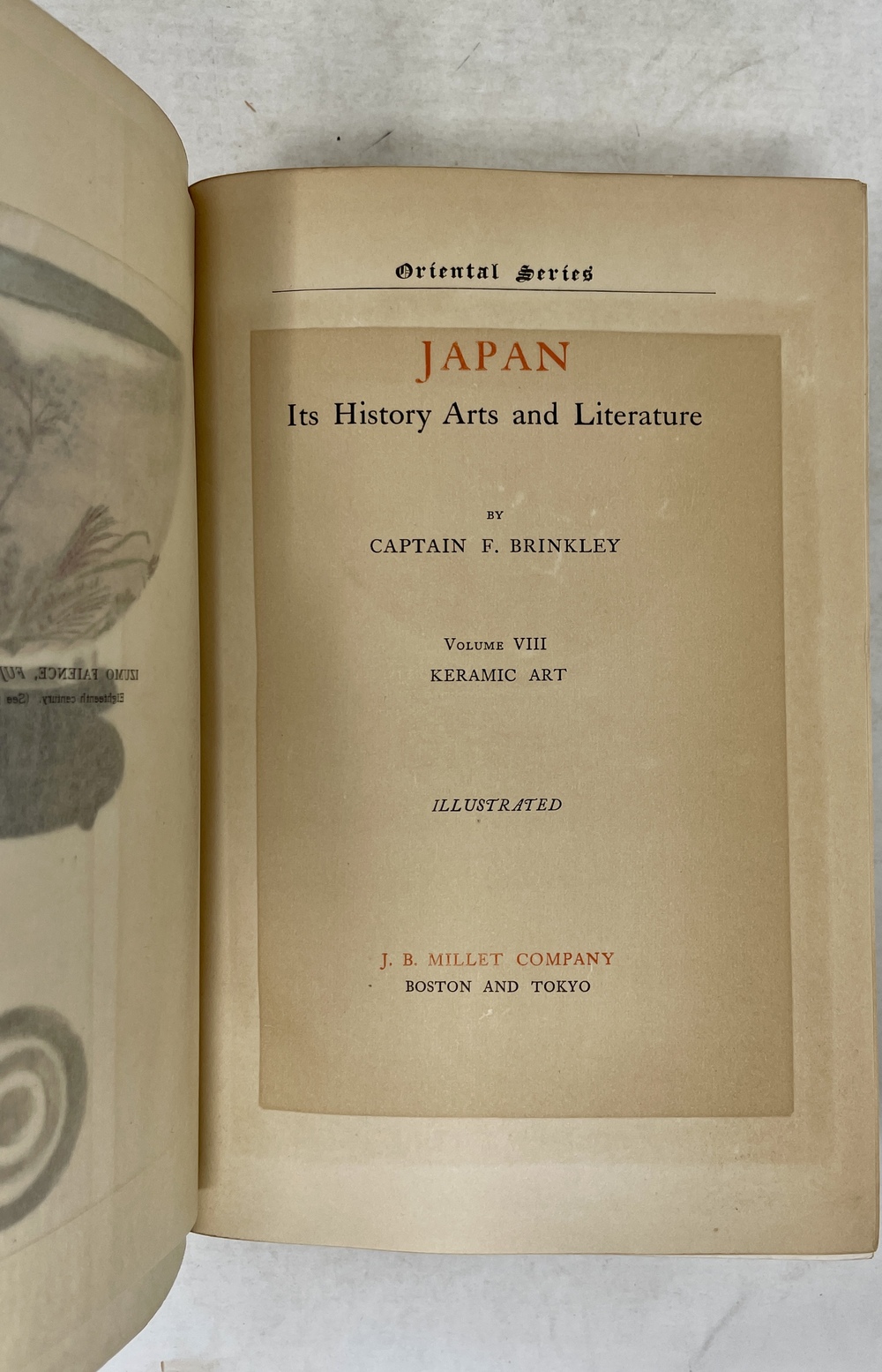 テキストの構成は、第1巻から第6巻までが、日本の政治、歴史、社会に関する考察となっており、第1巻から第3巻までで古代(神話時代)より江戸幕府の倒壊までの歴史を論じ、第4巻では江戸時代の文化や風習、社会、政治制度、教育や学問などに加えて「開明統治」(Enlightened Government)たる「明治時代」についてが論じられています。第5巻と第6巻では現代日本の政治経済状況や社会制度、対外政策の発展、商業の歴史といった日本の政治経済に関する事項が論じられるとともに天王祭や祇園祭といった日本を代表する催事や年中行事なども解説されています。第7巻と第8巻は日本の芸術論となっていて、第7巻が視覚芸術(絵画、版画)、応用芸術(彫刻等)を扱い、第8巻が当時の輸出品として西洋各国で大いに好評を博していた陶磁器についての考察に当てられているようです。前作では一部の特別版に、岡倉天心による「日本の芸術論」が収録され、さらに、1901年頃には自ら『日本の芸術論』(The art of Japan. 2 vols. Boston, J.B.Millet)を刊行しており、本書第7巻と第8巻はこれを踏まえて、ブリンクリー自らが特に自身の関心の深かった日本の芸術論を改めて展開したものと考えられます。