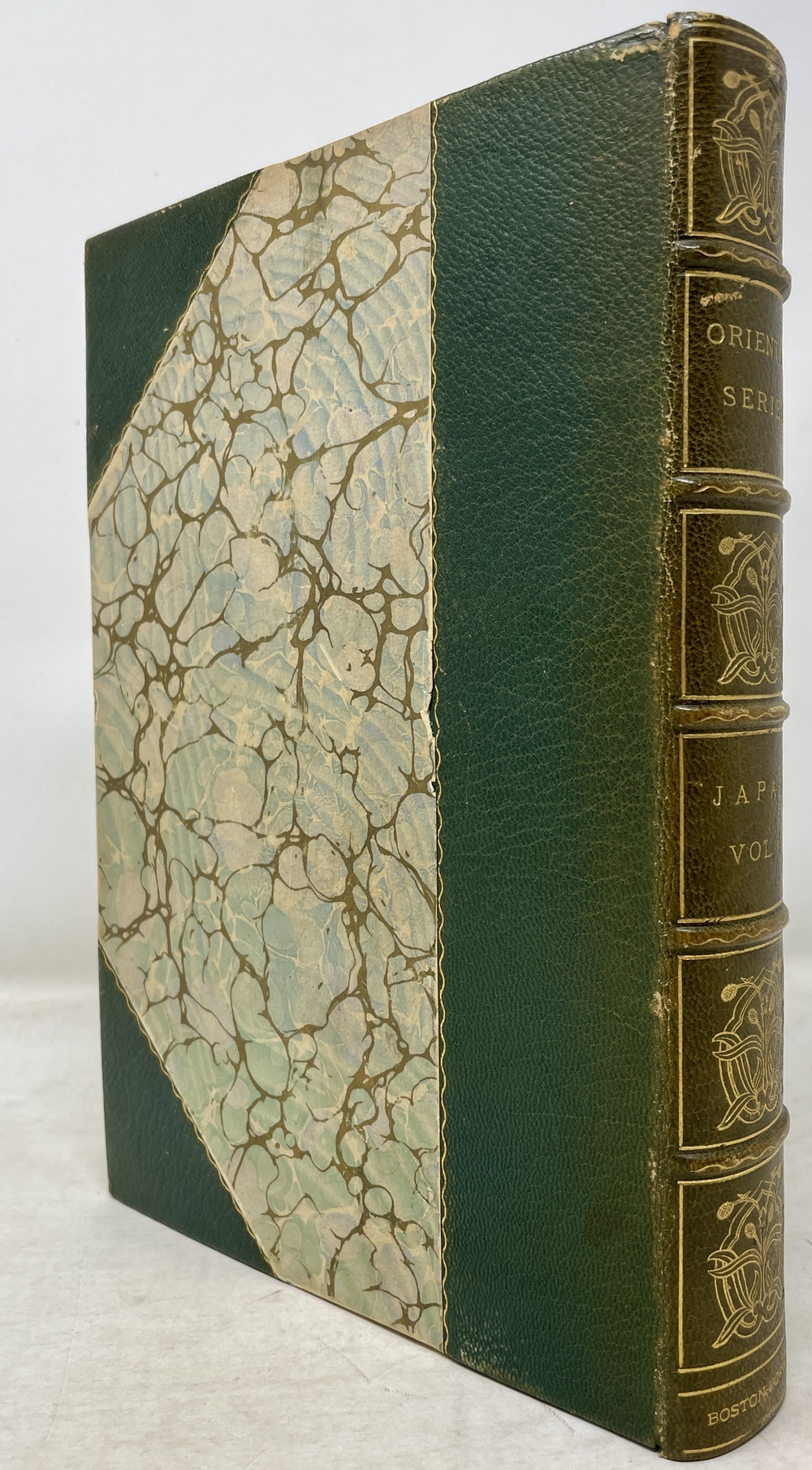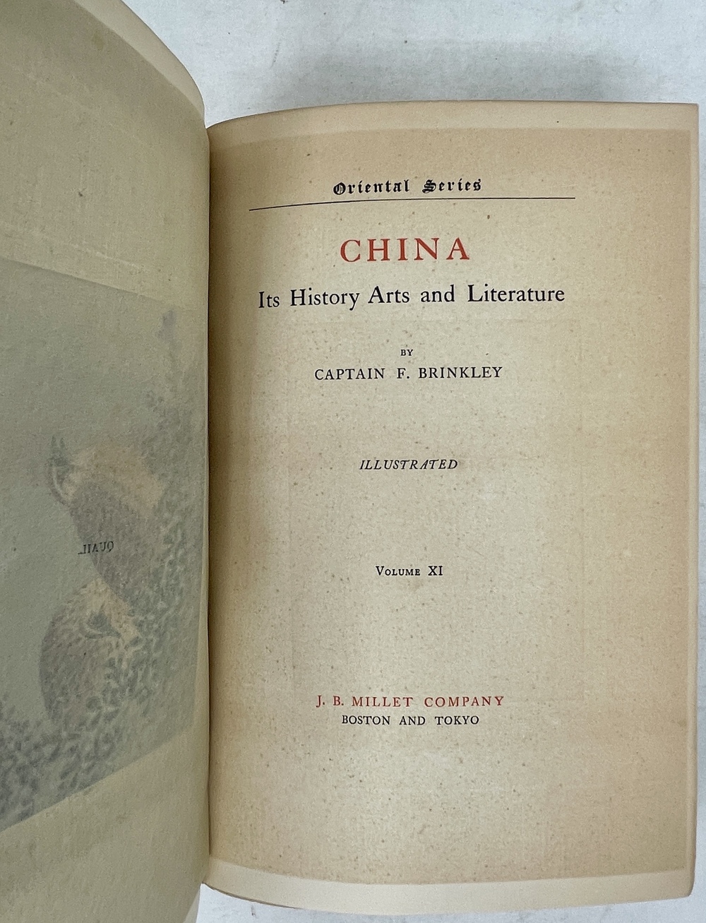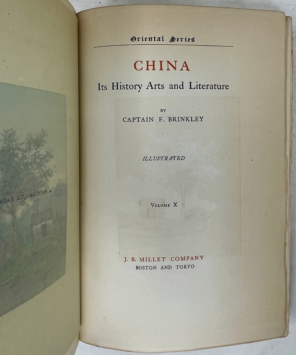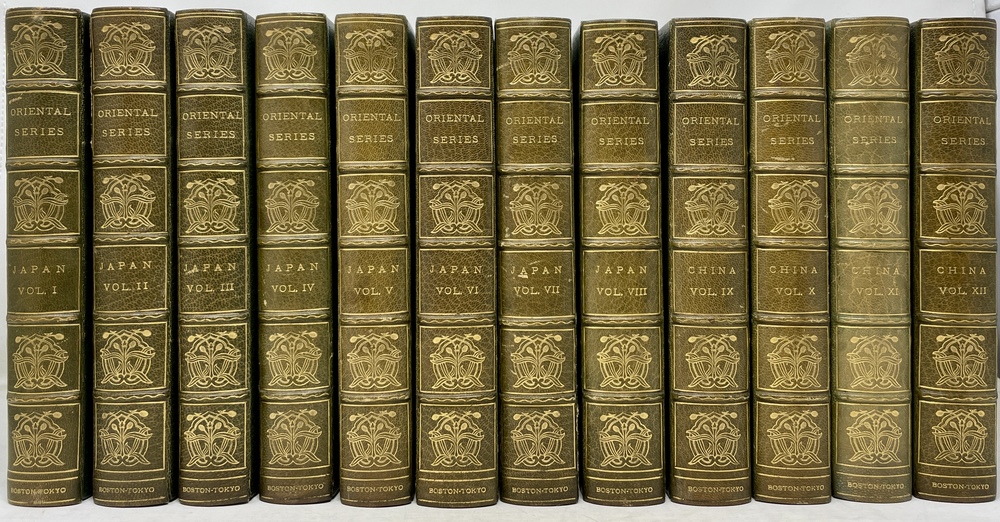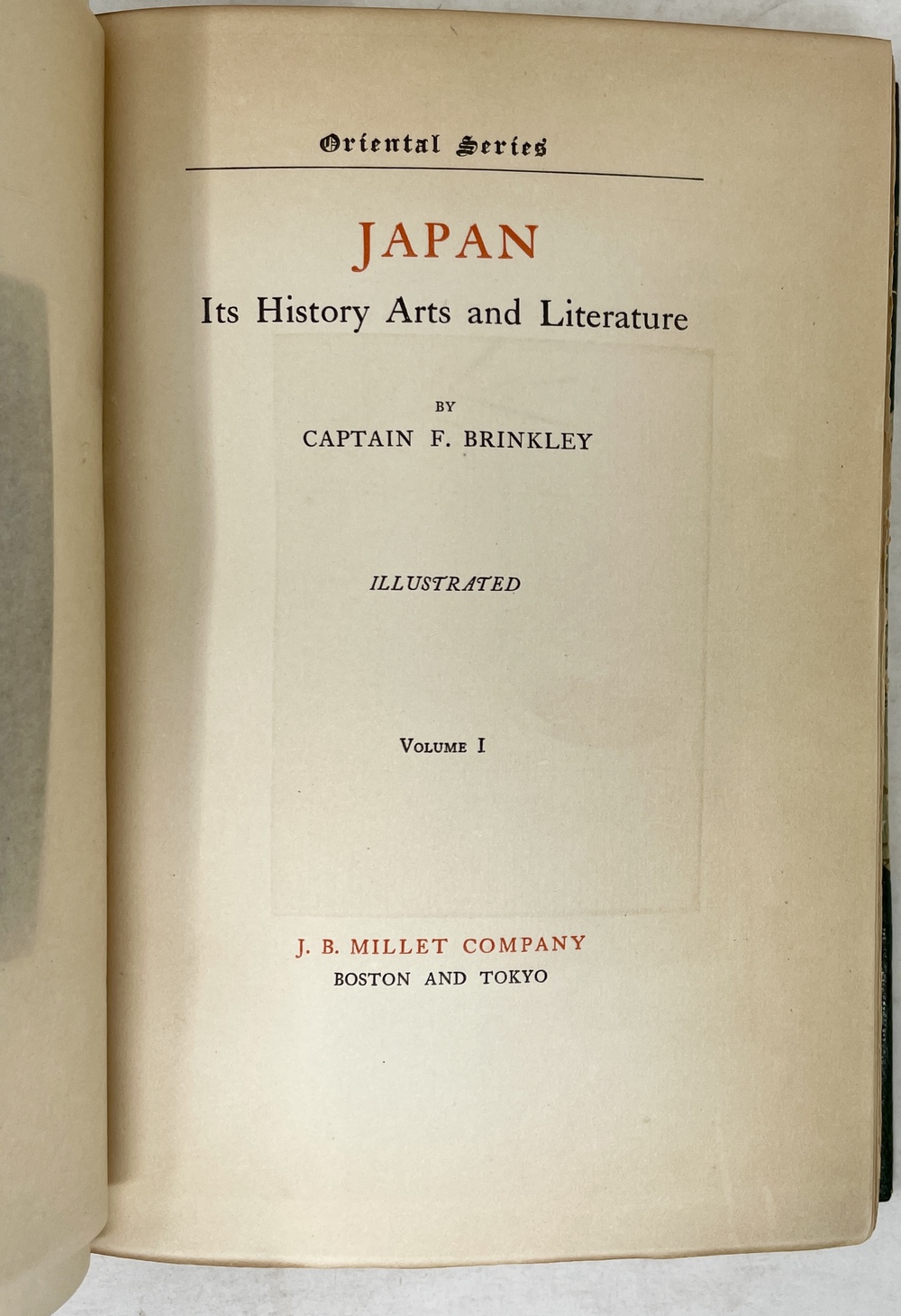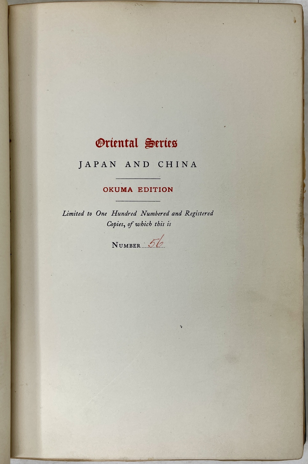 ブリンクリーによるこの著作は、1897年に刊行された大部の全10巻からなる著作『日本:日本の人々によって記され、写された』(Japan: Described and illustrated by the Japanese. 10 vols. Boston, J.B.Millet, 1897)に続くもので、同書をさらに発展させて、中国も含めた総合的な東洋論を展開しようとしたものです。同書は、「江戸版」など、数多くの特別限定版が出版されたことで知られていますが、それに続くこの作品もまた多くの特別限定版が出版されていて、本書はそのうちの、「大隈版(OKUMA EDITION)」というわずか100部のみが製作された特別版で、第56番という数字が手書きで各巻冒頭に記されています。この特別版は、各巻の冒頭口絵に彩色絹絵を設けているだけでなく、本文とは別刷で制作された、北斎の木版画の復刻版、そして現代の木版画作家による木版画作品を収録するという大変手間とコストのかかった特別な仕様となっています。また、用いられている用紙も手隙の厚手の用紙で、見返しにも特別な用紙を用いるなど、ごく少部数のみが制作された限定版に相応しい、ブリンクリーの情熱が感じられる作品となっています。本書はさらに、当時の購入者が施したものと思われる大変美しい高品質なモロッコ革と呼ばれるシボのある緑の皮革とマーブル紙を配したとても美しい装丁がなされていて、書物としての魅力を高める仕上がりとなっています。