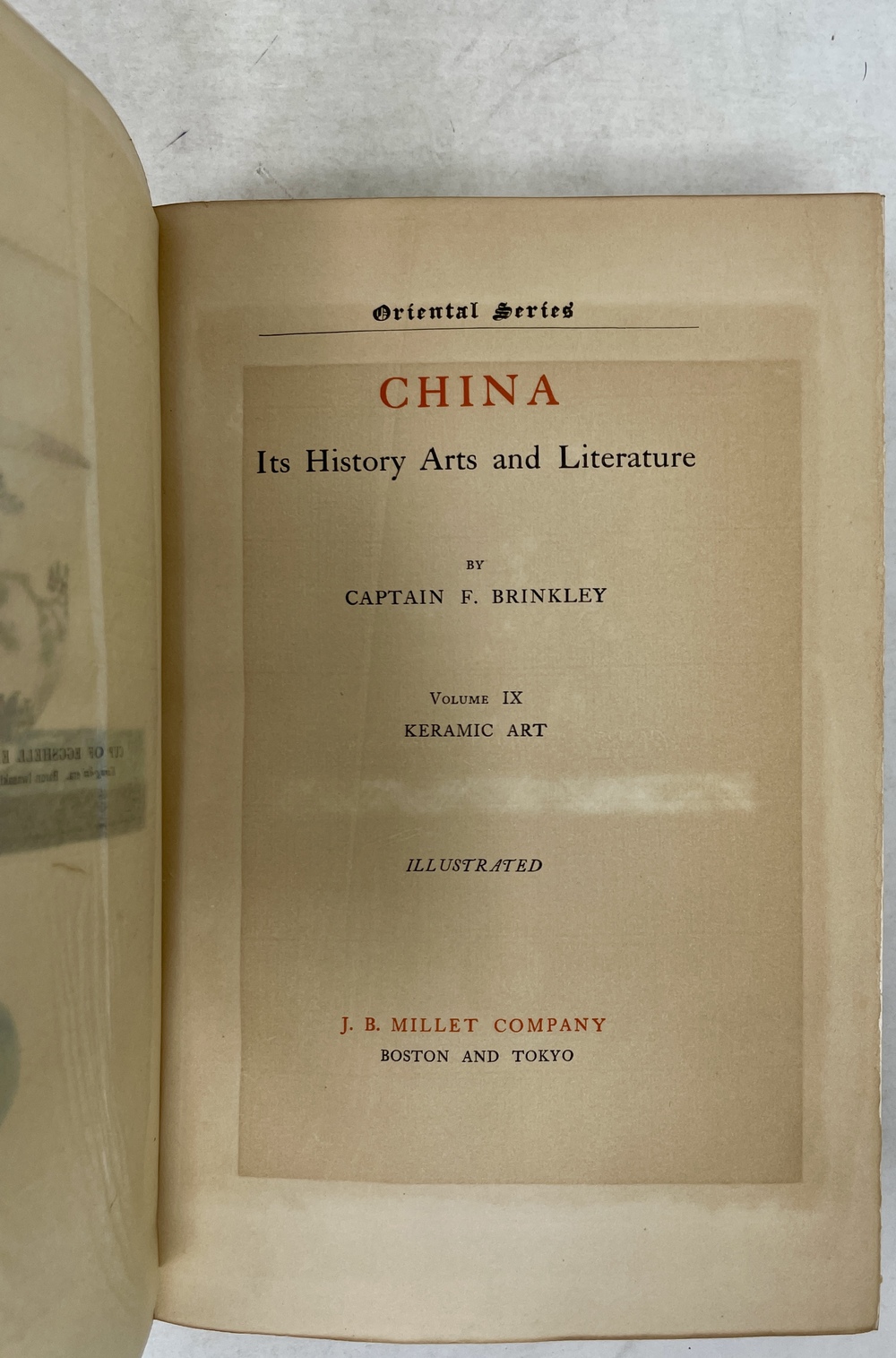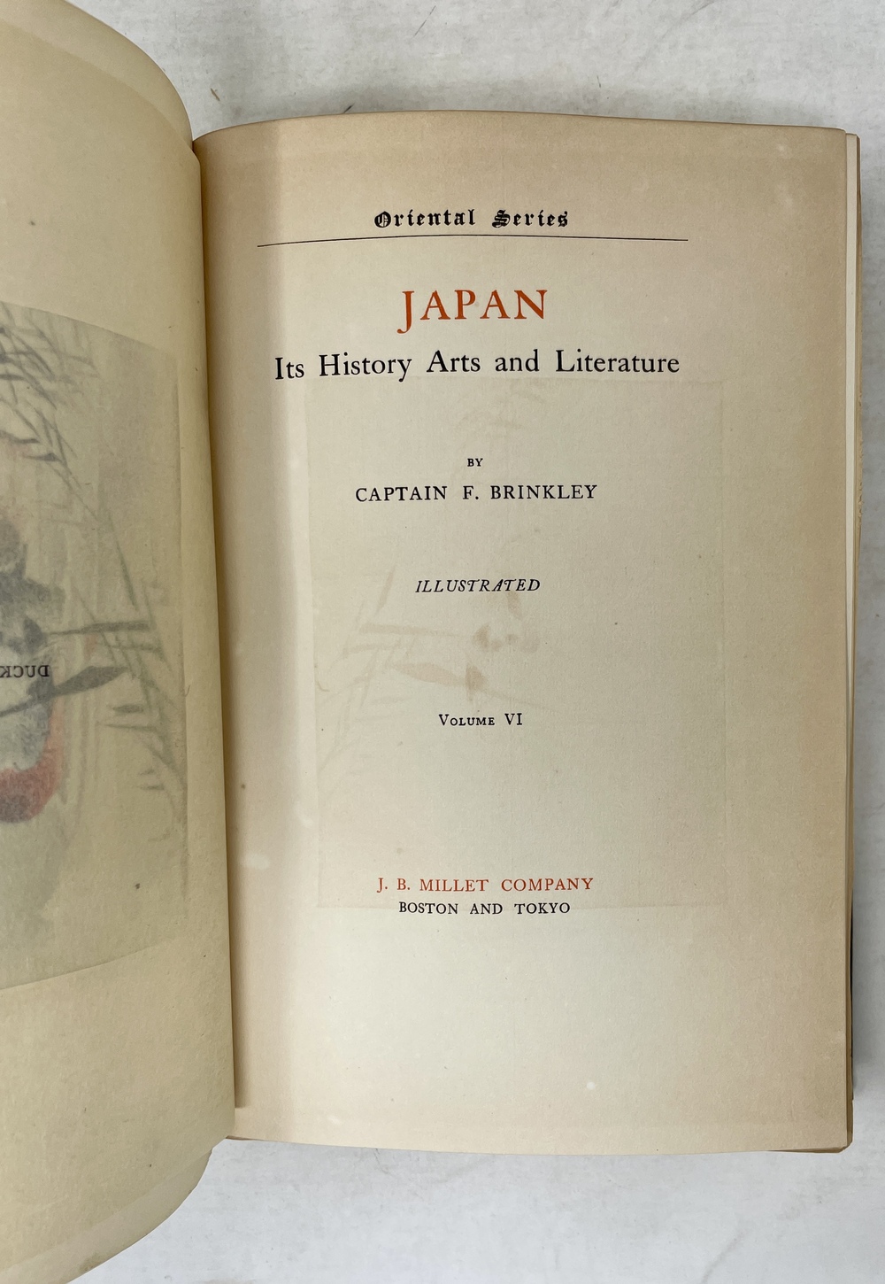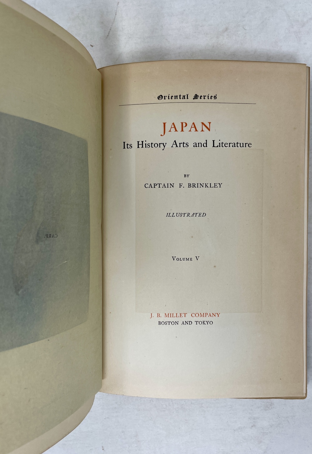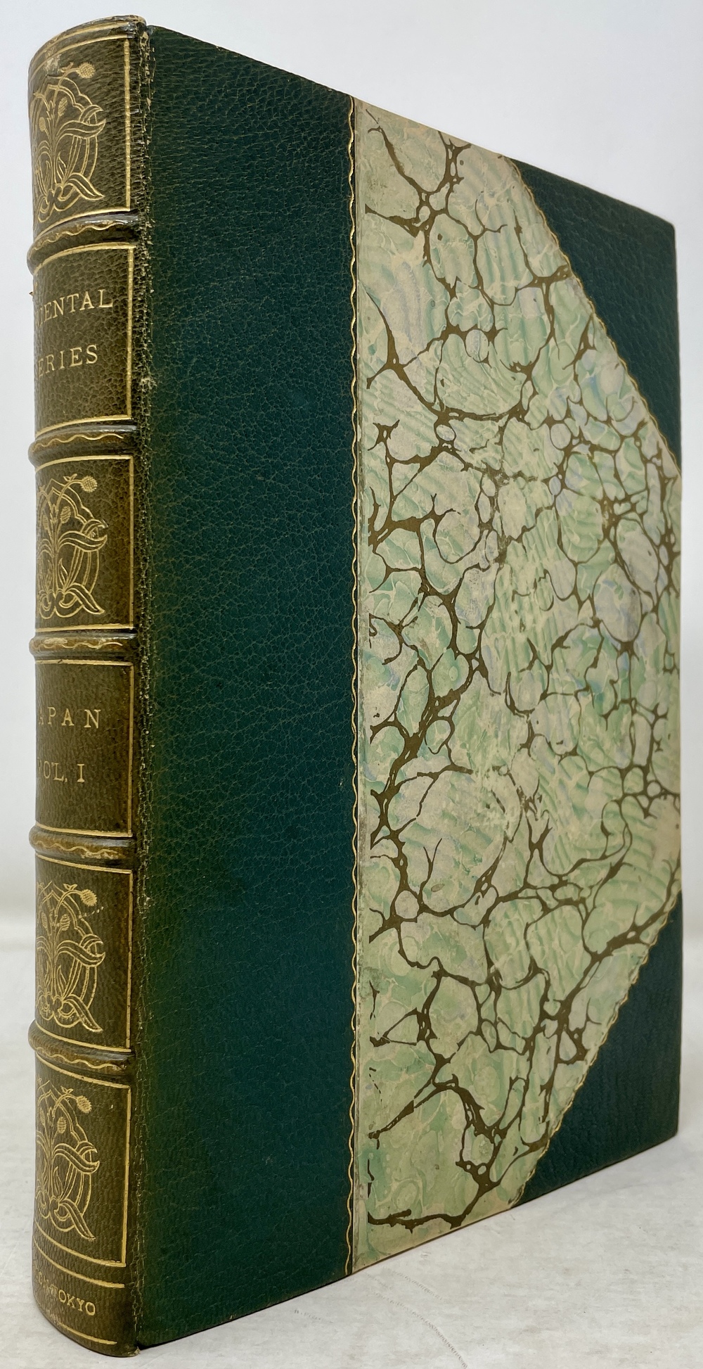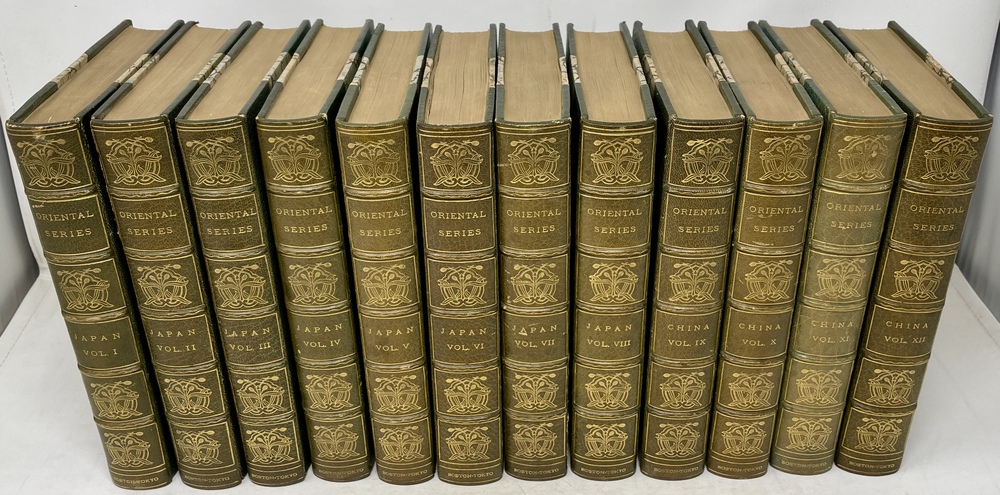 ブリンクリーによるこの著作は、1897年に刊行された大部の全10巻からなる著作『日本:日本の人々によって記され、写された』(Japan: Described and illustrated by the Japanese. 10 vols. Boston, J.B.Millet, 1897)に続くもので、同書をさらに発展させて、中国も含めた総合的な東洋論を展開しようとしたものです。同書は、「江戸版」など、数多くの特別限定版が出版されたことで知られていますが、それに続くこの作品もまた多くの特別限定版が出版されていて、本書はそのうちの、「大隈版(OKUMA EDITION)」というわずか100部のみが製作された特別版で、第56番という数字が手書きで各巻冒頭に記されています。この特別版は、各巻の冒頭口絵に彩色絹絵を設けているだけでなく、本文とは別刷で制作された、北斎の木版画の復刻版、そして現代の木版画作家による木版画作品を収録するという大変手間とコストのかかった特別な仕様となっています。また、用いられている用紙も手隙の厚手の用紙で、見返しにも特別な用紙を用いるなど、ごく少部数のみが制作された限定版に相応しい、ブリンクリーの情熱が感じられる作品となっています。本書はさらに、当時の購入者が施したものと思われる大変美しい高品質なモロッコ革と呼ばれるシボのある緑の皮革とマーブル紙を配したとても美しい装丁がなされていて、書物としての魅力を高める仕上がりとなっています。