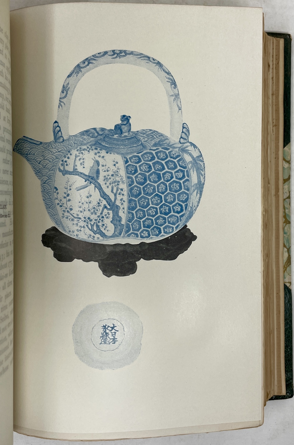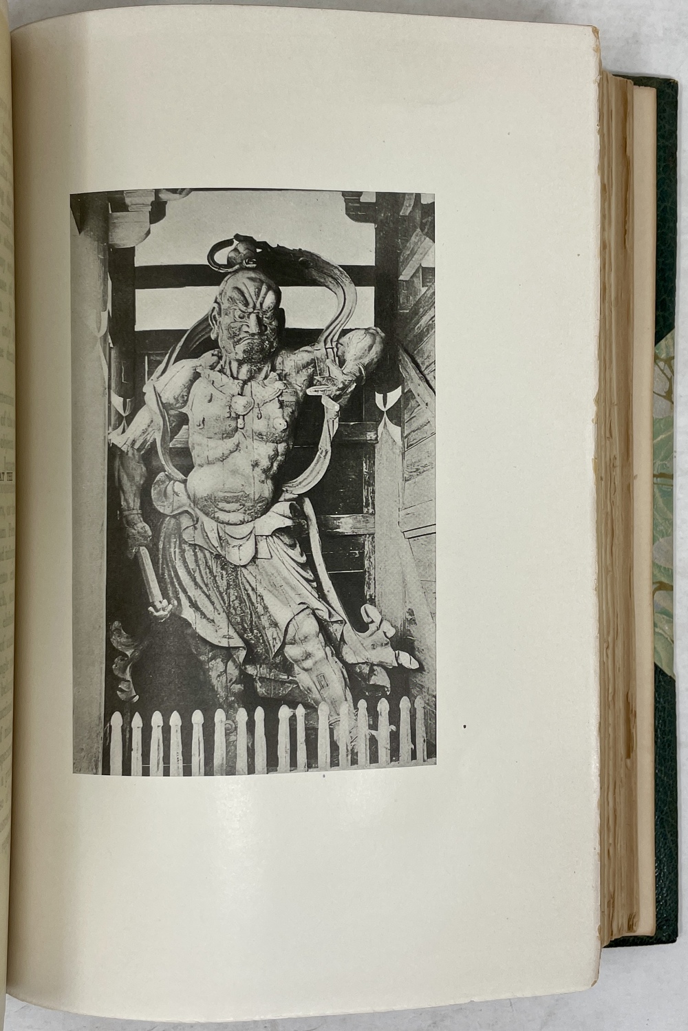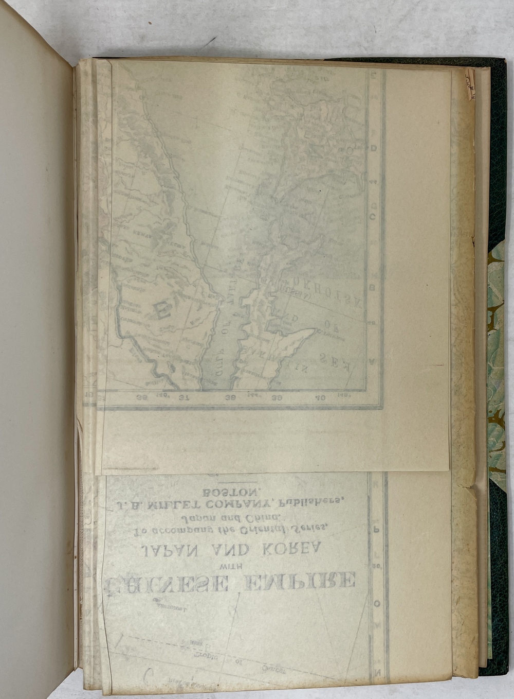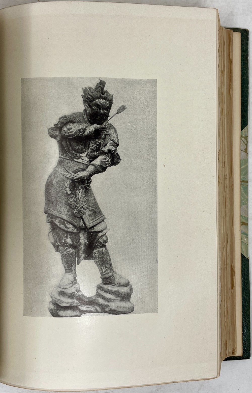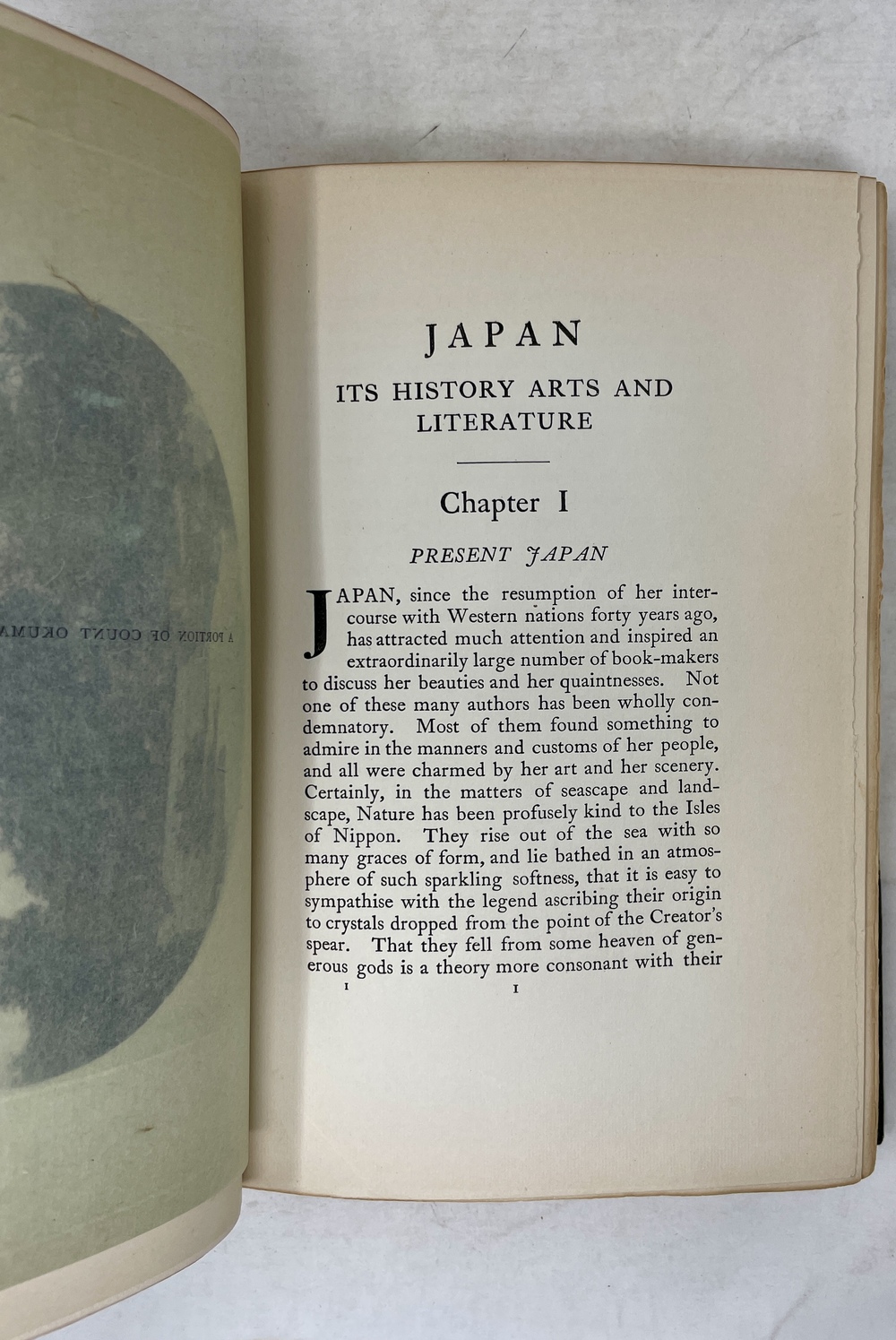 ブリンクリーによるこの著作は、1897年に刊行された大部の全10巻からなる著作『日本:日本の人々によって記され、写された』(Japan: Described and illustrated by the Japanese. 10 vols. Boston, J.B.Millet, 1897)に続くもので、同書をさらに発展させて、中国も含めた総合的な東洋論を展開しようとしたものです。同書は、「江戸版」など、数多くの特別限定版が出版されたことで知られていますが、それに続くこの作品もまた多くの特別限定版が出版されていて、本書はそのうちの、「大隈版(OKUMA EDITION)」というわずか100部のみが製作された特別版で、第56番という数字が手書きで各巻冒頭に記されています。この特別版は、各巻の冒頭口絵に彩色絹絵を設けているだけでなく、本文とは別刷で制作された、北斎の木版画の復刻版、そして現代の木版画作家による木版画作品を収録するという大変手間とコストのかかった特別な仕様となっています。また、用いられている用紙も手隙の厚手の用紙で、見返しにも特別な用紙を用いるなど、ごく少部数のみが制作された限定版に相応しい、ブリンクリーの情熱が感じられる作品となっています。本書はさらに、当時の購入者が施したものと思われる大変美しい高品質なモロッコ革と呼ばれるシボのある緑の皮革とマーブル紙を配したとても美しい装丁がなされていて、書物としての魅力を高める仕上がりとなっています。