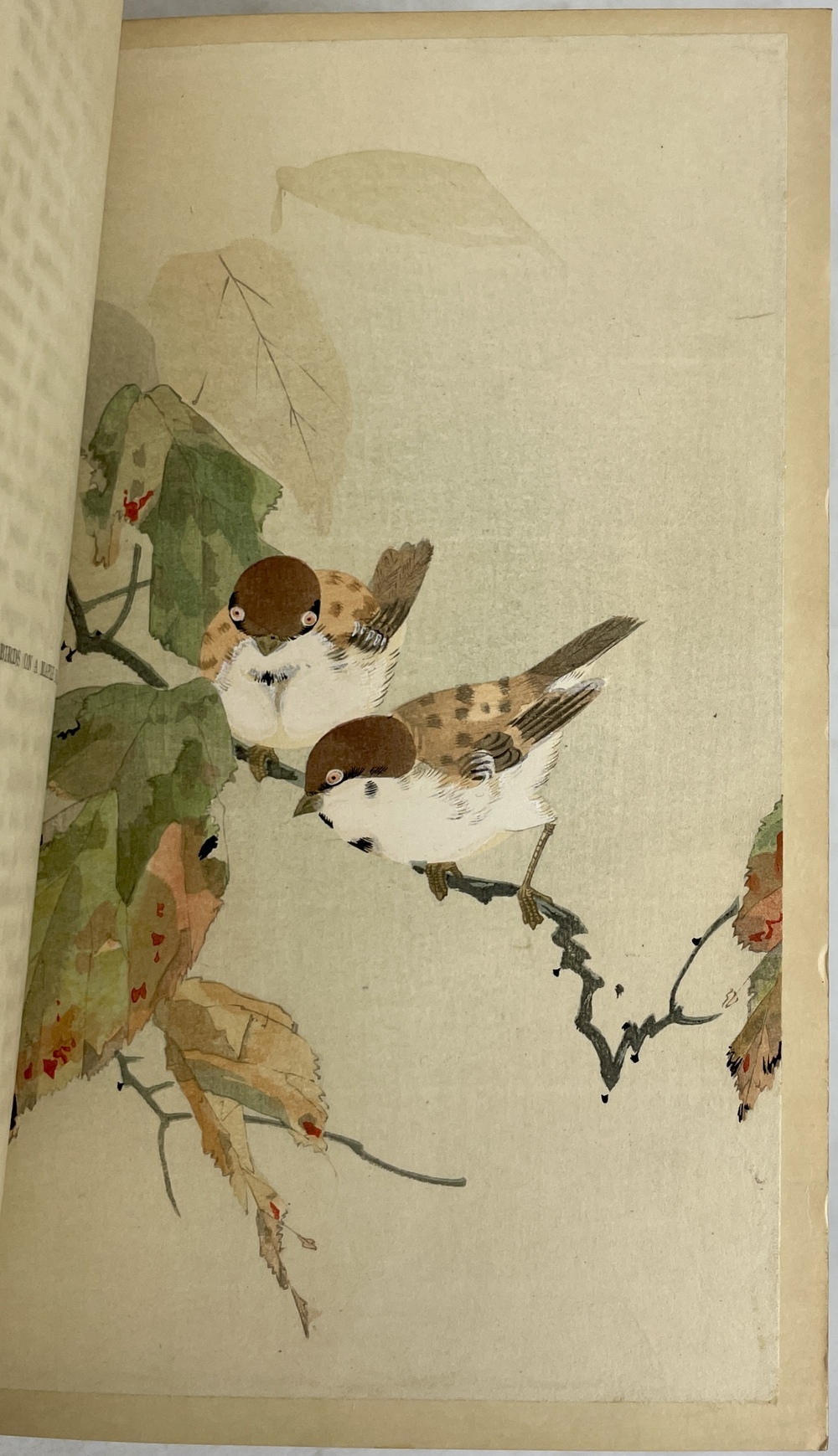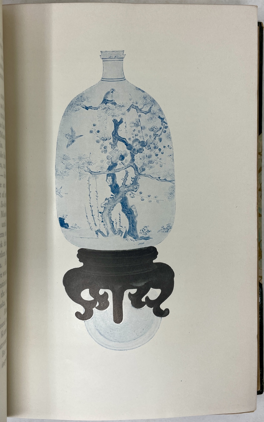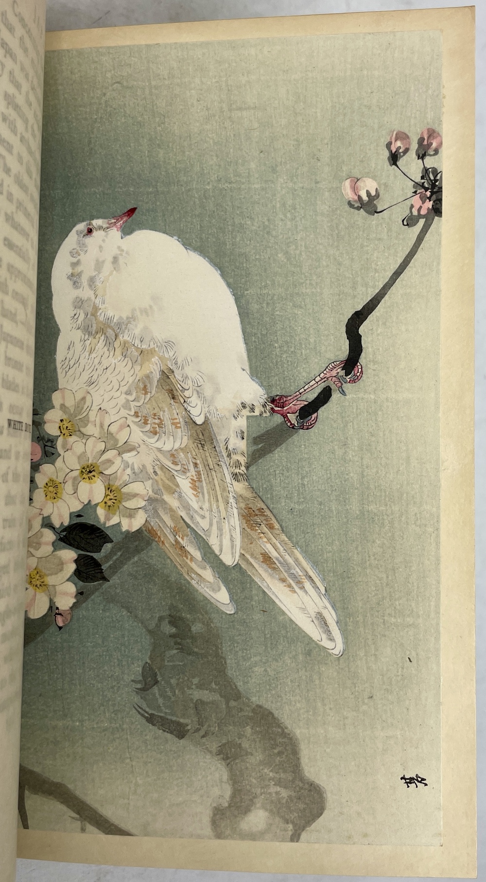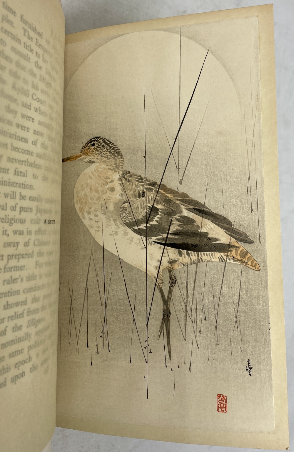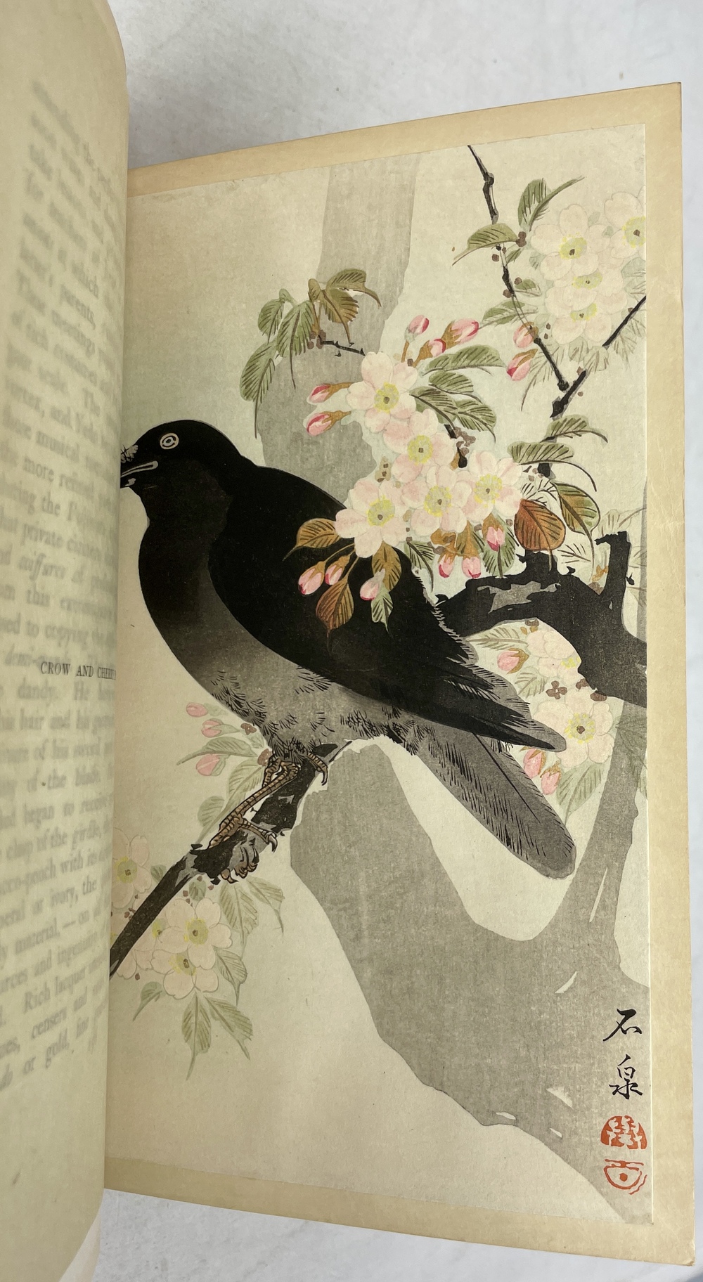 先に述べたように、この作品は前作と同様に膨大な数の特別版が製作されたようで、全ての版を列挙することはほとんど不可能に近いほどの多様な版が存在しています。いずれの版も多くは、500部から1,000部ほどの限定版として刊行されていますが、その中でもほんのごく一部の豪華版が、限定100部以下で製作されており、こうした豪華版は、他の限定版にはない木版画の挿入や、特別な用紙が用いられていたことがわかっています。本書は、まさにこうした豪華版にあたるもので、上述した木版画や彩色絹絵を各巻に収録している点が大きな特徴です。先に上げたブリンクリーによる『日本の芸術論』において、ブリンクリーは既に、木版画作品を一部の豪華版に挿入する試みを行なっており、本書はこれをさらに発展させたものと見ることができます。収録されている作品は、北斎による木版画の複製と、小原古邨ら現代の芸術家による木版画、絹絵で、これらの作品の選択には、ブリンクリーの審美眼とそれをとりまく人的ネットワークが強く反映されているものと考えられます。残念ながら店主の力量では、多くの作品の個別の画家名を特定できていませんが、その収録内容からは、岡倉天心とも深い交流があったと思われるブリンクリーと、フェノロサや同時代の工芸作家、絵師との交流ネットワークを垣間見ることができるのではないかと思われます。
