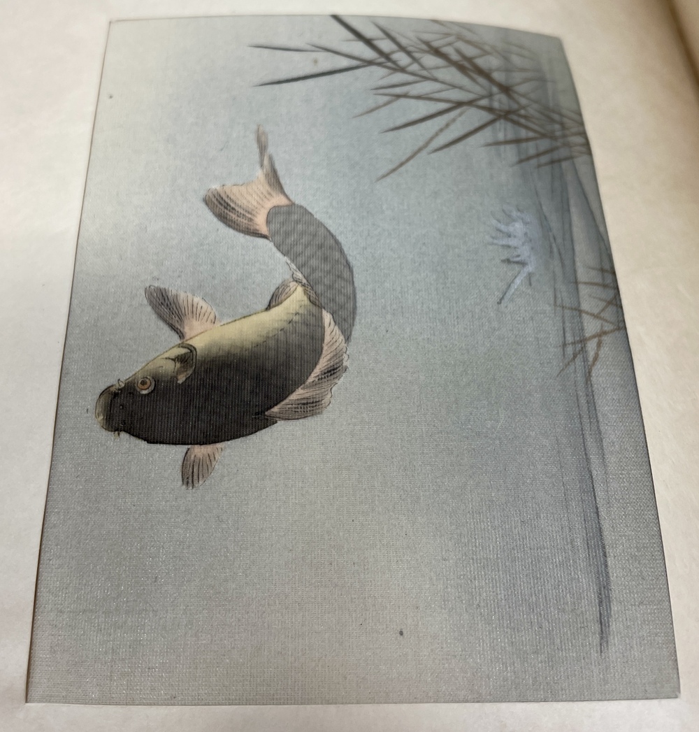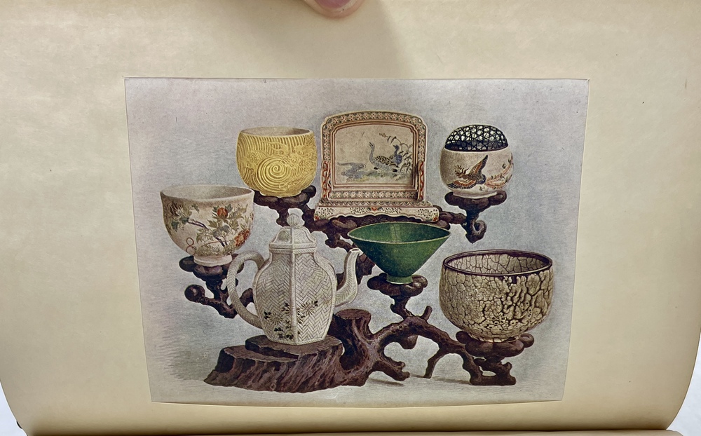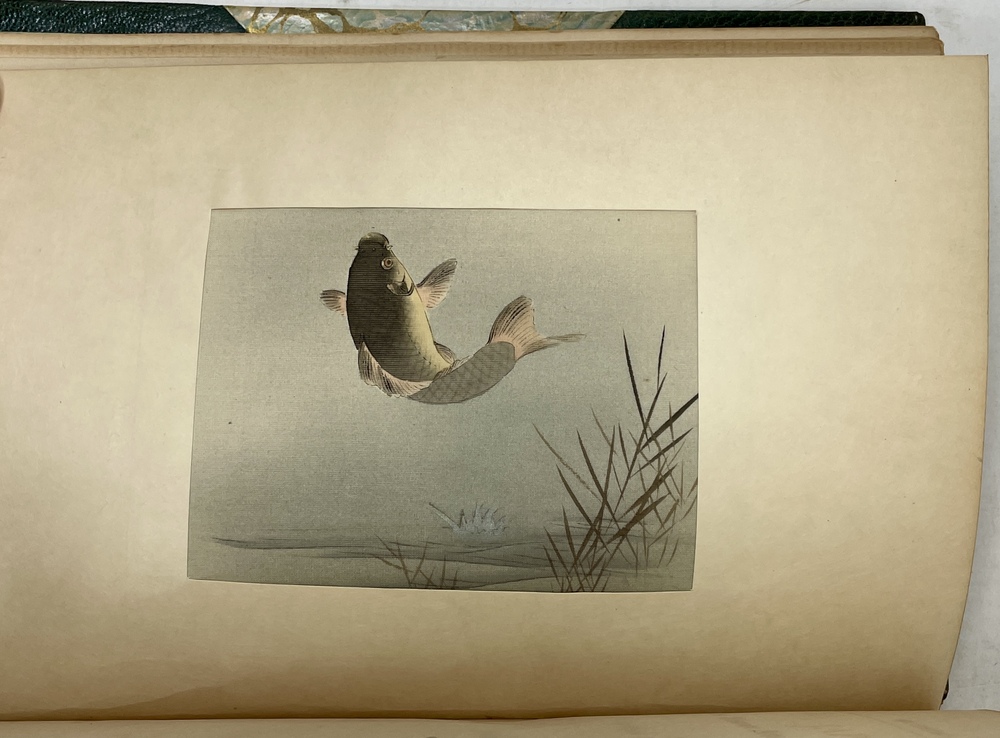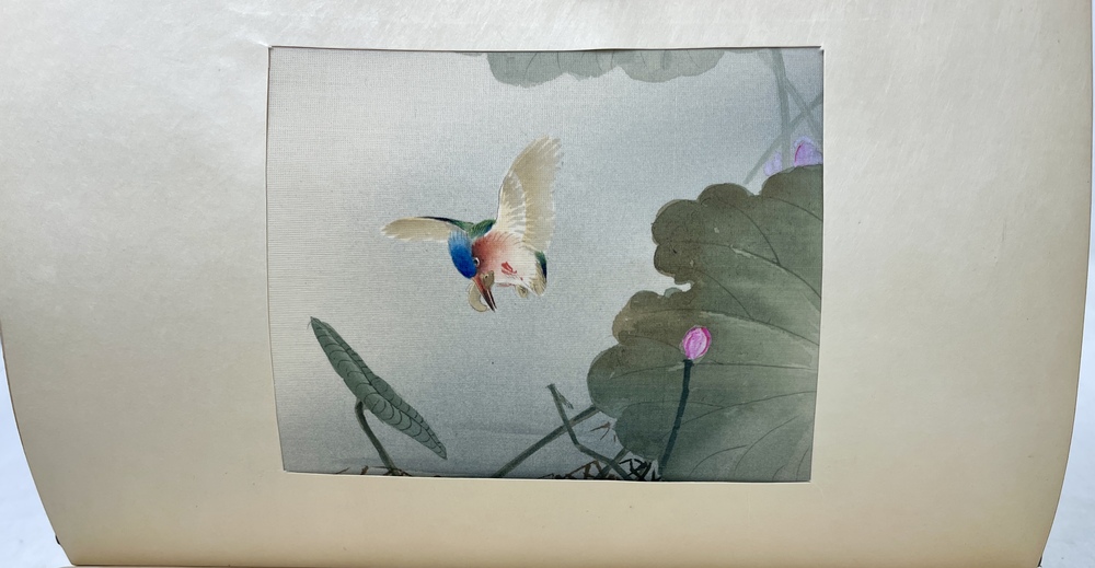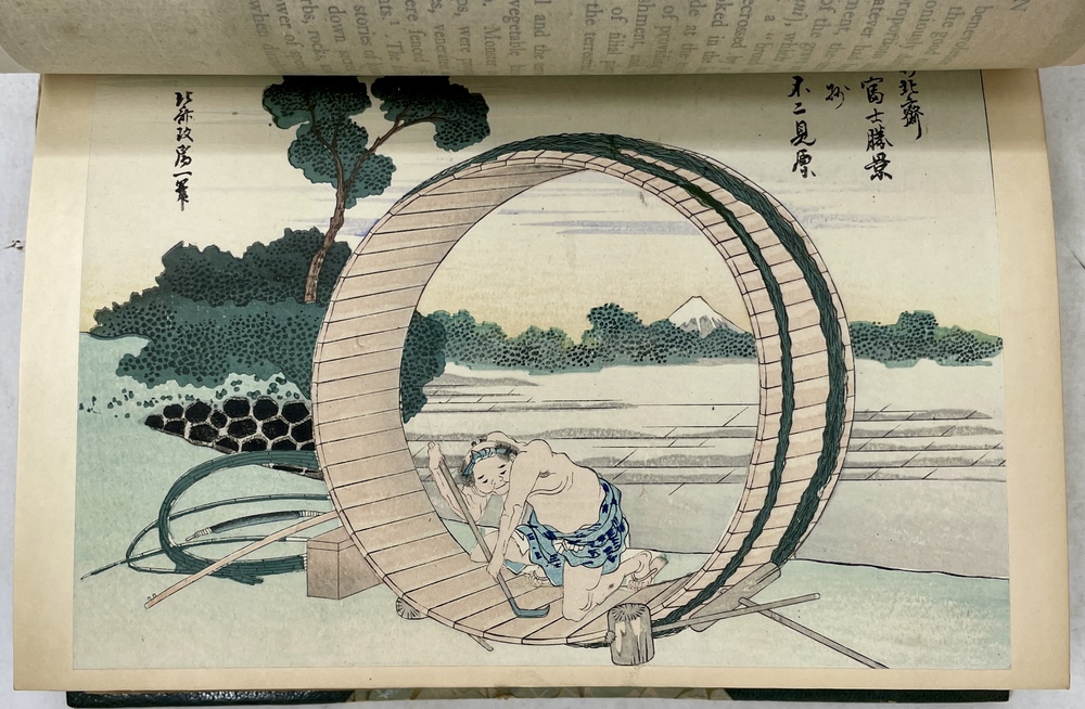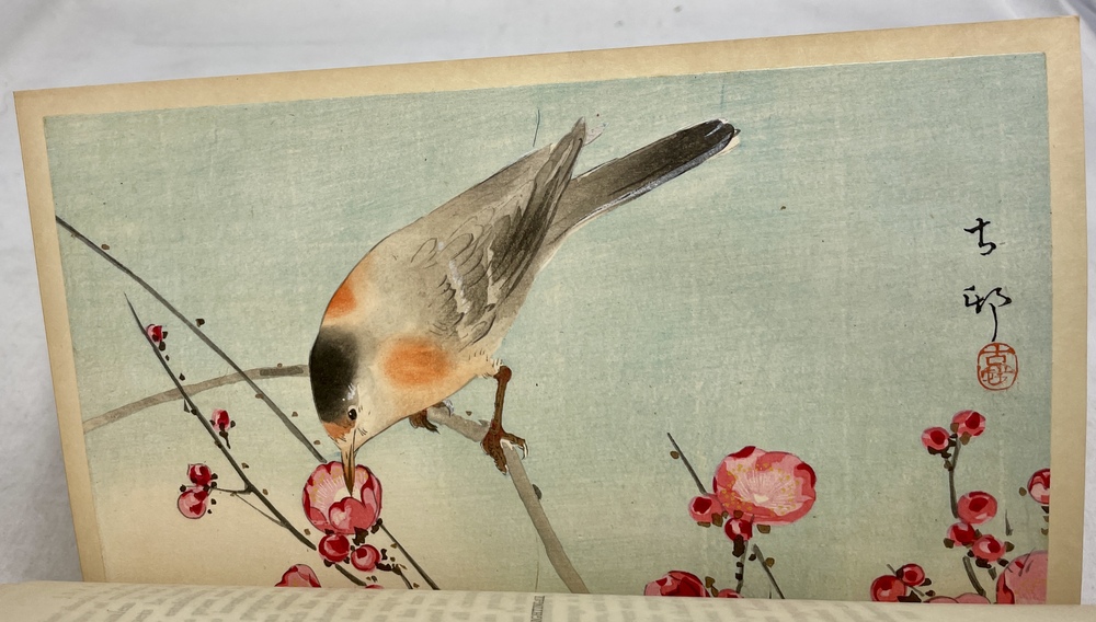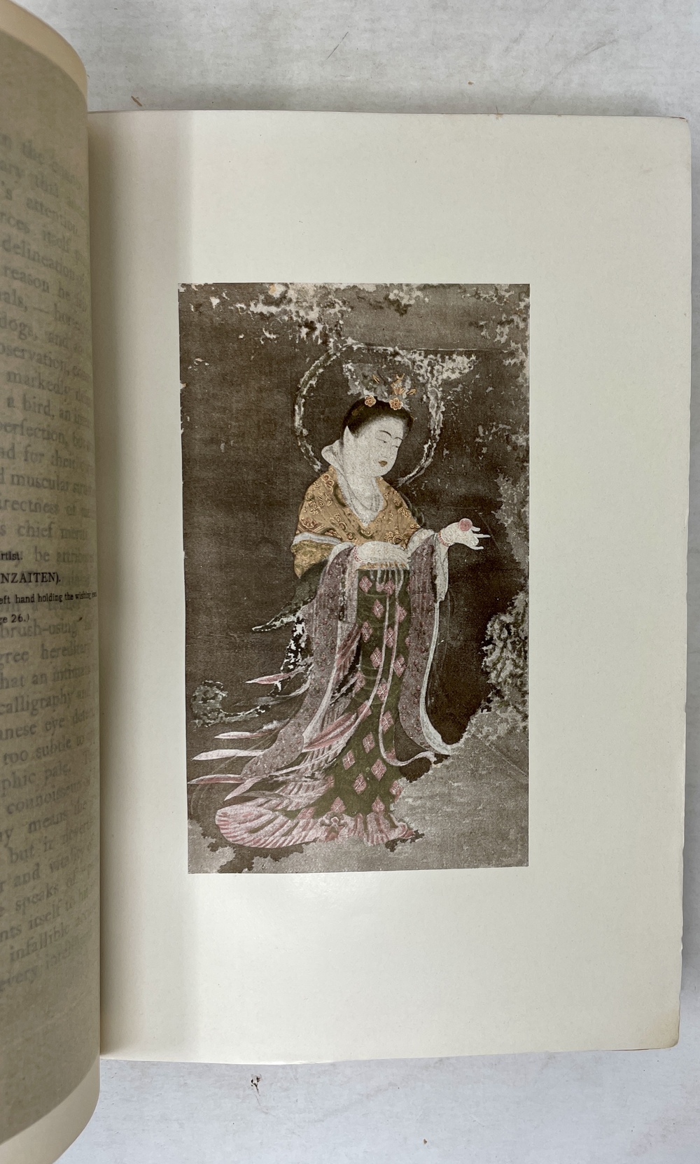 先に述べたように、この作品は前作と同様に膨大な数の特別版が製作されたようで、全ての版を列挙することはほとんど不可能に近いほどの多様な版が存在しています。いずれの版も多くは、500部から1,000部ほどの限定版として刊行されていますが、その中でもほんのごく一部の豪華版が、限定100部以下で製作されており、こうした豪華版は、他の限定版にはない木版画の挿入や、特別な用紙が用いられていたことがわかっています。本書は、まさにこうした豪華版にあたるもので、上述した木版画や彩色絹絵を各巻に収録している点が大きな特徴です。先に上げたブリンクリーによる『日本の芸術論』において、ブリンクリーは既に、木版画作品を一部の豪華版に挿入する試みを行なっており、本書はこれをさらに発展させたものと見ることができます。収録されている作品は、北斎による木版画の複製と、小原古邨ら現代の芸術家による木版画、絹絵で、これらの作品の選択には、ブリンクリーの審美眼とそれをとりまく人的ネットワークが強く反映されているものと考えられます。残念ながら店主の力量では、多くの作品の個別の画家名を特定できていませんが、その収録内容からは、岡倉天心とも深い交流があったと思われるブリンクリーと、フェノロサや同時代の工芸作家、絵師との交流ネットワークを垣間見ることができるのではないかと思われます。