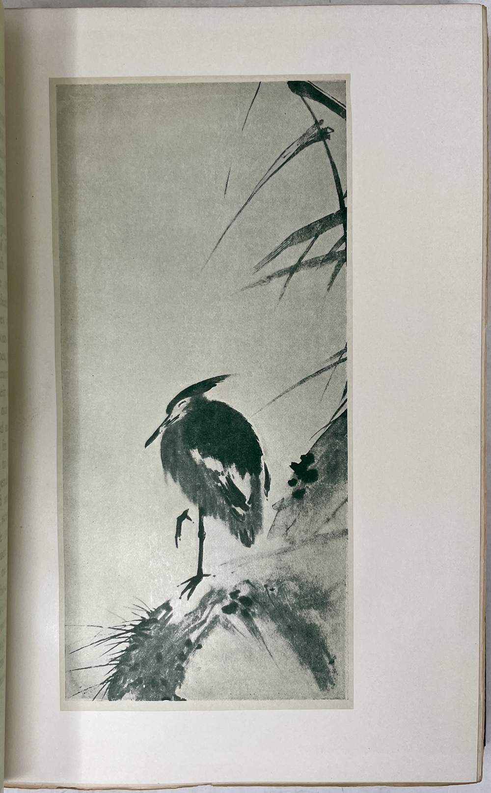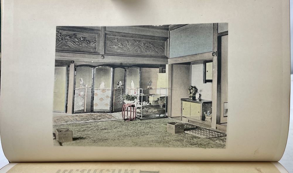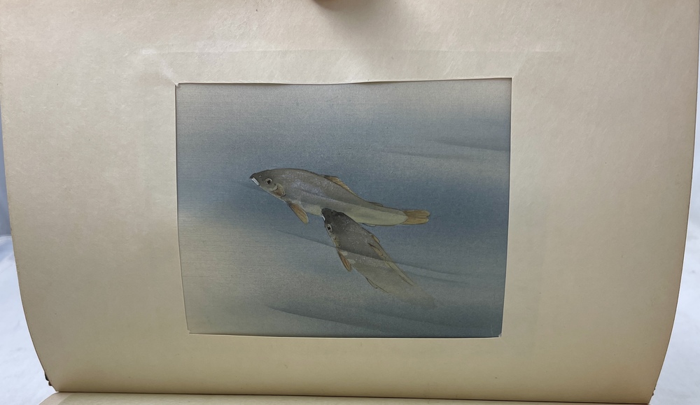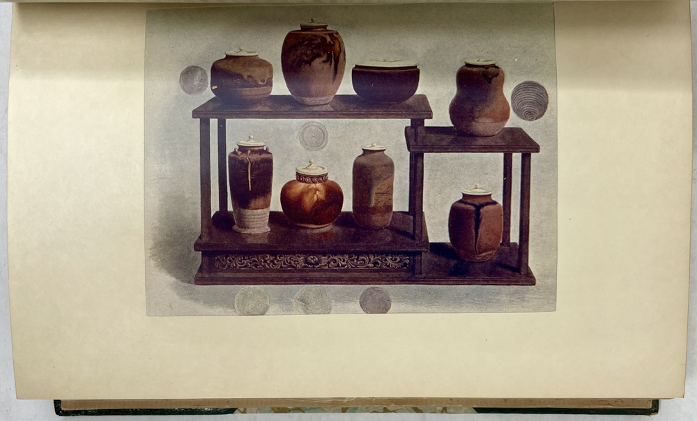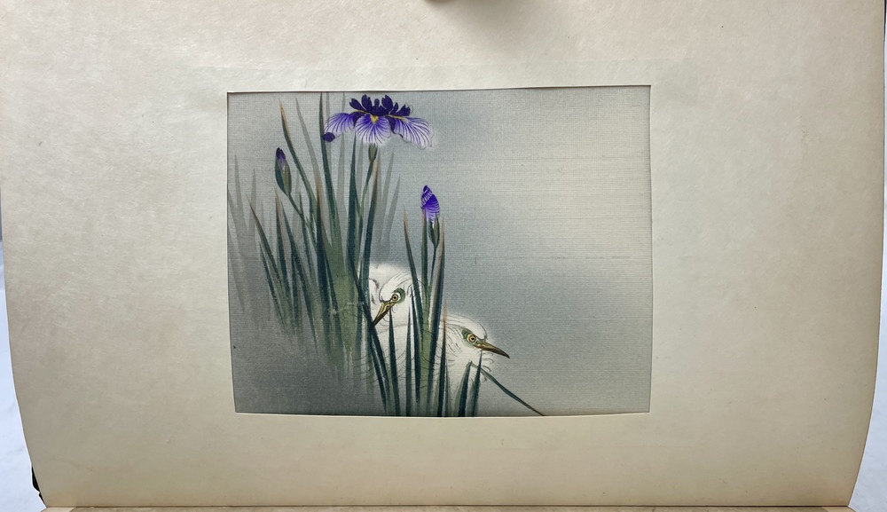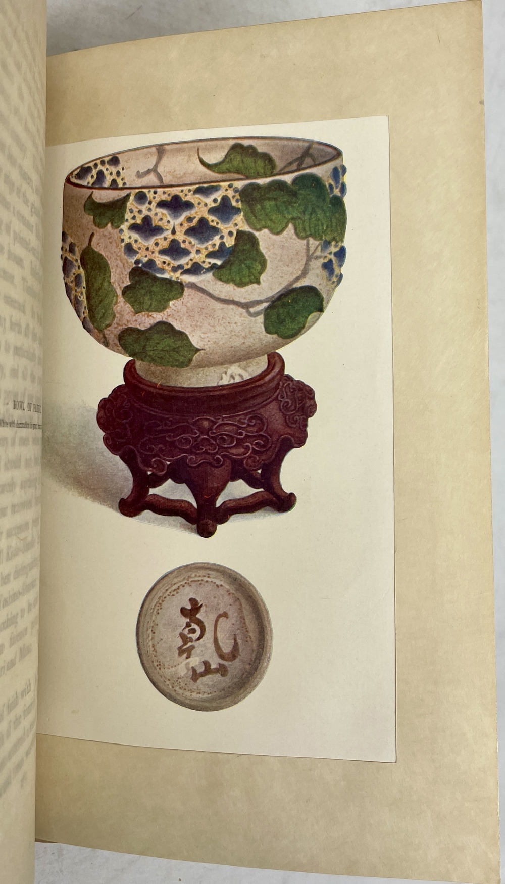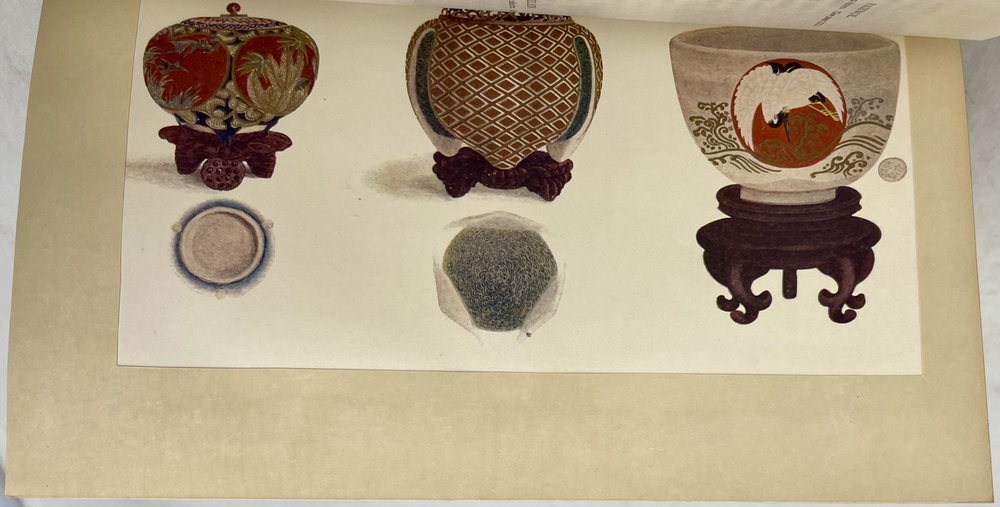 先に述べたように、この作品は前作と同様に膨大な数の特別版が製作されたようで、全ての版を列挙することはほとんど不可能に近いほどの多様な版が存在しています。いずれの版も多くは、500部から1,000部ほどの限定版として刊行されていますが、その中でもほんのごく一部の豪華版が、限定100部以下で製作されており、こうした豪華版は、他の限定版にはない木版画の挿入や、特別な用紙が用いられていたことがわかっています。本書は、まさにこうした豪華版にあたるもので、上述した木版画や彩色絹絵を各巻に収録している点が大きな特徴です。先に上げたブリンクリーによる『日本の芸術論』において、ブリンクリーは既に、木版画作品を一部の豪華版に挿入する試みを行なっており、本書はこれをさらに発展させたものと見ることができます。収録されている作品は、北斎による木版画の複製と、小原古邨ら現代の芸術家による木版画、絹絵で、これらの作品の選択には、ブリンクリーの審美眼とそれをとりまく人的ネットワークが強く反映されているものと考えられます。残念ながら店主の力量では、多くの作品の個別の画家名を特定できていませんが、その収録内容からは、岡倉天心とも深い交流があったと思われるブリンクリーと、フェノロサや同時代の工芸作家、絵師との交流ネットワークを垣間見ることができるのではないかと思われます。