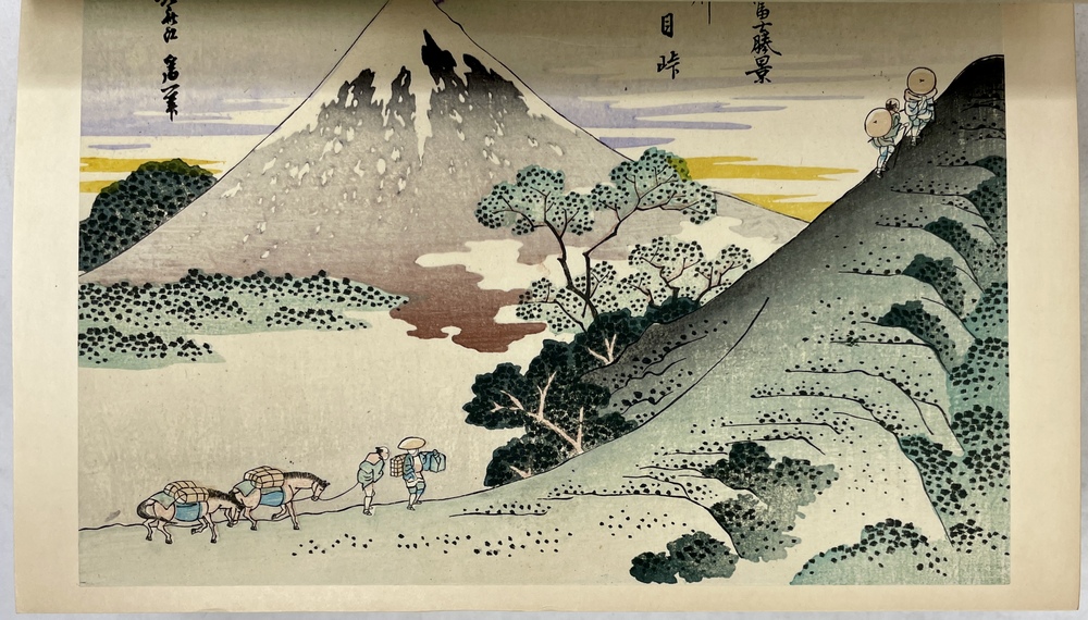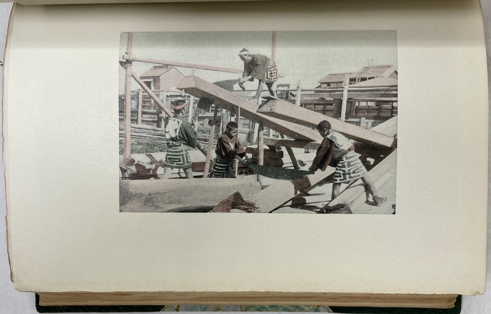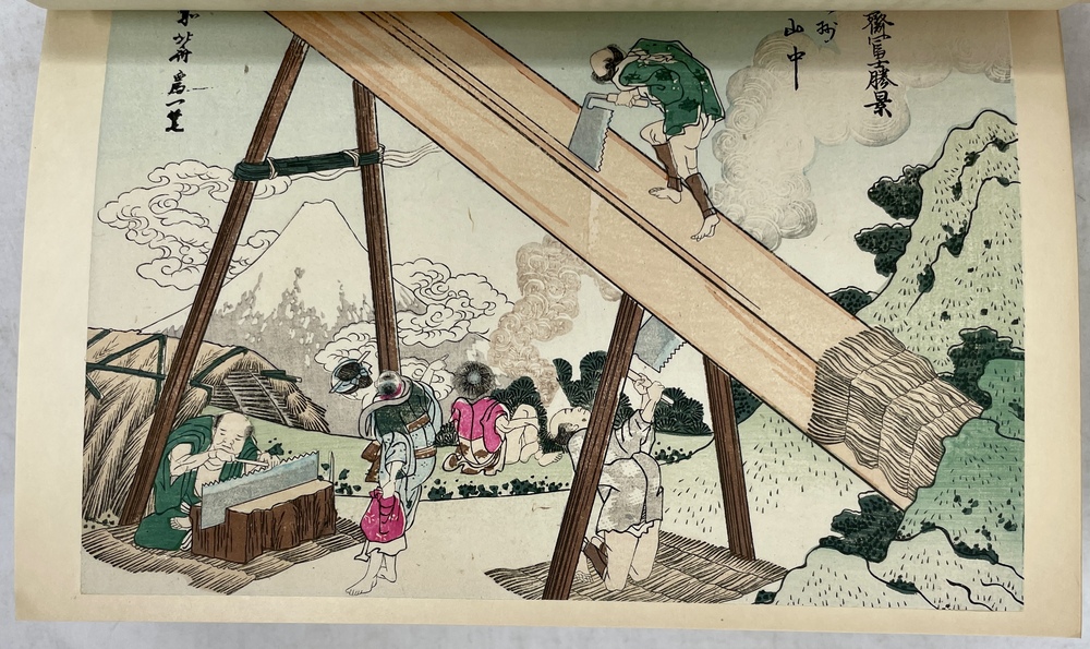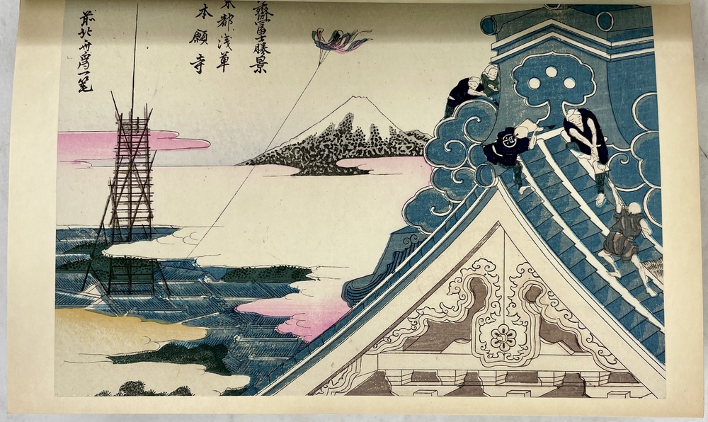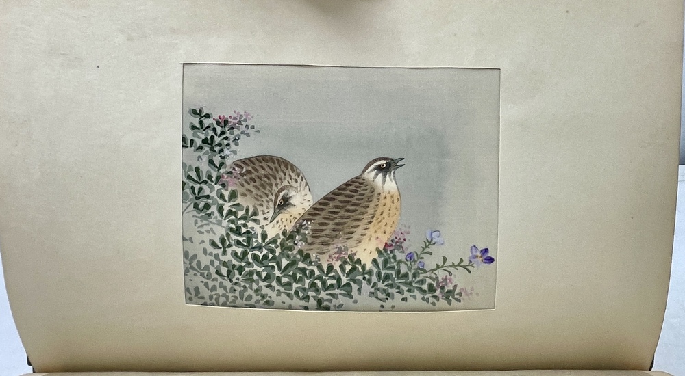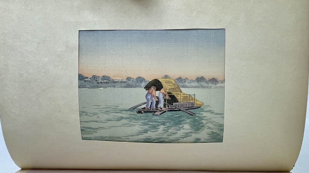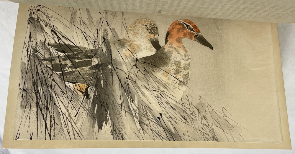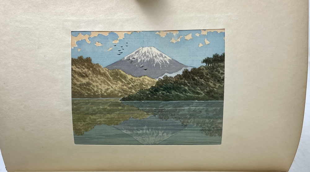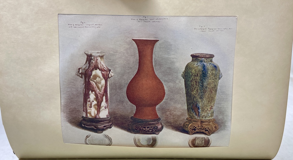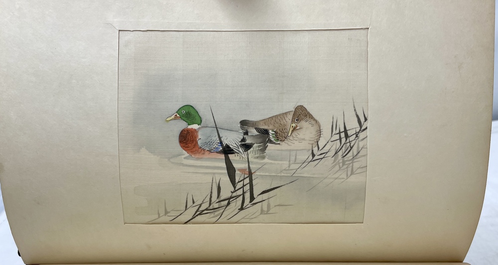 先に述べたように、この作品は前作と同様に膨大な数の特別版が製作されたようで、全ての版を列挙することはほとんど不可能に近いほどの多様な版が存在しています。いずれの版も多くは、500部から1,000部ほどの限定版として刊行されていますが、その中でもほんのごく一部の豪華版が、限定100部以下で製作されており、こうした豪華版は、他の限定版にはない木版画の挿入や、特別な用紙が用いられていたことがわかっています。本書は、まさにこうした豪華版にあたるもので、上述した木版画や彩色絹絵を各巻に収録している点が大きな特徴です。先に上げたブリンクリーによる『日本の芸術論』において、ブリンクリーは既に、木版画作品を一部の豪華版に挿入する試みを行なっており、本書はこれをさらに発展させたものと見ることができます。収録されている作品は、北斎による木版画の複製と、小原古邨ら現代の芸術家による木版画、絹絵で、これらの作品の選択には、ブリンクリーの審美眼とそれをとりまく人的ネットワークが強く反映されているものと考えられます。残念ながら店主の力量では、多くの作品の個別の画家名を特定できていませんが、その収録内容からは、岡倉天心とも深い交流があったと思われるブリンクリーと、フェノロサや同時代の工芸作家、絵師との交流ネットワークを垣間見ることができるのではないかと思われます。