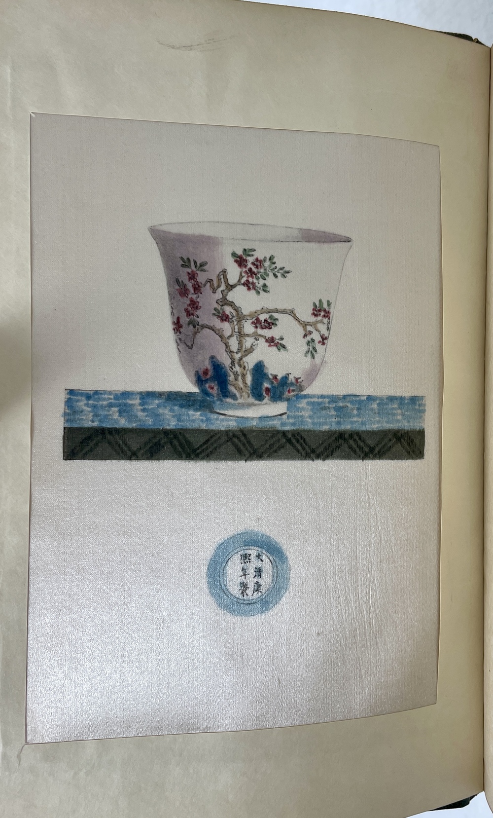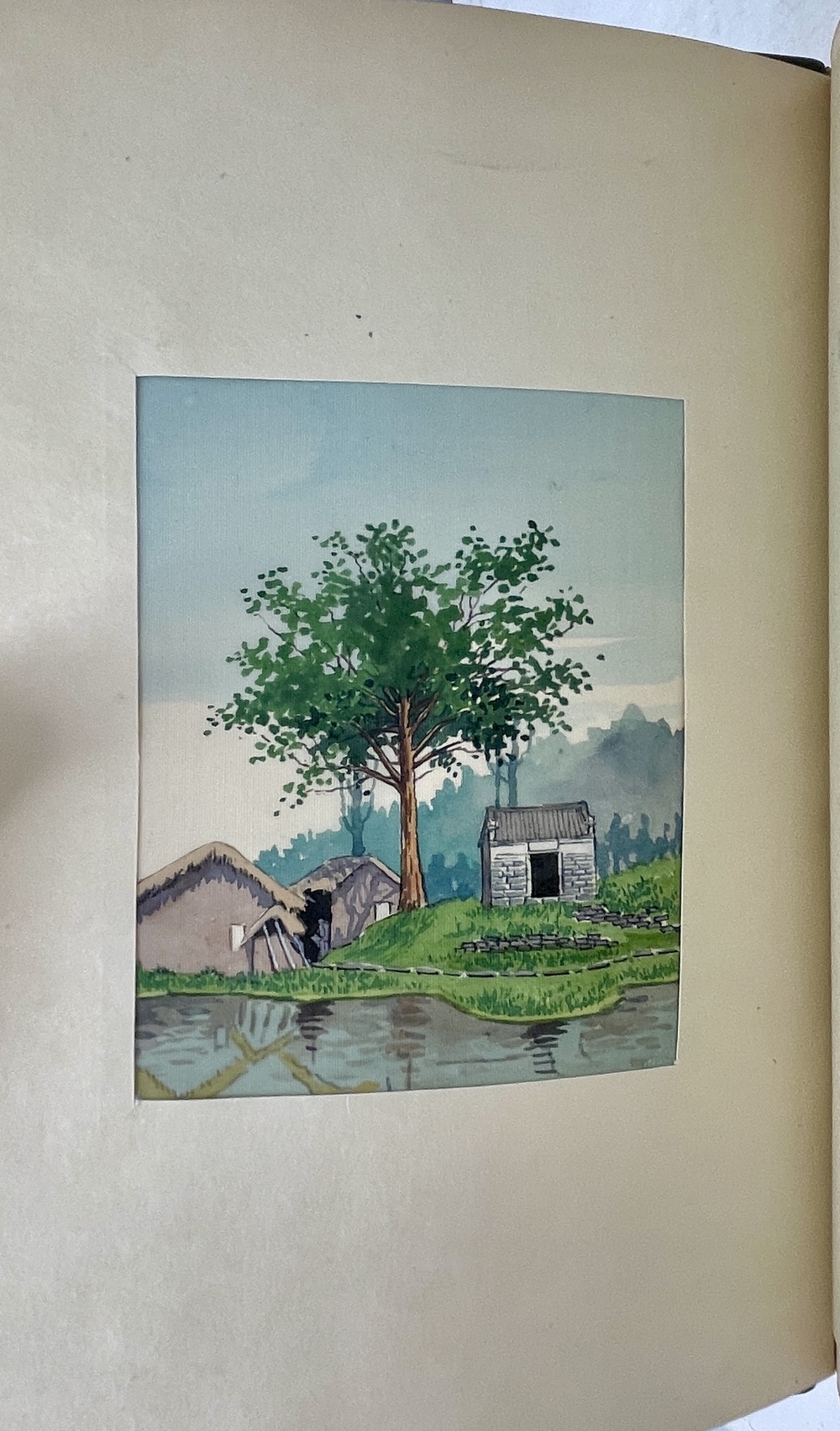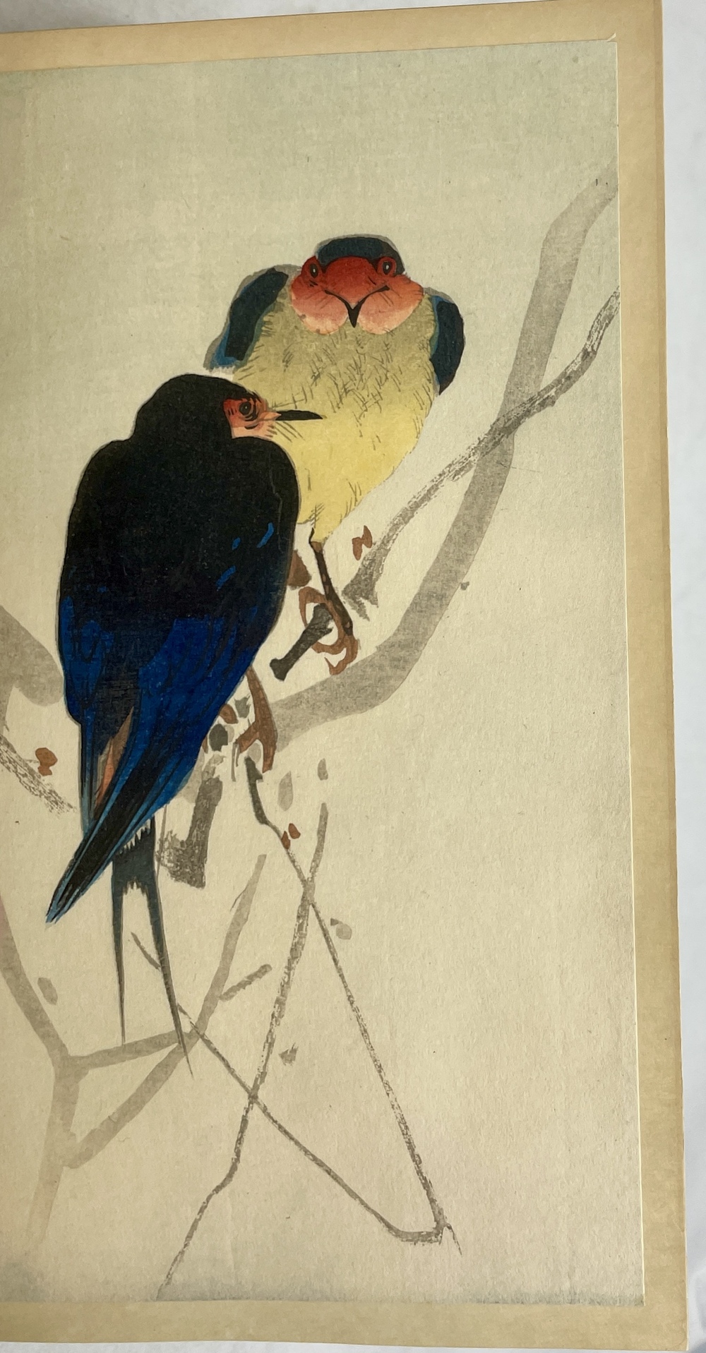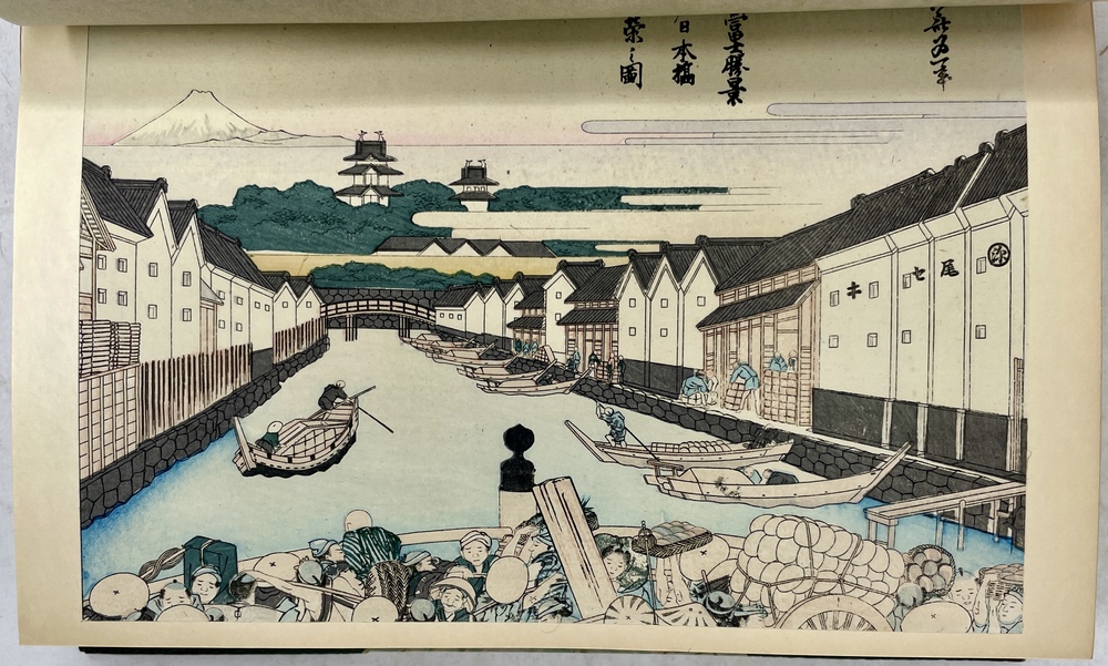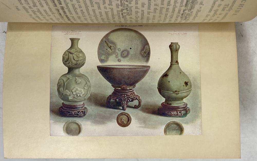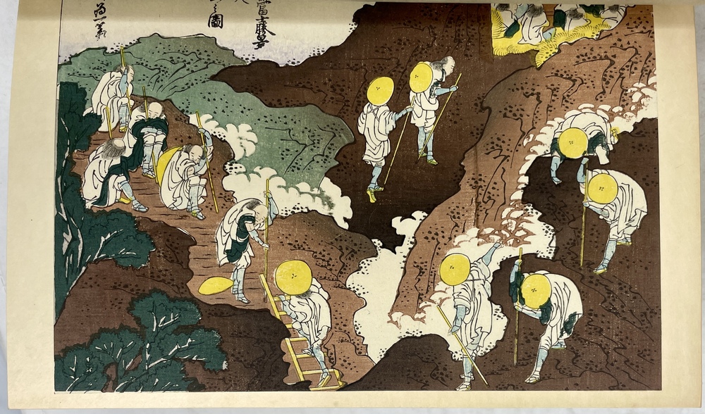 先に述べたように、この作品は前作と同様に膨大な数の特別版が製作されたようで、全ての版を列挙することはほとんど不可能に近いほどの多様な版が存在しています。いずれの版も多くは、500部から1,000部ほどの限定版として刊行されていますが、その中でもほんのごく一部の豪華版が、限定100部以下で製作されており、こうした豪華版は、他の限定版にはない木版画の挿入や、特別な用紙が用いられていたことがわかっています。本書は、まさにこうした豪華版にあたるもので、上述した木版画や彩色絹絵を各巻に収録している点が大きな特徴です。先に上げたブリンクリーによる『日本の芸術論』において、ブリンクリーは既に、木版画作品を一部の豪華版に挿入する試みを行なっており、本書はこれをさらに発展させたものと見ることができます。収録されている作品は、北斎による木版画の複製と、小原古邨ら現代の芸術家による木版画、絹絵で、これらの作品の選択には、ブリンクリーの審美眼とそれをとりまく人的ネットワークが強く反映されているものと考えられます。残念ながら店主の力量では、多くの作品の個別の画家名を特定できていませんが、その収録内容からは、岡倉天心とも深い交流があったと思われるブリンクリーと、フェノロサや同時代の工芸作家、絵師との交流ネットワークを垣間見ることができるのではないかと思われます。