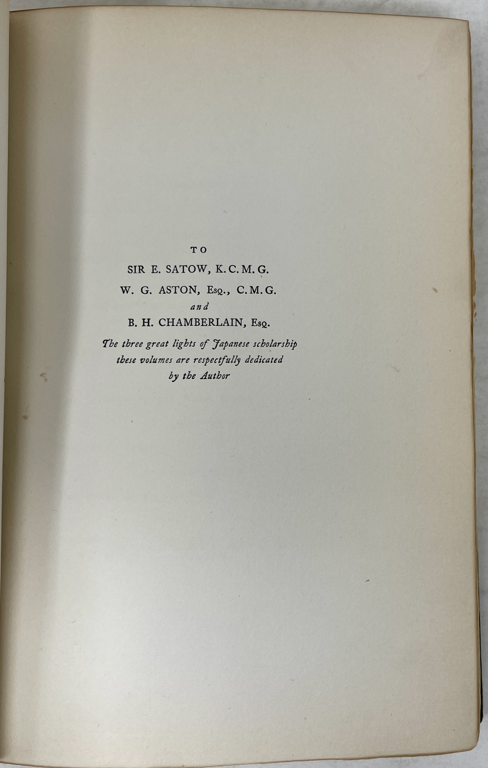 ブリンクリーは1867年にイギリス海軍の軍人として来日し、西洋近代海軍砲術の御雇外国人教師として活躍する傍ら、日本語習得にも精力的に励み、英和辞書や英語文法書なども執筆しました。1881年には、横浜で刊行されていた英字新聞『メイル(Japan Mail)』を買収し、経営者になるとともに、自らが主筆に就任して、時事問題を扱う記事だけでなく、文化、歴史、芸術に関する文芸記事を数多く執筆し、日本の文化的魅力を英語圏の読者に向けて発信する活動を積極的に行っています。明治政府からの信任も厚く、講読料の名目で資金援助を受けていたことが知られていますが、親日的態度を基本としながらも、客観的立場からの誌面構成を心がけ、読者からの支持も高かったと言われています(ジャーナリストとしてのブリンクリーの活動については、秋山勇造『明治のジャーナリズム精神:幕末・明治の新聞事情』五月書房、2002年を参照)。また、日本をはじめとした東アジアの芸術にも強い関心があったようで、東洋の美術、芸術作品のコレクションを自ら構築するだけでなく、同時代の作家や学者らとの交流も深かったようです。そのことを裏付けるように、本書は、サトウ(Ernest Satow, 1843 - 1929)、アストン(William George Aston, 1841 - 1911)、チェンバレン(Arthur Neville Chamberlain, (Arthur Neville Chamberlain, 1869 - 1940)という明治を代表する日本学者らに捧げられており、ブリンクリーの交友の広さと見識がうかがえます。