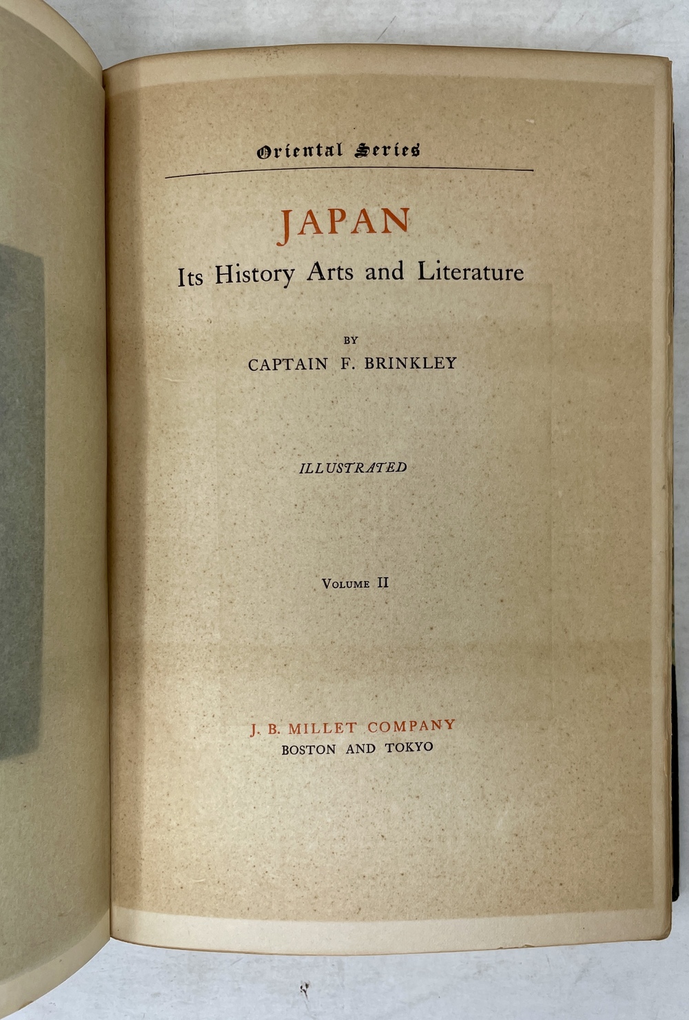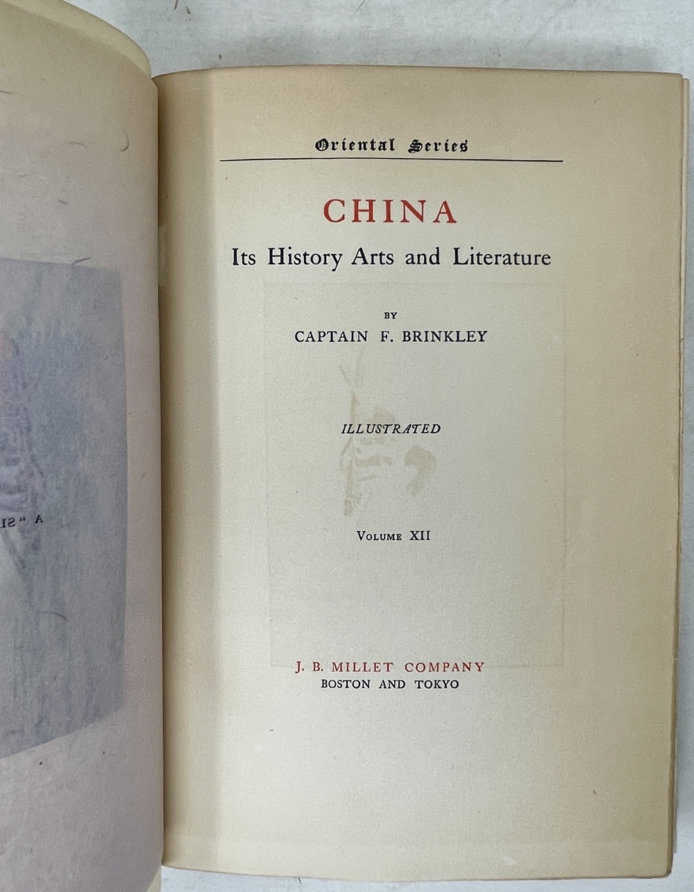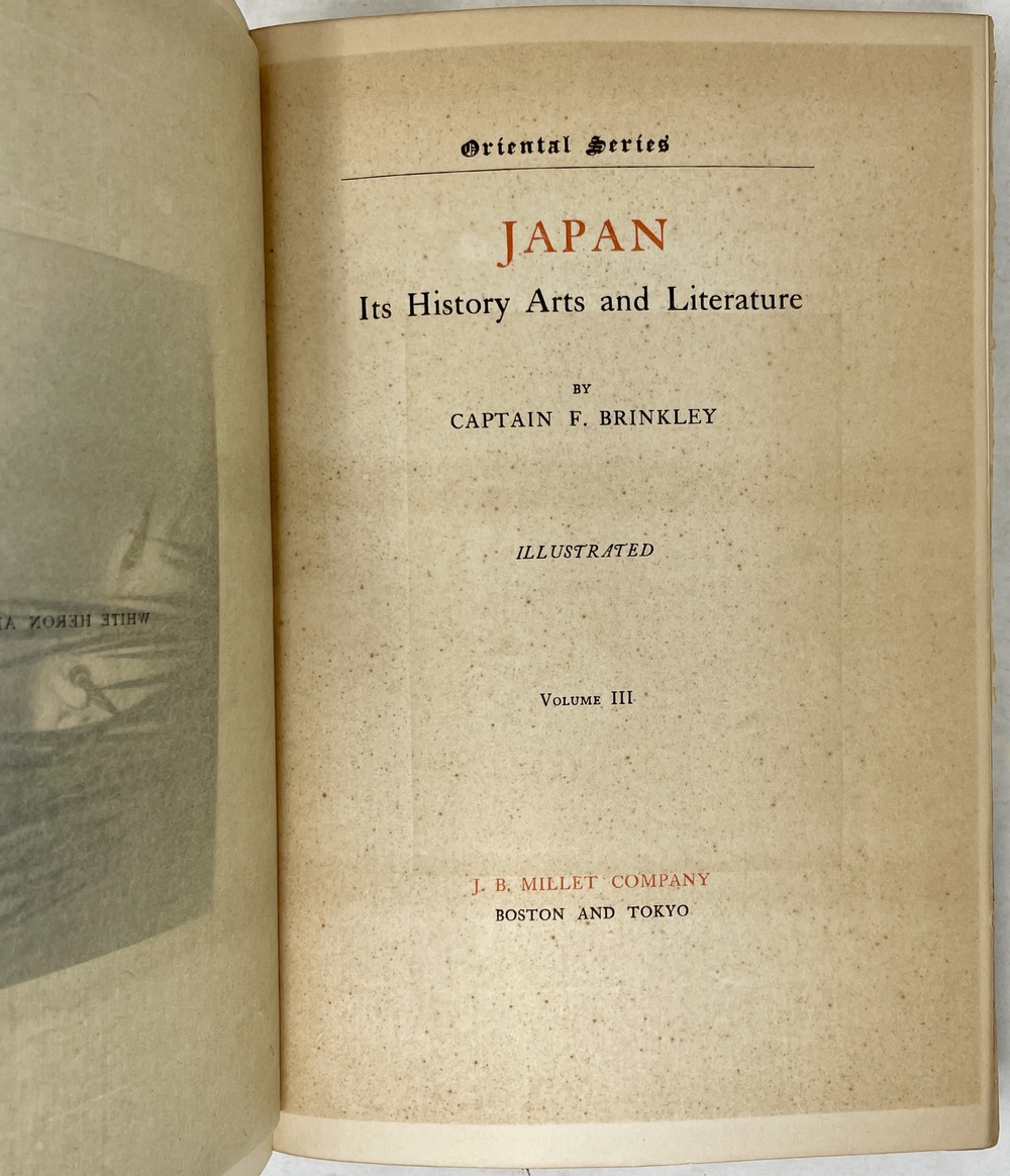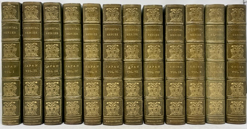 本書は、幕末に来日してから一多方面に渡って活躍したイギリス人ブリンクリー(Francis Brinkley, 1841 - 1912)が編集した日本と中国の歴史、文化、政治、芸術について包括的に論じられた作品で、第1巻から第8巻までが日本に、第9巻から第12巻までが中国に当てられた全12巻で構成されています。本書は、特別な構成や造本を採用したわずか限定100部のみが刊行された豪華限定版で、非常に美しい口絵や多数の写真や図版、さらには木版画までも収録している大変魅力的な作品です。