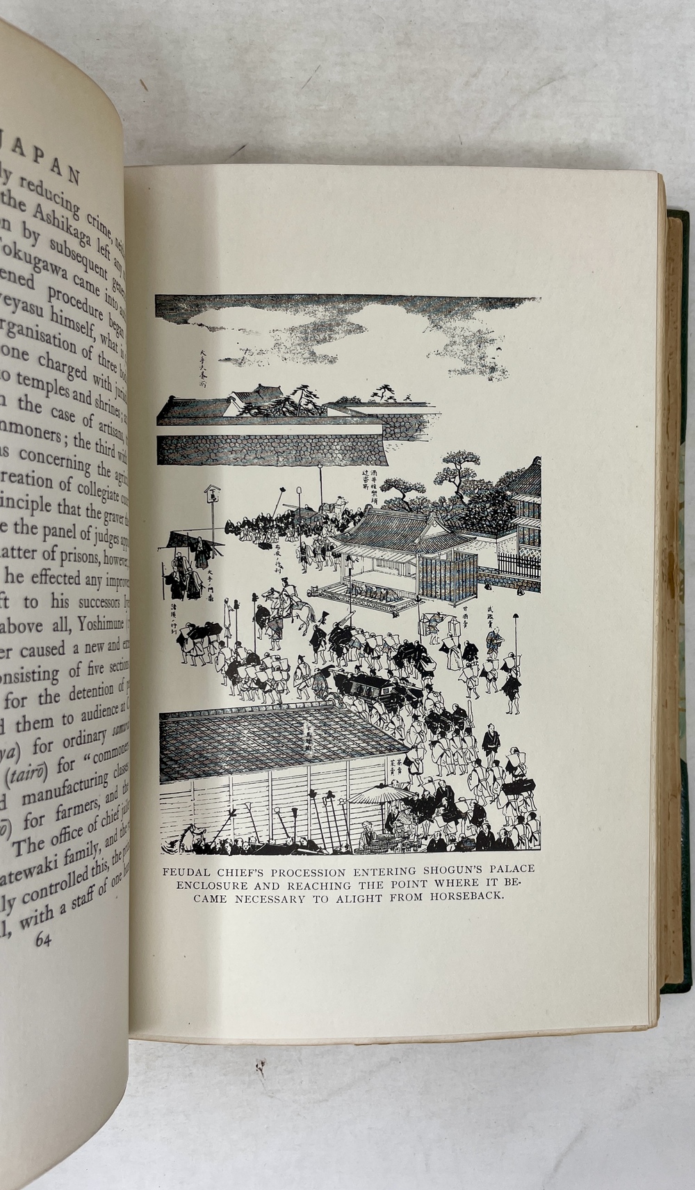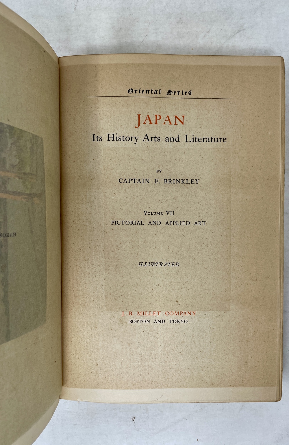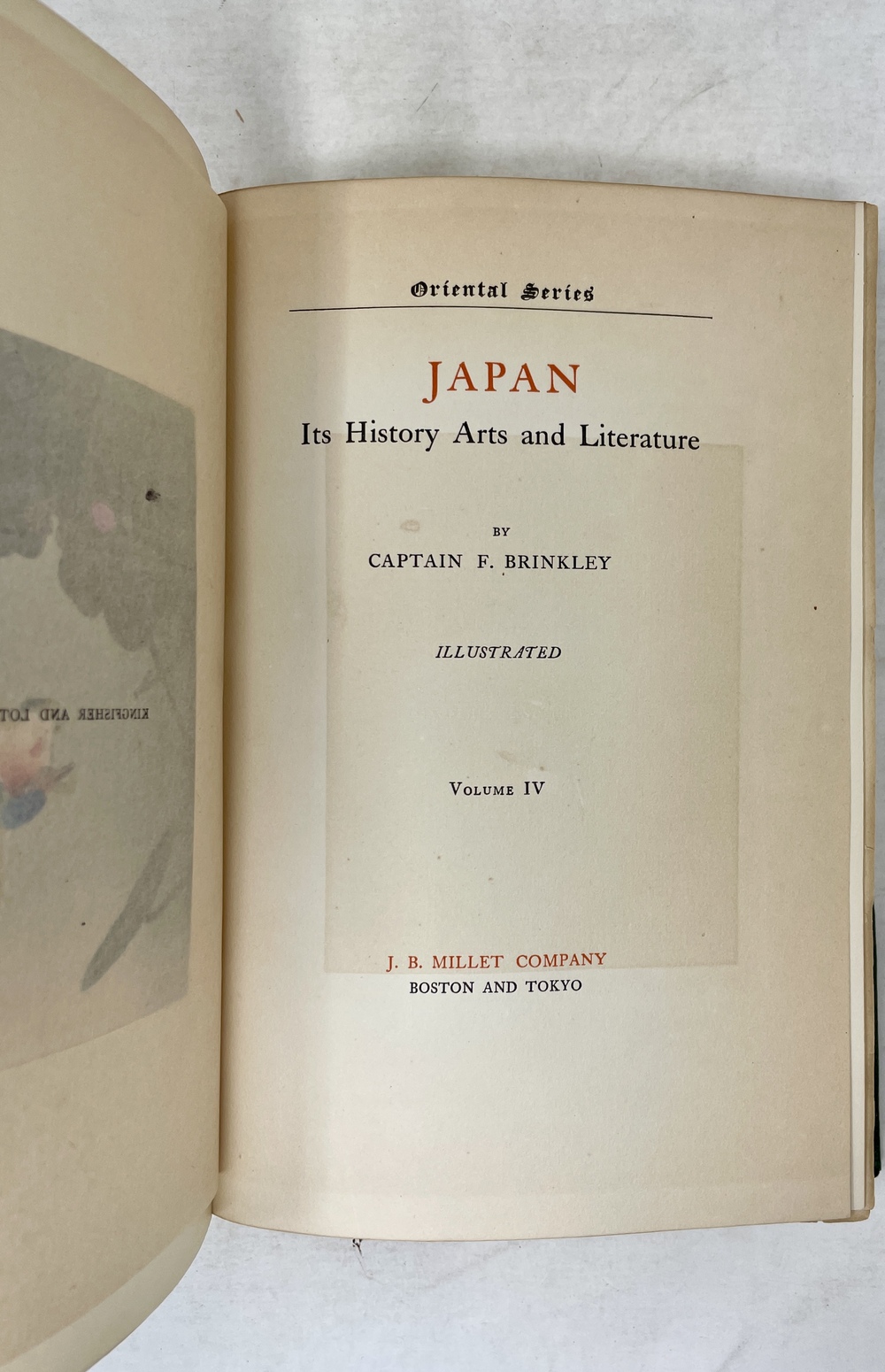 本書は、幕末に来日してから一多方面に渡って活躍したイギリス人ブリンクリー(Francis Brinkley, 1841 - 1912)が編集した日本と中国の歴史、文化、政治、芸術について包括的に論じられた作品で、第1巻から第8巻までが日本に、第9巻から第12巻までが中国に当てられた全12巻で構成されています。本書は、特別な構成や造本を採用したわずか限定100部のみが刊行された豪華限定版で、非常に美しい口絵や多数の写真や図版、さらには木版画までも収録している大変魅力的な作品です。