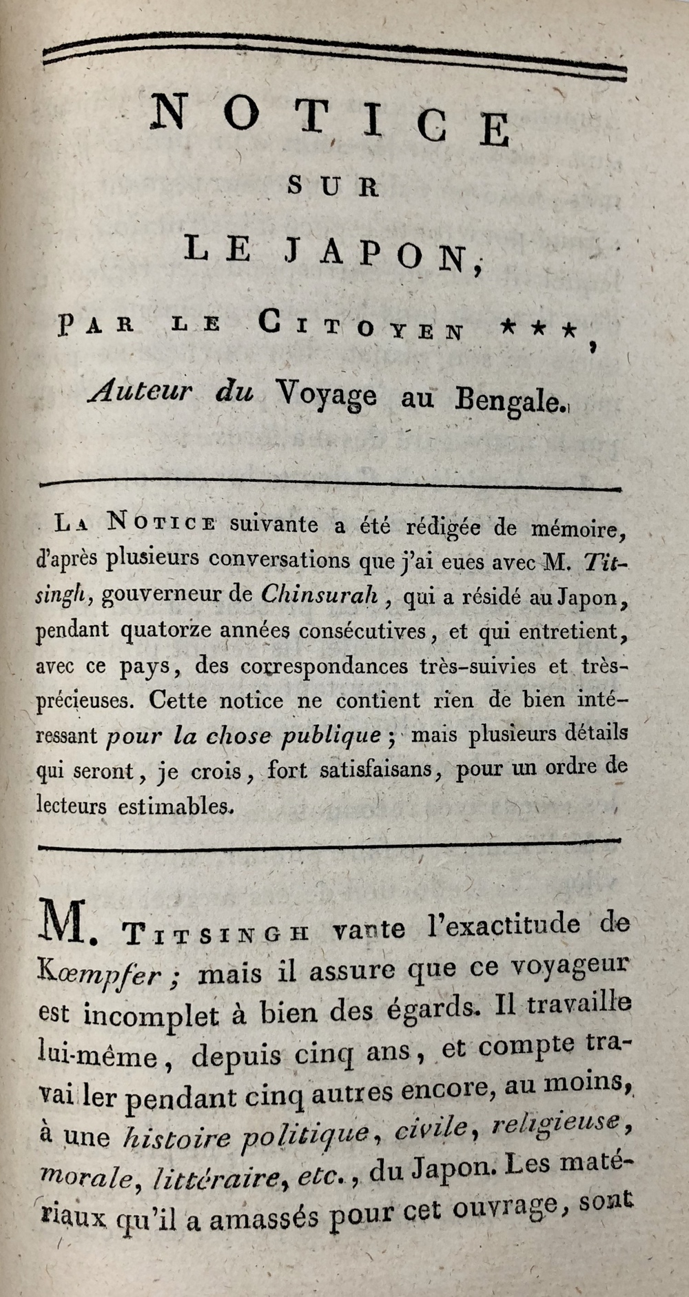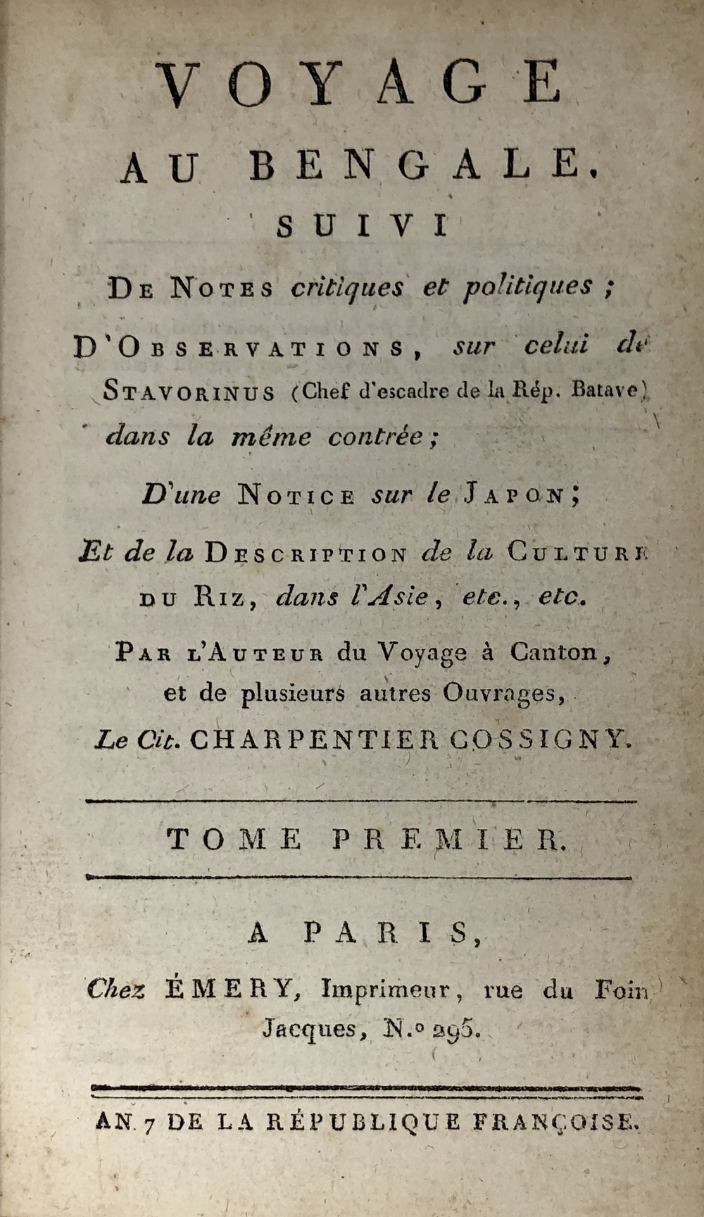 VOYAGE AU BENGALE. SUIVI DE NOTES critiques et politiques ; D'OBSERVATIONS, sur celui de STAVORINUS...dans la même contrée; D'une Notice sur le JAPON; Et de la DESCRIPTION de la CULTURE DU RIZ, dans l'Asie, etc., etc.