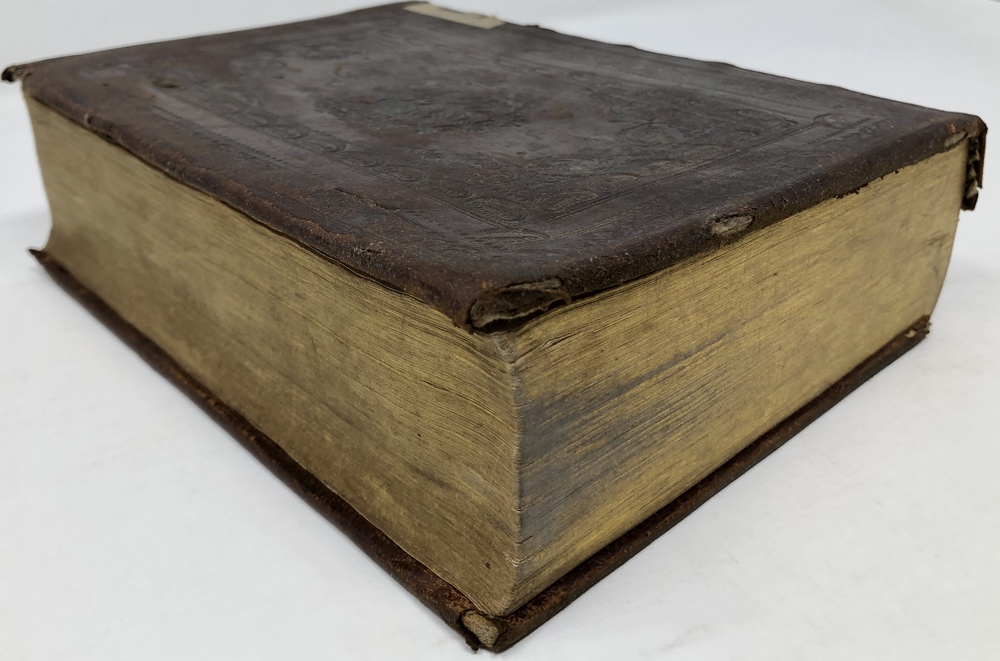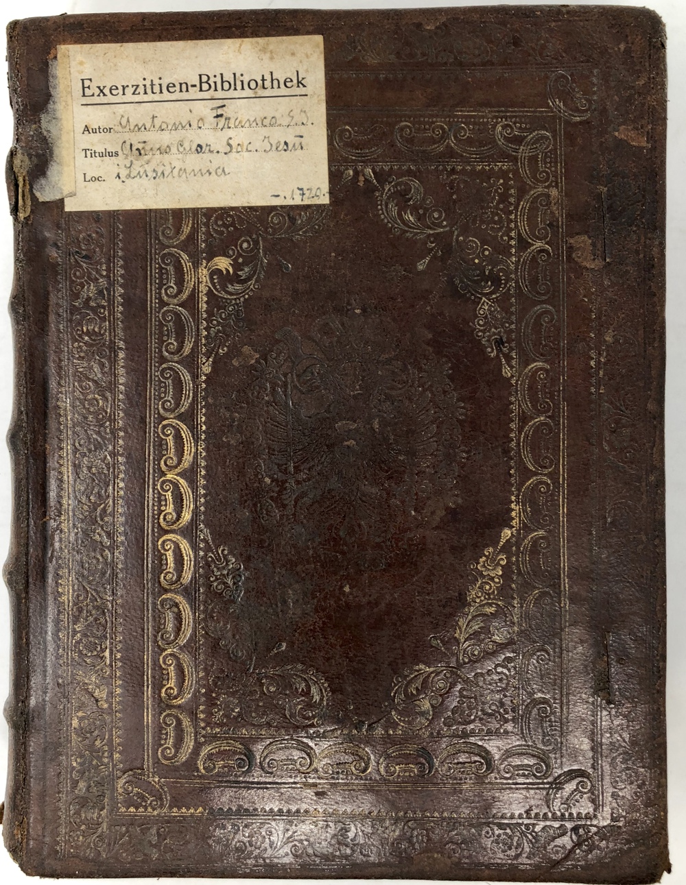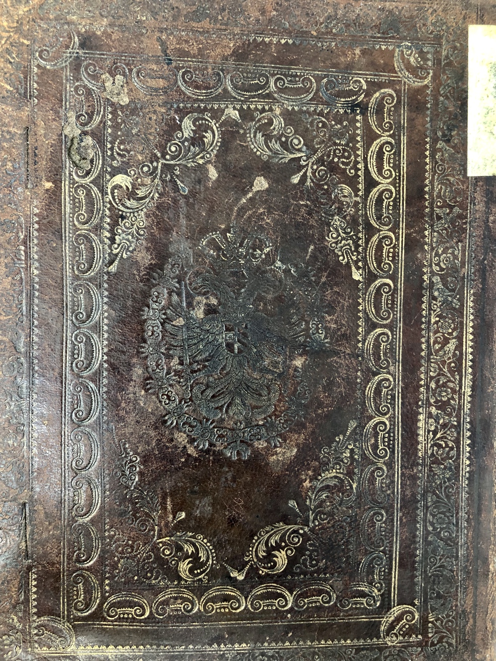 革装丁の両面にハプスブルク家の紋章を形どった思われる双頭の鷲の箔押装飾、三方金。装飾金箔の一部に退色、旧蔵機関によるラベル貼付、革装丁の角、背上部と下部の革の一部に痛み、欠落あり。