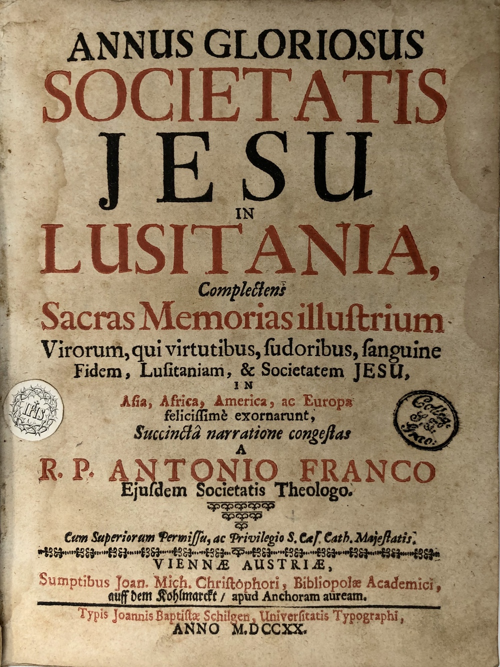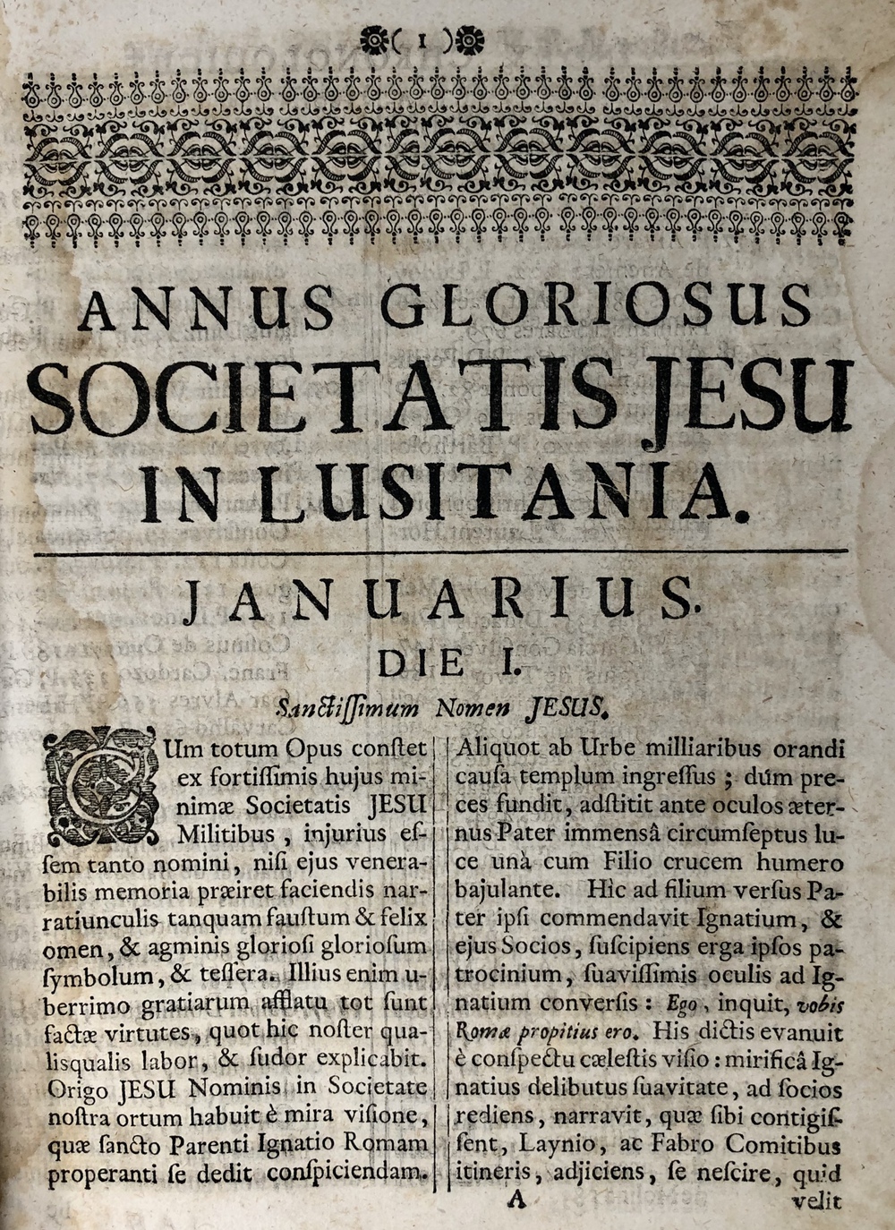 ANNUS GLORIOSUS SOCIETATIS JESU IN LUSITANIA, Complectens Sacras Memorias illustrium Virorum, qui virtutibus, sudoribus, sanguine Fidem, Lusitaniam, & Societatem JESU, IN Asia, Africa, America, ac Europa...