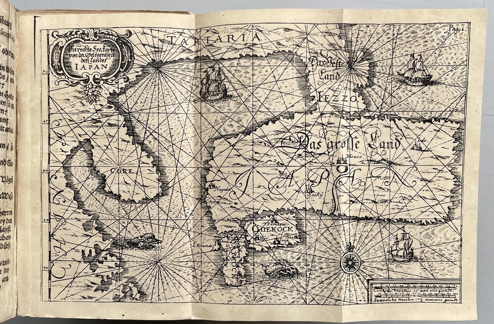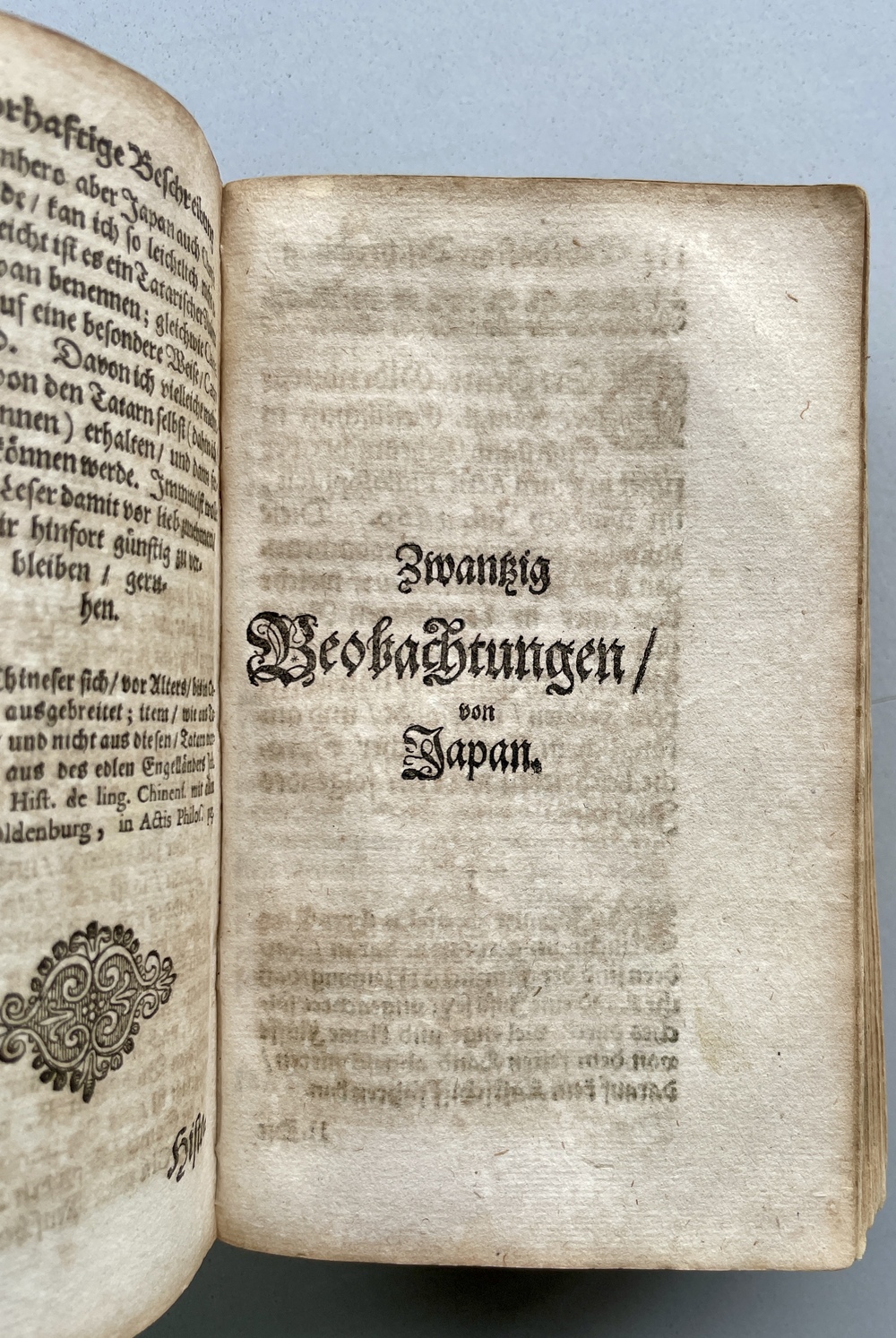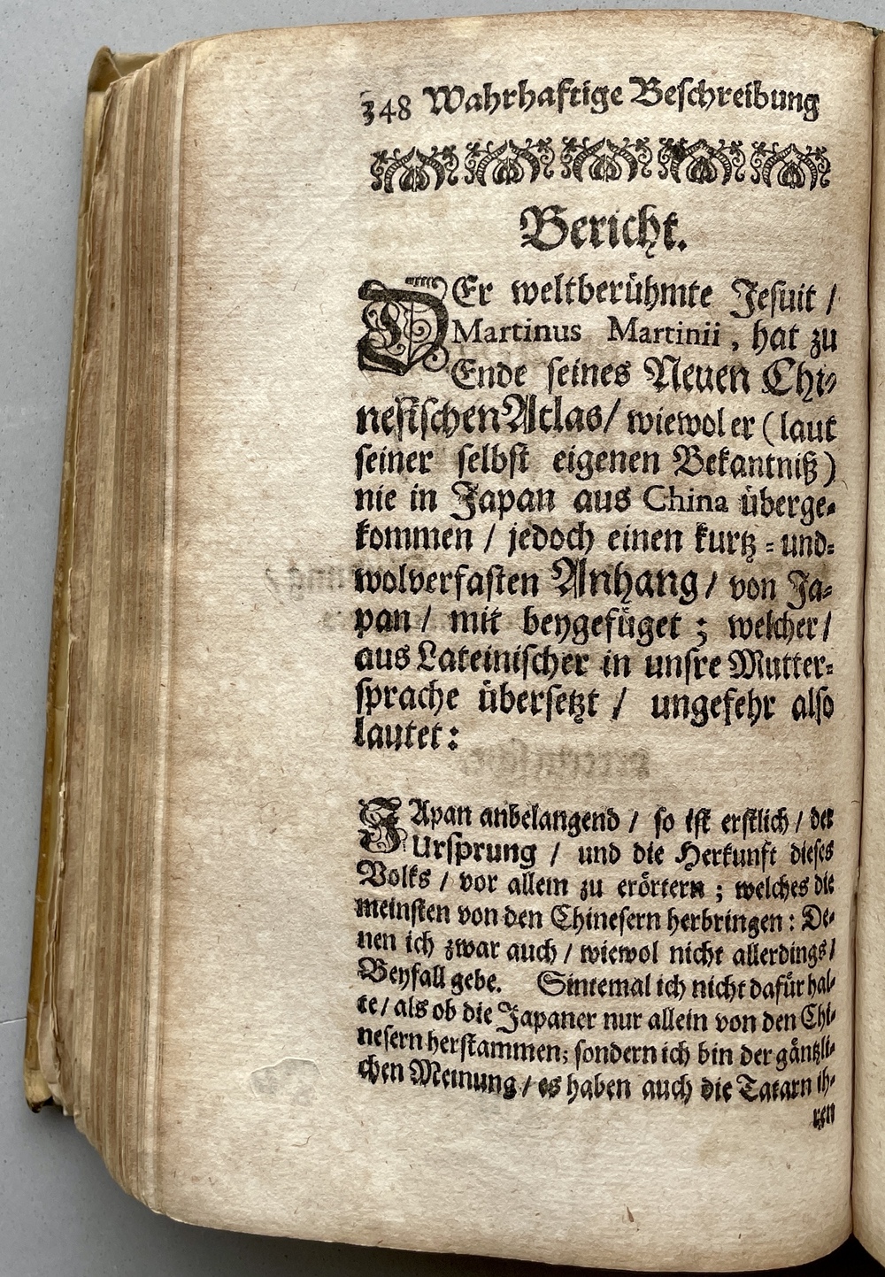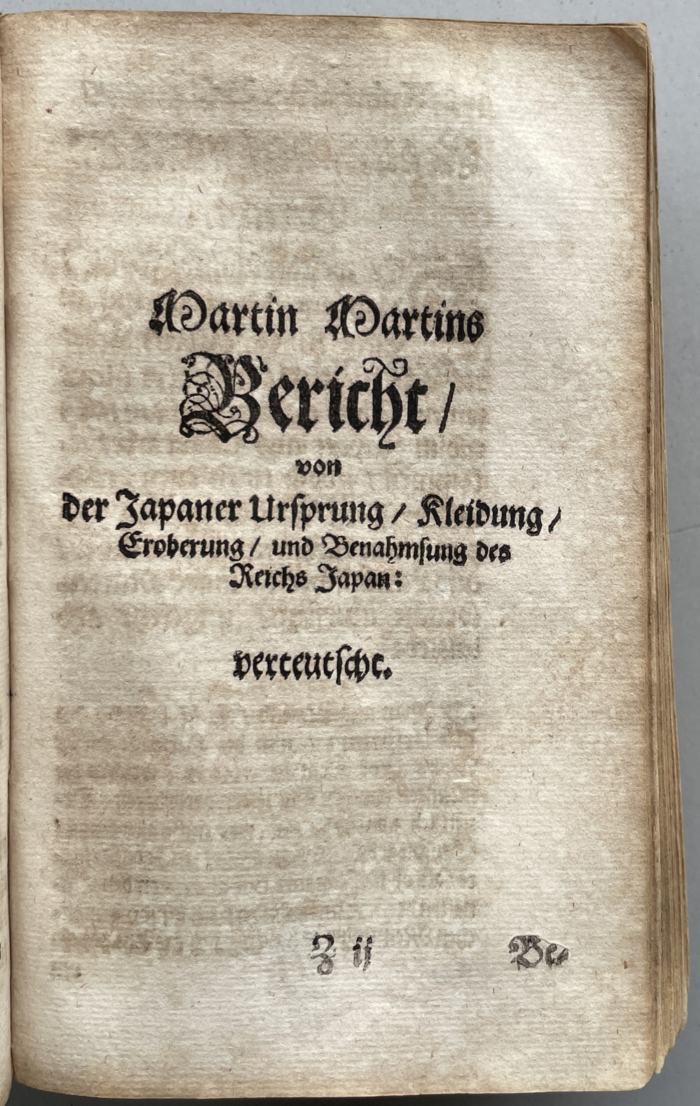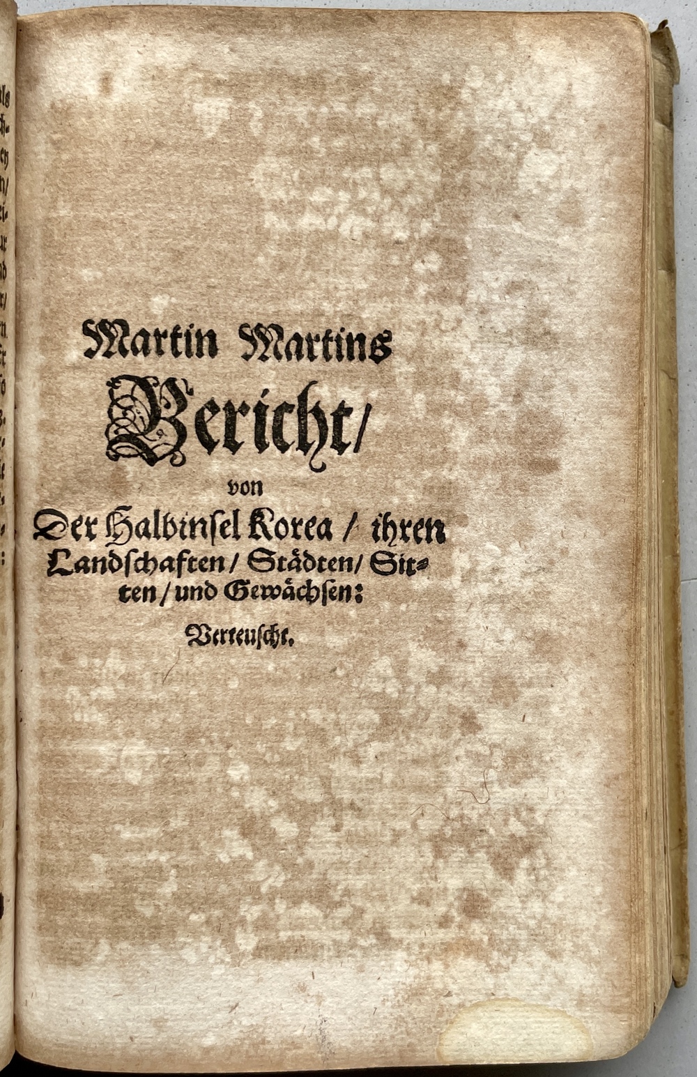 1663年版にはない本書の大きな特徴の一つとして、当時ヨーロッパ人の中で最も清朝事情に通じていたと思われるイエズス会士マルティニ(Martino Martini, 1614 - 1661)による日本情報(「日本人の起源と征服史」)、朝鮮情報(「朝鮮半島についての考察」)を掲載していることが挙げられます。いずれも彼によるヨーロッパ初の中国地図帳である『新中国地図帳』(Novus Atlas Sinensis….Amsterdam: Joan Bleau, 1655)のラテン語テキストを底本として、ドイツ語に翻訳されたものですが、マルティニによる中国を起点とした日本、朝鮮情報は、当時西洋人が立ち入ることができなかった地域についての最新情報として大きな影響力を与えました。アーノルドはマルティニの記述の意義をいち早く認めるとともに、本書収録の他記事を補う重要な情報として本書に収録したものと思われます。