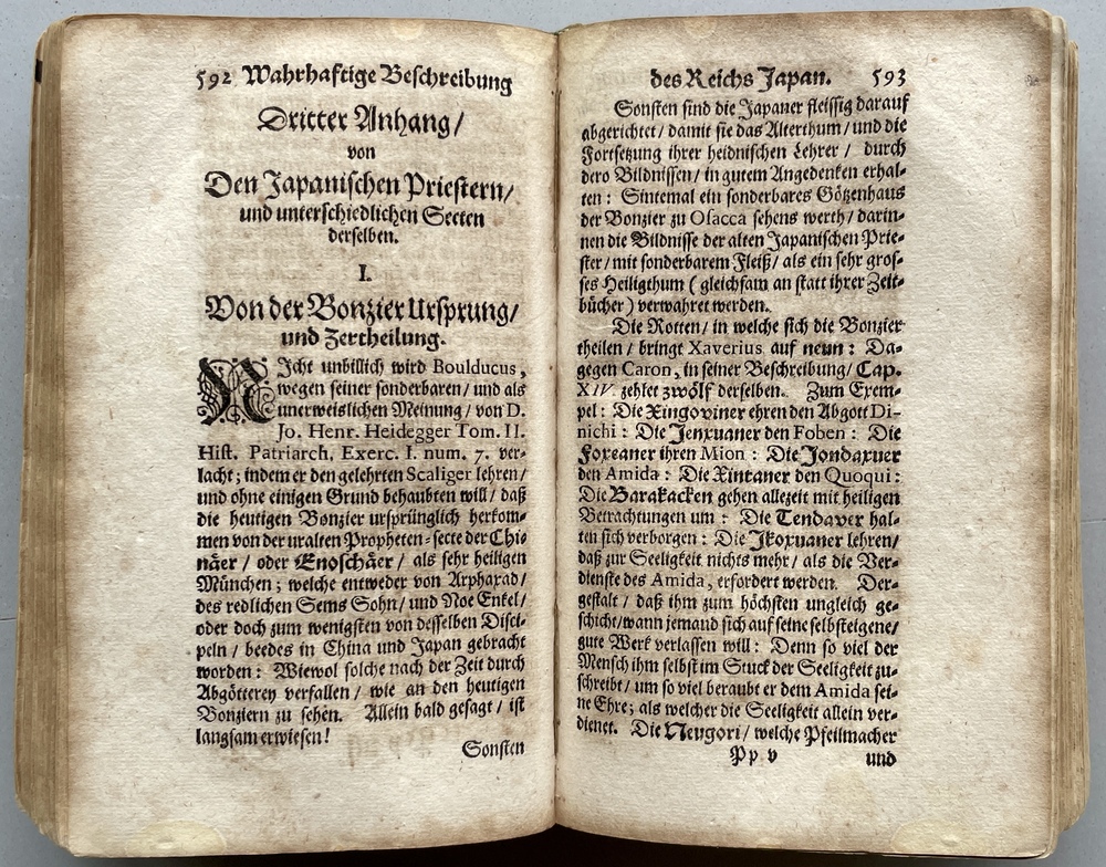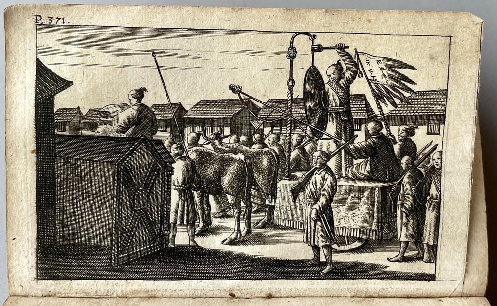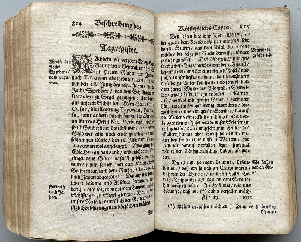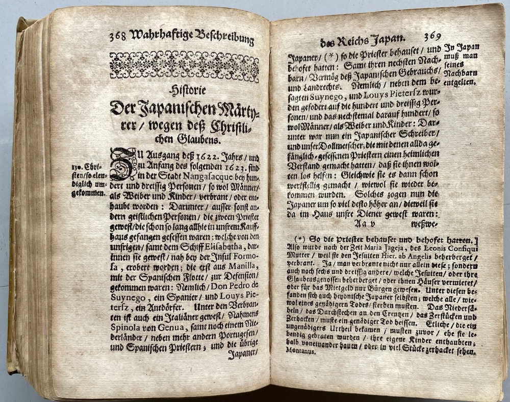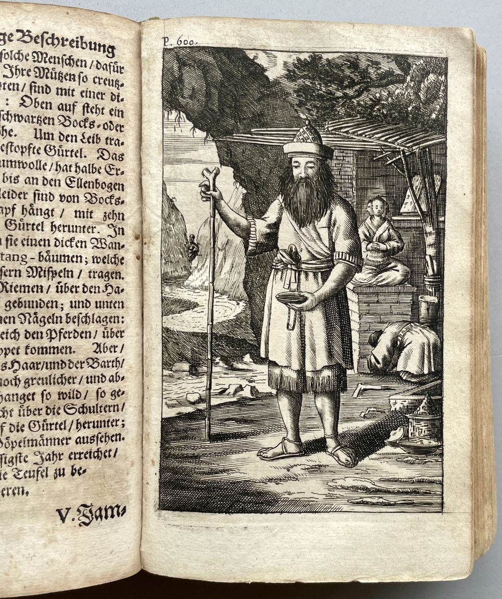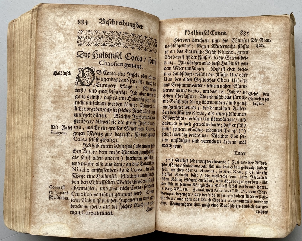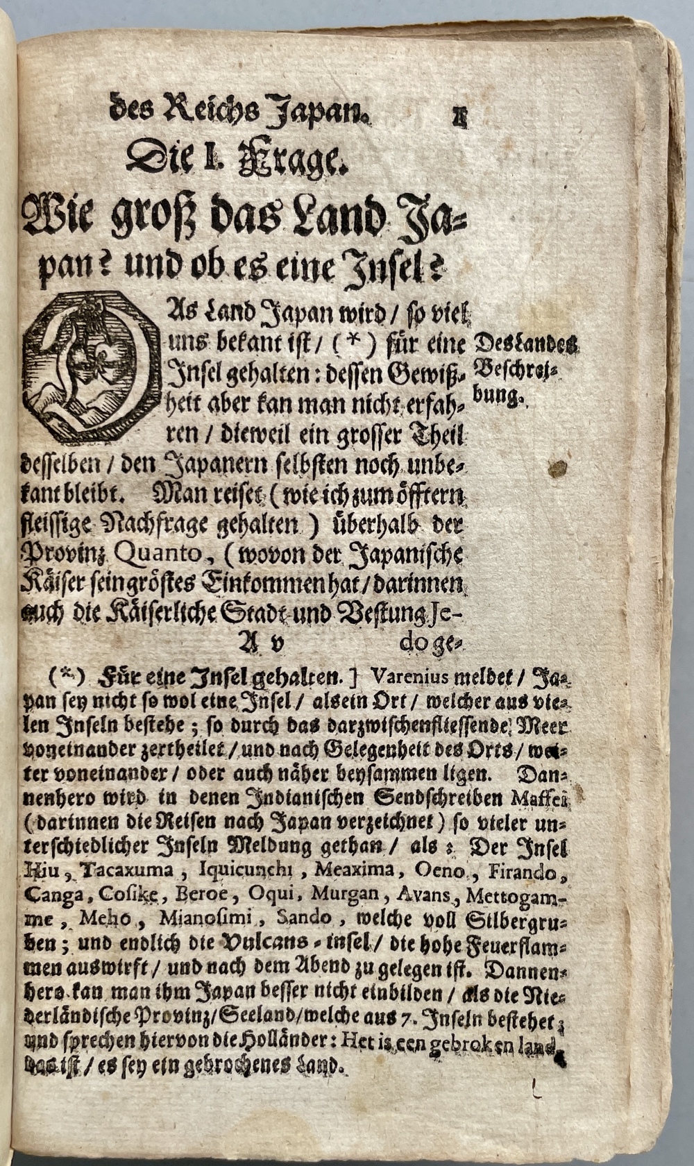 1663年版にはない本書の大きな特徴の一つとして、当時ヨーロッパ人の中で最も清朝事情に通じていたと思われるイエズス会士マルティニ(Martino Martini, 1614 - 1661)による日本情報(「日本人の起源と征服史」)、朝鮮情報(「朝鮮半島についての考察」)を掲載していることが挙げられます。いずれも彼によるヨーロッパ初の中国地図帳である『新中国地図帳』(Novus Atlas Sinensis….Amsterdam: Joan Bleau, 1655)のラテン語テキストを底本として、ドイツ語に翻訳されたものですが、マルティニによる中国を起点とした日本、朝鮮情報は、当時西洋人が立ち入ることができなかった地域についての最新情報として大きな影響力を与えました。アーノルドはマルティニの記述の意義をいち早く認めるとともに、本書収録の他記事を補う重要な情報として本書に収録したものと思われます。
