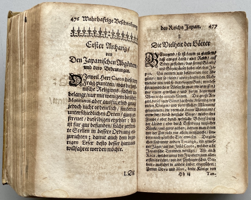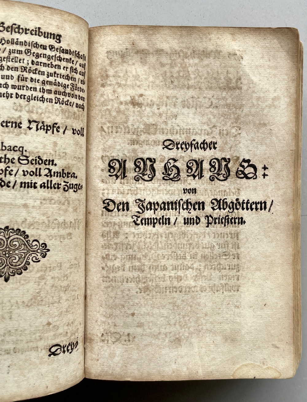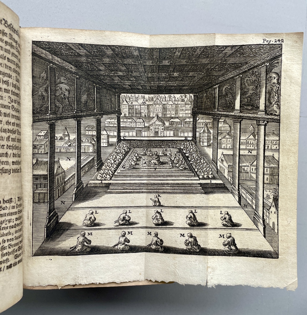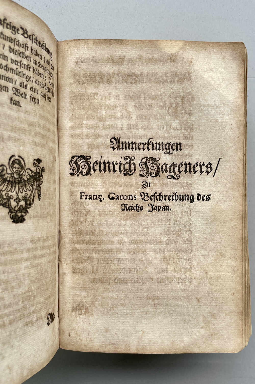 本書は、このようにカロン『日本大王国志』の大幅な増補改訂版をはじめとして、当時のヨーロッパでほとんど知られていなかった、シャムや朝鮮について、さらにはバタヴィアをはじめとした東インドの最新情報をふんだんに盛り込んだ、極めて充実した内容を有している作品です。残念ながら本書では1折り込み地図のみを欠いていますがファクシミリによって補われており、それ以外のすべての口絵、図版、テキストは完備しており、研究、展示に存分に活用していただける良好な状態を保っています。この作品は近年の古書市場に出現することがほとんどなく、また国内研究機関の所蔵も極めて限られていることから、これまで本格的な研究がなされてこなかったものと思われますが、当時のヨーロッパ、特にドイツ語圏における東インド研究の実態を反映した類稀なる作品として、大きな研究価値を秘めた書物と言えるでしょう。