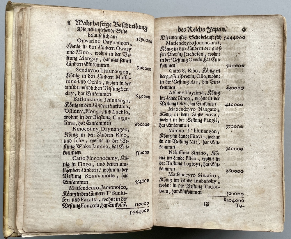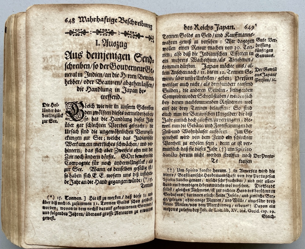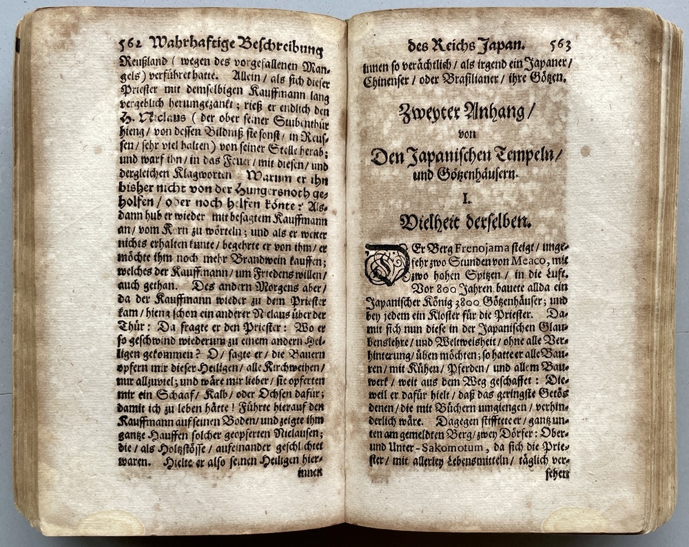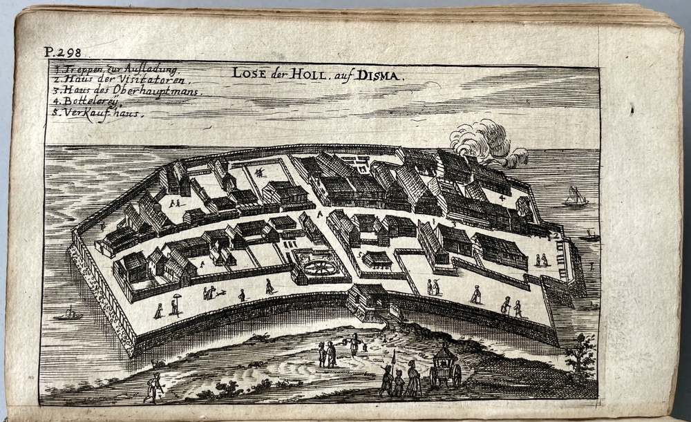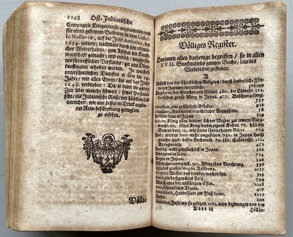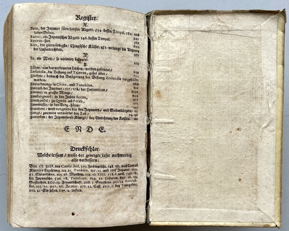 本書は、このようにカロン『日本大王国志』の大幅な増補改訂版をはじめとして、当時のヨーロッパでほとんど知られていなかった、シャムや朝鮮について、さらにはバタヴィアをはじめとした東インドの最新情報をふんだんに盛り込んだ、極めて充実した内容を有している作品です。残念ながら本書では1折り込み地図のみを欠いていますがファクシミリによって補われており、それ以外のすべての口絵、図版、テキストは完備しており、研究、展示に存分に活用していただける良好な状態を保っています。この作品は近年の古書市場に出現することがほとんどなく、また国内研究機関の所蔵も極めて限られていることから、これまで本格的な研究がなされてこなかったものと思われますが、当時のヨーロッパ、特にドイツ語圏における東インド研究の実態を反映した類稀なる作品として、大きな研究価値を秘めた書物と言えるでしょう。
