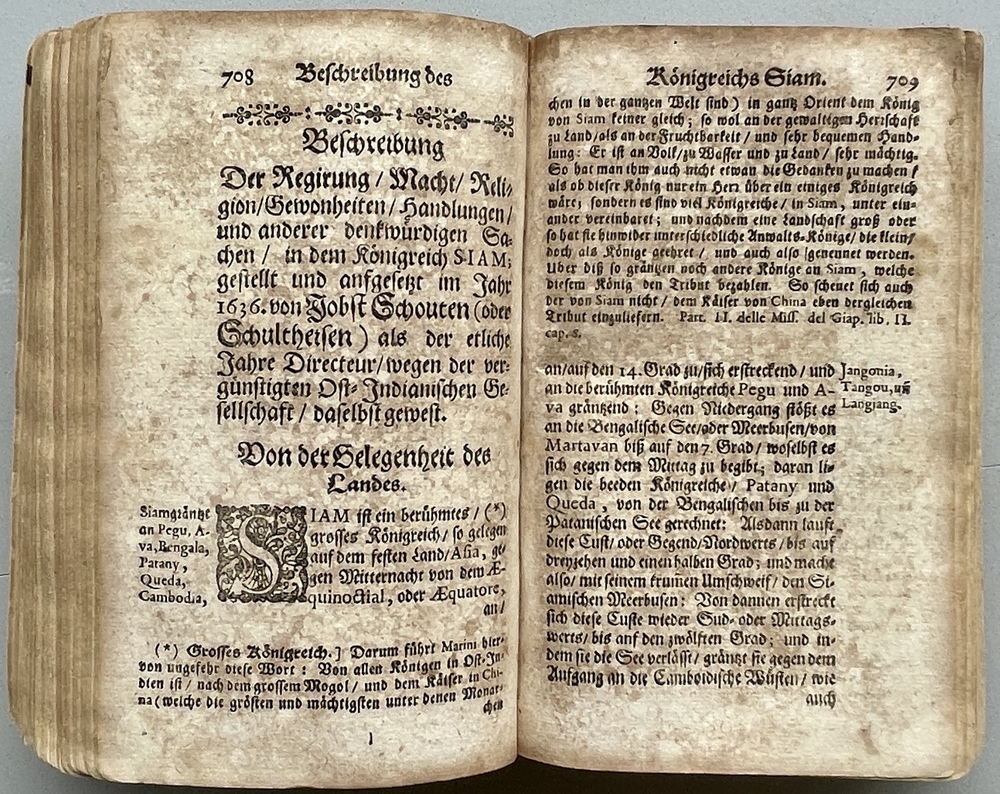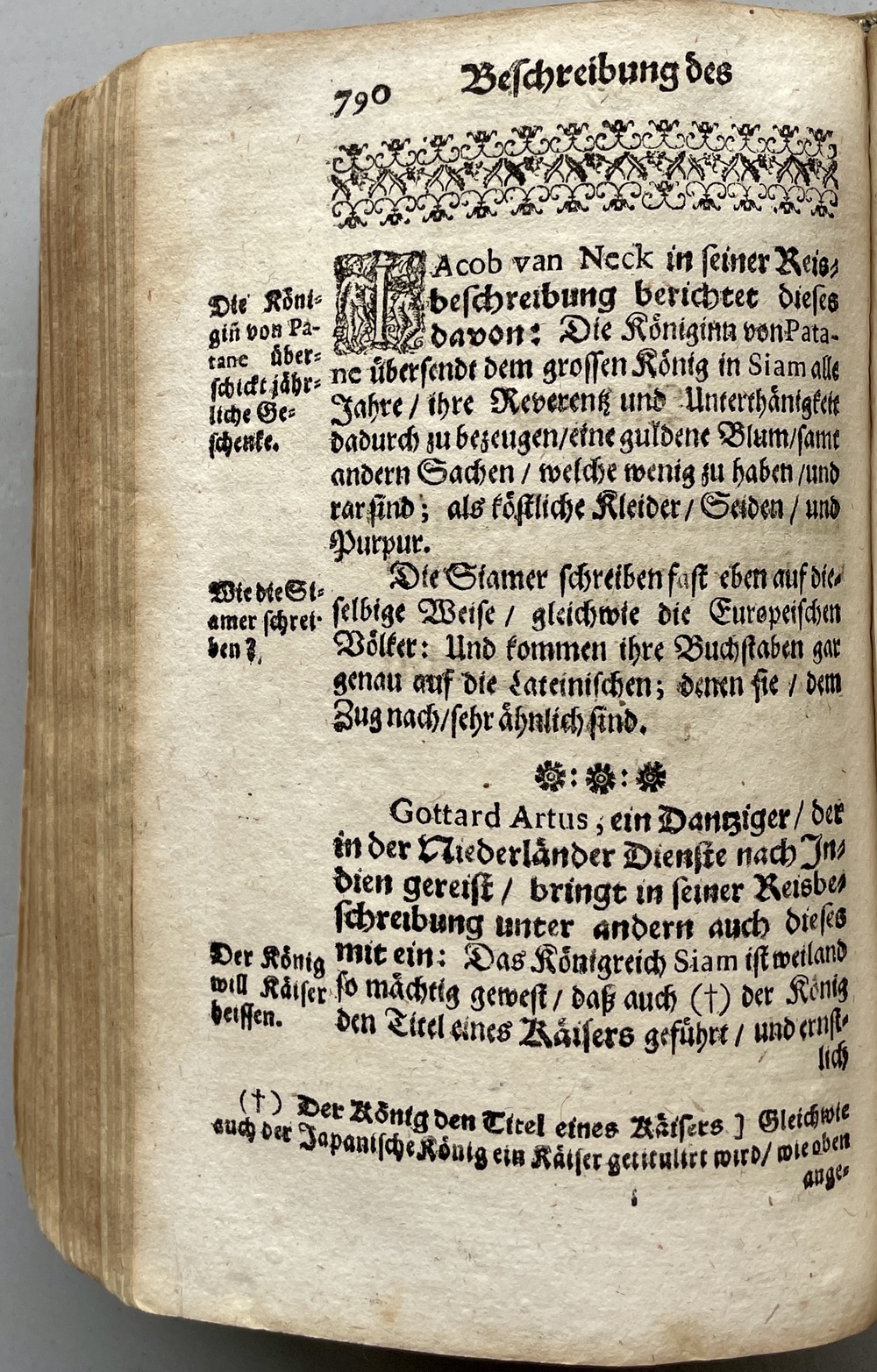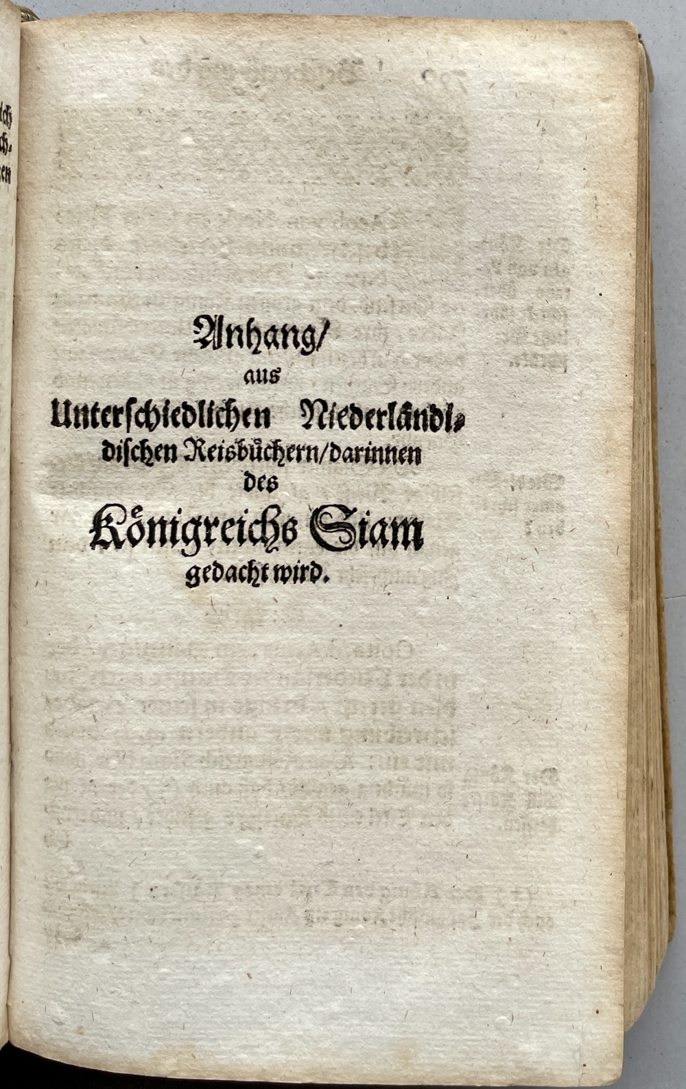 スハウテンのシャム論は、すでに1663年版において掲載されていましたが、本書では他の作品同様に編者アーノルドによる注釈が加えられている他、これを補う記事として、ネック、アルトゥジウス、ピント、スプリンケルの著作中に見られるシャム関連記事の抜粋(799頁〜)が新たに加えられています。先に見たハメル『日本幽囚記』と同じく、こうした補論をスハウテンの社務論と合わせて読むことによって、当時の読者は最新のシャム研究を本書から学ぶことができたものと思われます。
