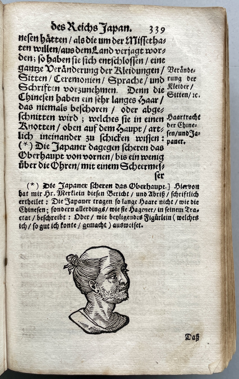 メルクラインは単に本文のドイツ語訳を行うだけでなく、自身による注釈も新たに執筆(281頁〜)しており、この記事は原著オランダ語版にはない、メルクライン自身の日本滞在経験に基づいた独自の日本関係記事となっていることから注目に値する記事です。また、『日本大王国志』決定版(1661年版)では、それ以前の版には収録されていたハーゲナール(Hendrik Hagenaar)による注釈が削除されていますが、メルクラインはこの注釈をあえて翻訳してこのドイツ語訳版に欠かせない記事として収録(311頁〜)しています。ハーゲナールはカロンよりも日本滞在歴が浅かったにもかかわらず、オランダ東インド会社内の序列ではカロンの上司にあたる役職にあり、カロンとの関係が良好でなかったとされていています。この不和のため、カロンは『日本大王国志』決定版のための校閲の際に、ハーゲナルの注釈を「とんでもない誤りに満ちた」ものとして削除してしまいましたが、ハーゲナールの注釈は、カロン『日本大王国志』の註釈として優れた内容で、カロンにはない独自の視点からの考察も加えられていることから、メルクラインはあえてドイツ語訳版のために訳出して収録したものと考えられます。