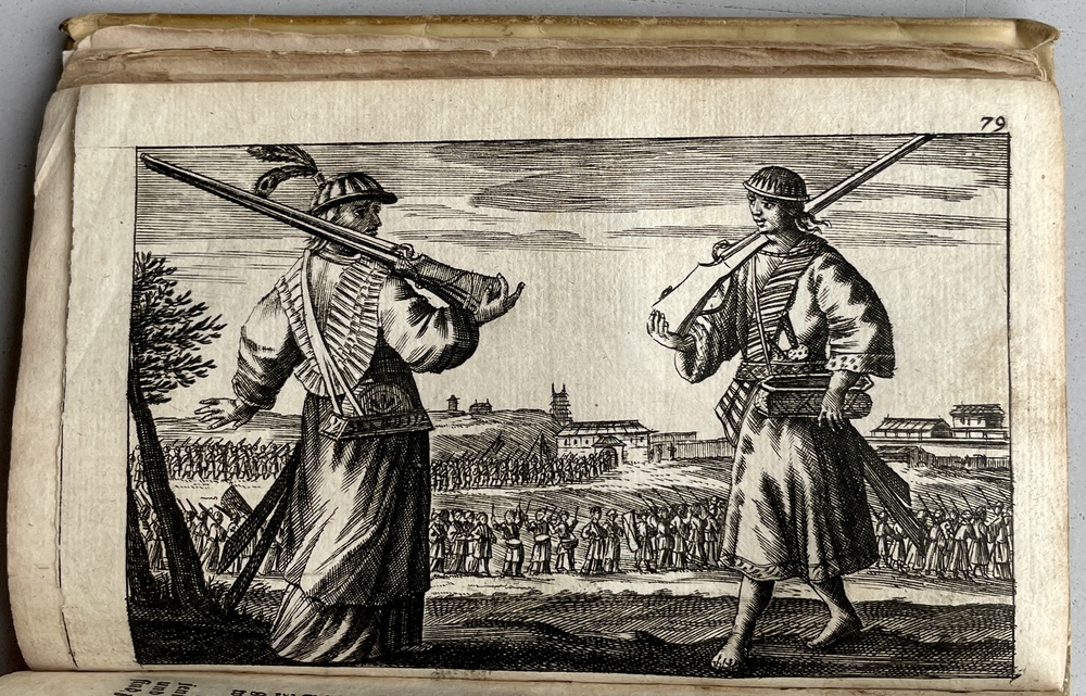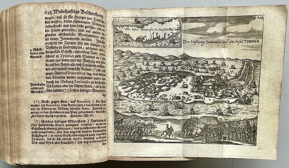 本書には、1663年版において初めて掲載された「1663年7月5日に中国の人々の支配下に帰した美しきフォルマサ、台湾島での出来事の速報」と題した記事(263頁〜)が再録されています。これは、1624年にオランダが支配していた台湾の拠点であるゼーランディア城が、国姓爺(Coxcenia)こと、鄭成功によって陥落させられた事件をいち早くヨーロッパに伝えたものです。この記事には、ゼーランディア城が鄭成功によって包囲されて攻め込まれる場面を、台湾の小地図とともに描いた折込図版が収録されていて、同時代の視覚資料としても大変興味深いものです。
