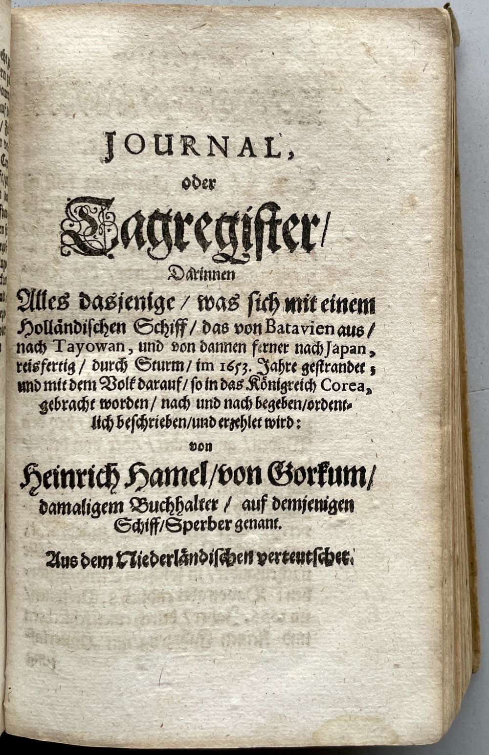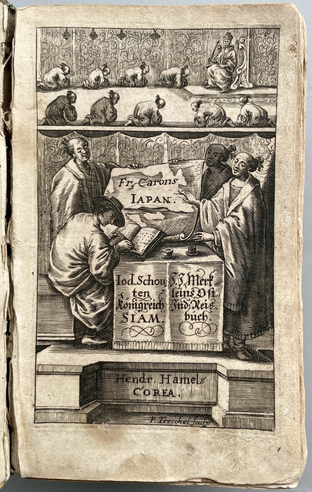 本書の刊行当時、ヨーロッパ人にとって朝鮮はほとんど未知の地域であって、断片的な情報は入ってきていたものの、実際に同地を訪れた人物による報告、記述というものはほとんど存在していませんでした。この状況を偶然にも打破することになったのが、オランダの貿易船の船長で1653年に日本へ向かう途上で朝鮮半島に漂着してから13年にわたって同地での滞在を余儀なくされた後に、1666年に日本へと脱走して幕府との交渉の末に帰国を果たしたハメル(Hendrick Hamel, 1630 - 1692)です。彼はこの苦難に満ちた経験を『朝鮮幽囚記』の名で知られるオランダ語作品にまとめて1668年に刊行したことによって、当時のヨーロッパにおける最新の挑戦情報をもたらすことになりました。編者アーノルドは、1663年版刊行後に発表された『朝鮮幽囚記』にいち早く注目し、ドイツ語に訳して本書に収録することで、本書を日本研究にとどまらない東インドの総合的な研究論集として編纂しているように見受けられます。上述のマルティニの朝鮮論は、ハメルの情報を捕捉する重要な情報として、『朝鮮幽囚記』諸版にも掲載されていたもので、これらをあわせ読むことによって、当時の読者は最新の朝鮮情報を入手することができたと言えます。