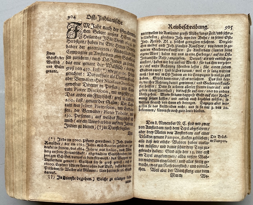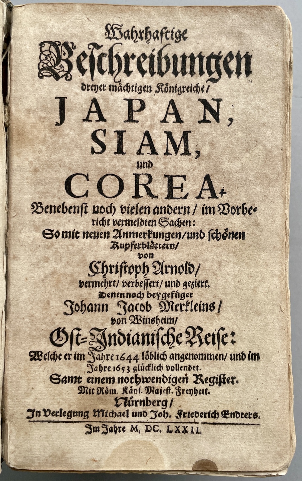 本書は、17世紀後半のドイツ語圏における日本をはじめとした東インドに関する最新情報を凝縮した作品で、1,100ページを超えるボリュームを誇る「東洋大全」とも呼べるような充実した内容を備えた注目すべき書物です。本書の底本となったのは、同じ編者アーノルドが手がけた1663年の著作(Wahrhaftige Beschreibungen zweyer mächtigen Königreiche JAPPAN und SIAM…Nürnberg, 1663) ですが、その分量が2倍以上に達するほどの大幅な増補と改訂が本書には施されており、わずか10年の間にヨーロッパにもたらされた東インド情報に著しく大きな進展があったことがうかがえる、非常に興味深い作品です。