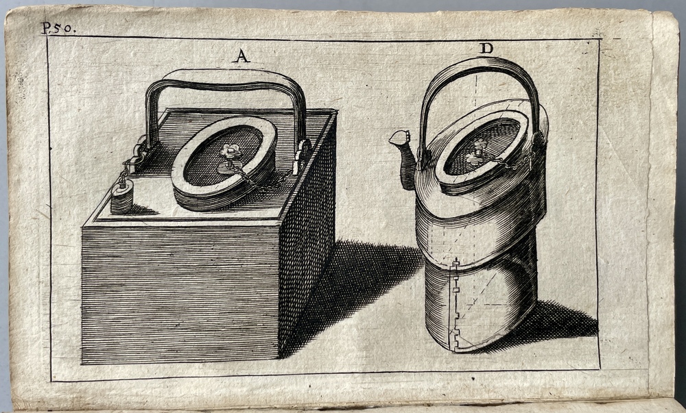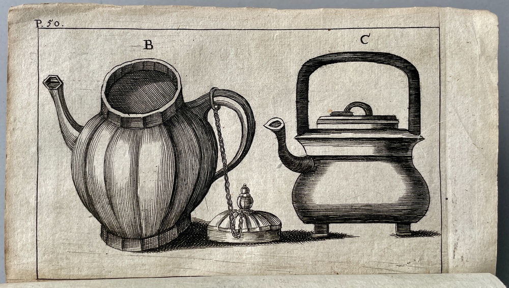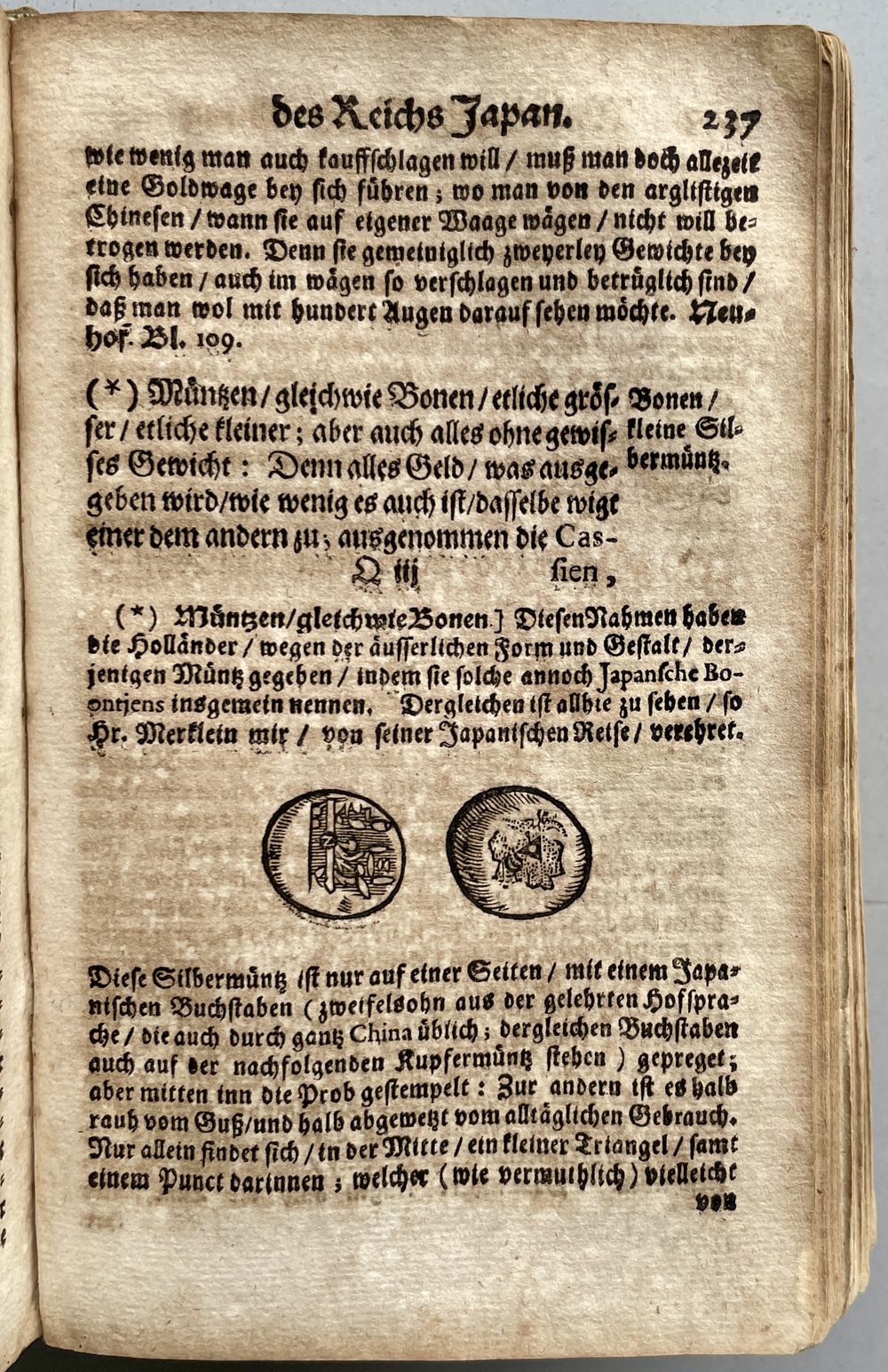 さらに、アーノルドは未公刊と思われる関連史料をも駆使したものと思え、同時代、あるいはそれまでの関係書にはない独自の記述を注釈の中に散りばめている他、何らかの未交換史料に含まれていたスケッチなどをもとにしたと思われる興味深い図版も、本書注釈中に付け加えています。例えば50頁と51頁との間には、アーノルドによる日本の喫茶文化を考察した注釈に対応して、日本の茶器を描いたと思われる2枚の図版が収録されています。また、239頁には「崇禎通宝」と記された明の通貨を描いたと思しき図版が、さらには339頁には髷を結った男性を描いたと思われる胸像図が掲載されています。これらの図版は、店主の知る限り本書以外の他の刊行書籍の中には見出せないものばかりで、しかも、モンターヌスの作品に見られる挿絵がしばしば奇抜で、空想的なものが多いことに対して、アーノルドが注釈に付け加えた図版は、いずれもディテールがかなり細かく対象が正確に描写されていることから、何らかの来日経験のある人物のもたらした独自情報に基づいているのではないかと推察される、非常に興味深いものです。