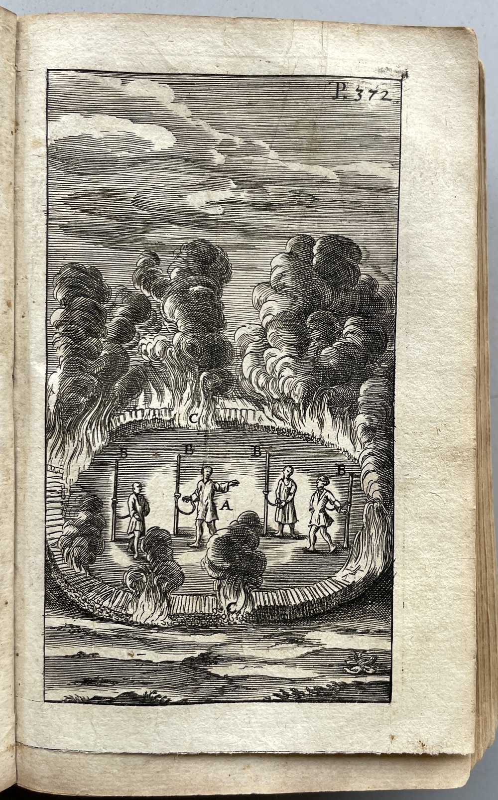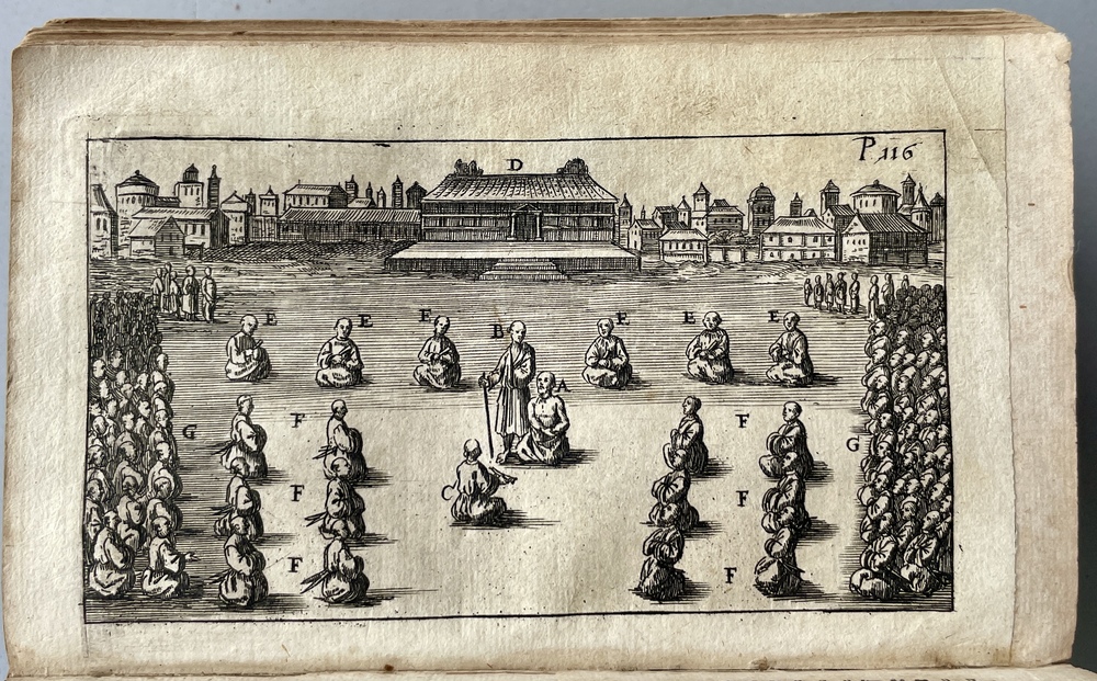 とりわけアーノルドが随所で参照(批判も含め)しているのが、1663年版の刊行後の1689年(ドイツ語訳版)に刊行されたモンターヌス(Arnoldus Montanus)の『東インド会社遣日使節紀行』です。この作品は、カロン『日本大王国志』以後に発表された当時のヨーロッパにおける最新、最大の総合的な日本研究として知られている著名な作品で、数多くの銅版画を随所に収録したことでも、大いに人気を博しました。アーノルドはこの作品の記述を自身で入念に読み込んだようで、それ以外の日本研究書との比較、照合も行いながら、カロン『日本大王国志』本文中で、モンターヌス『東インド会社遣日使節紀行』と関連の深い箇所がある際には、膨大な注釈を付け加えています。さらに、モンターヌスの作品の大きな特徴であった銅版画も数多く転用して、カロンのテキスト中に配置するなど、あたかも17世紀を代表する二大日本研究書を統合したかのような感があります。