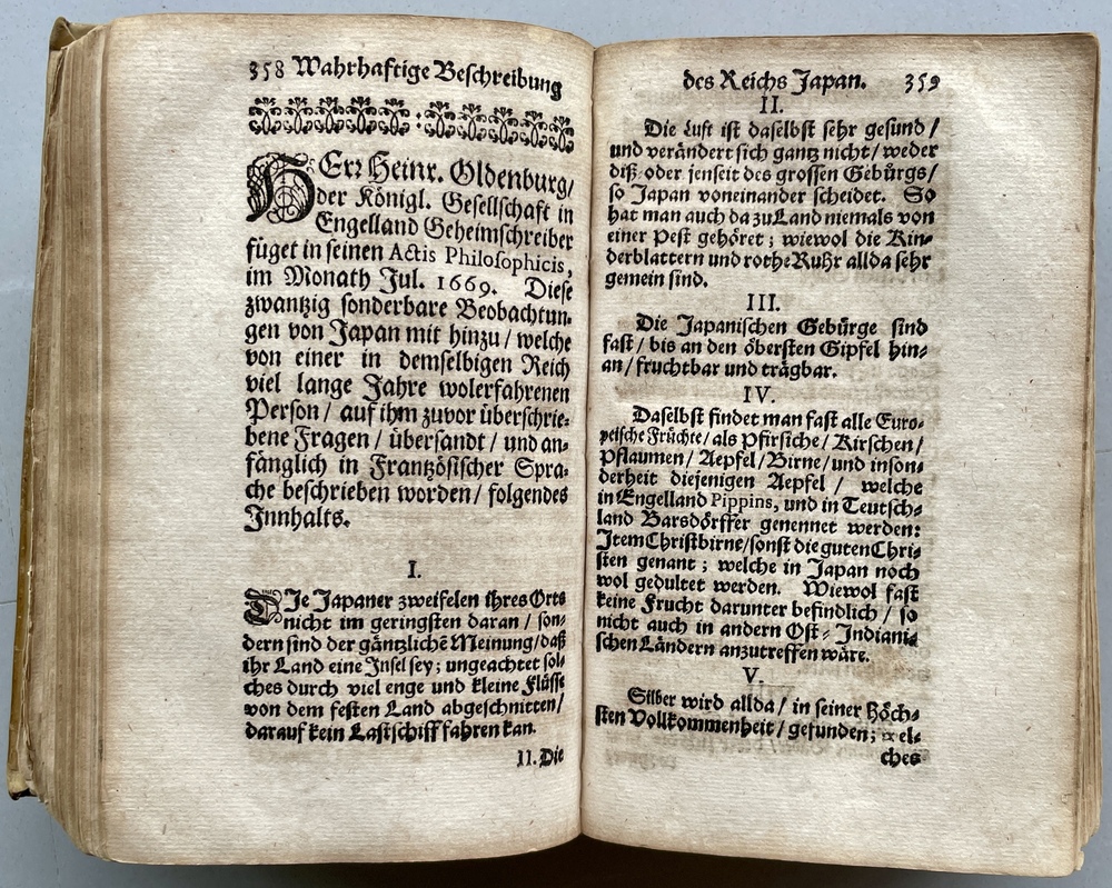イギリス王立協会の初代事務総長を務めたオルデンバーグ(オルデンビュルグ、Heinrich Oldenburg, c.1618 - 1677)による日本論の原題は、「Some Obeservations Concerning Iapan」と題されたもので、王立協会の紀要『哲学紀要(Philosophical Transactions)』第4巻(1669年)の983頁から掲載された作品です。この日本論は、日本の地理、紀行、風土、植生、鉱物資源、動植物、日本の人々の気質、技芸、学問、商業、建築と町並み、統治形態と宗教などの多岐にわたる主題について、それぞれごく簡単にまとめた内容ですが、コンパクトながらもバランスの取れた優れた日本論となっています。日本に数年の滞在歴を持つ見識ある人物からの聞き取ったというもので、日本についての20の項目にわたる情報をまとめたこの記事は、当時最新の日本研究の一つと言えるものでしょう。オルデンバーグによる日本論そのものが、あまり知られているとは言えない貴重な作品ですが、それがいち早くドイツ語に翻訳されて多くの読者に伝えられていたことは、大変興味深いことと言えるでしょう。