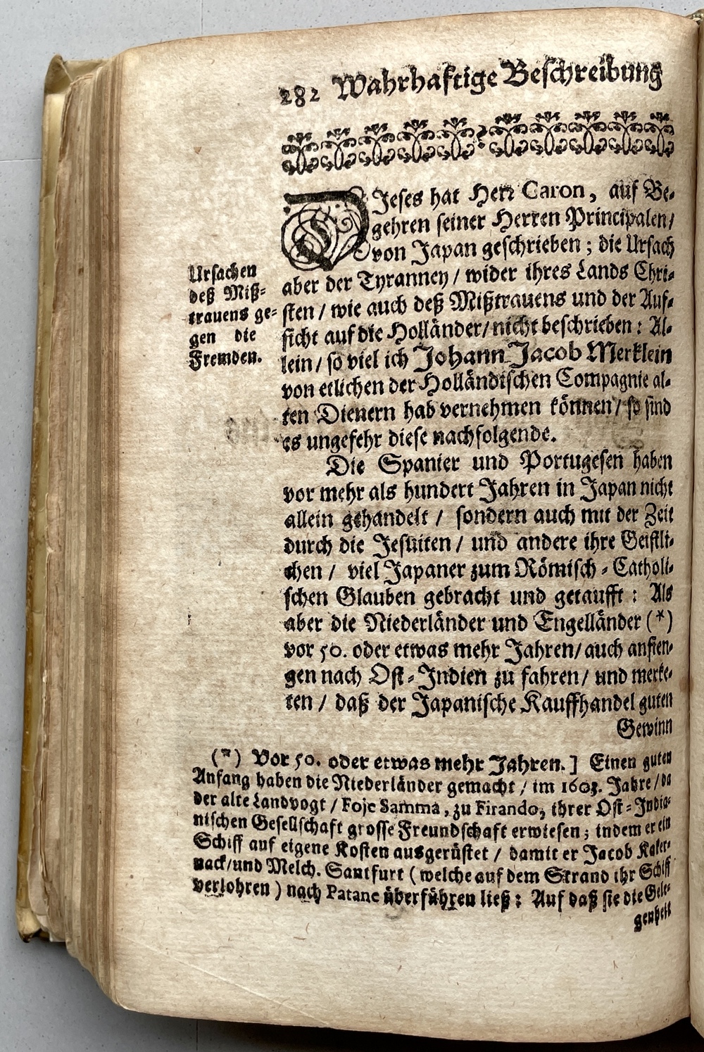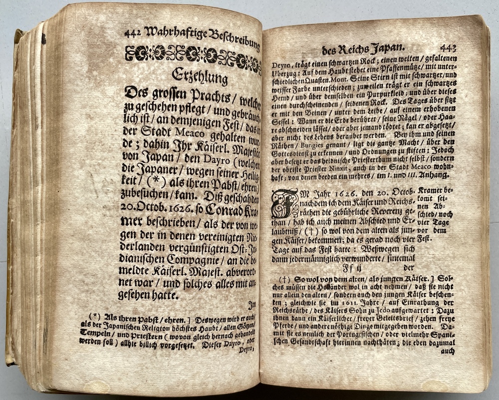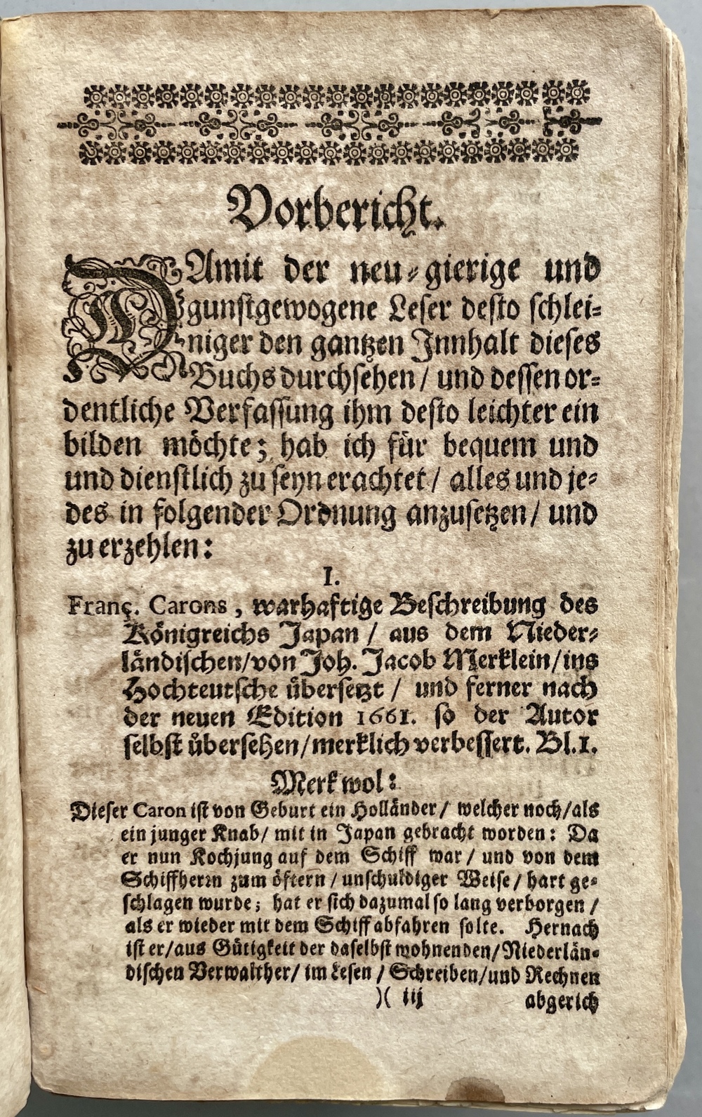 このように、17世紀における日本研究の最重要文献として知られる『日本大王国志』ですが、本書であるドイツ語訳版は原著オランダ語版にはない独自の興味深い記事を多数収録している点に大きな特徴と意義があります。ドイツ語への翻訳を行ったのは、長年オランダ東インド会社の医師として勤務し、カロンとも親しかったメルクライン(Johann Jacob Merklein, 1620 - 1700)で、彼自身も日本への渡航と滞在経験があったことから、『日本大王国志』の訳者としては最適の人物であったと言えます。『日本大王国志』は、カロンの認可を経ないまま1645年に公刊されて以降、さまざまな版が継続して刊行されましたが、本書は諸版の中でもカロン自身の校閲と改訂が施された決定版(1661年版)を底本としています(『日本大王国志』諸版の変遷については解説末尾参照)。