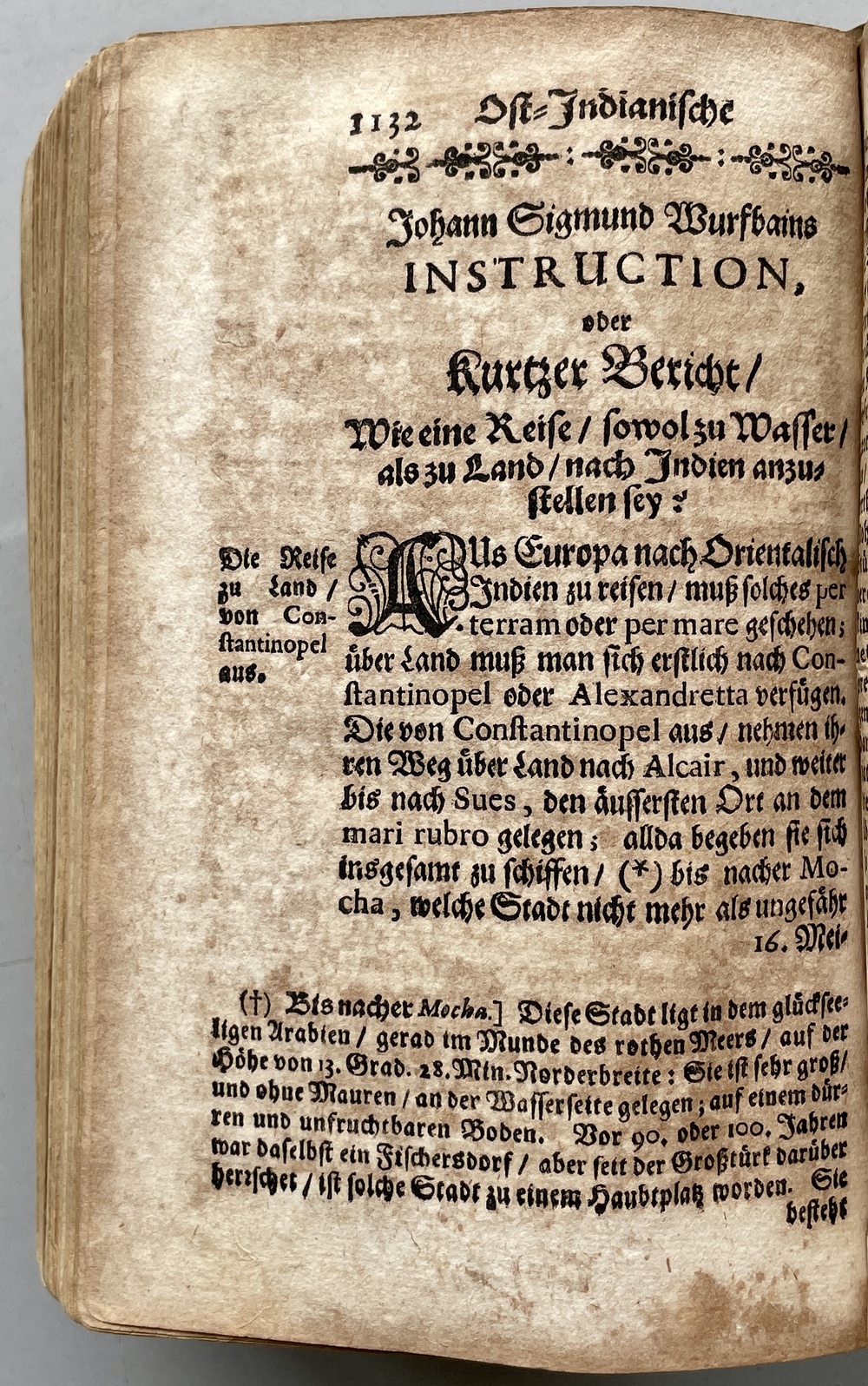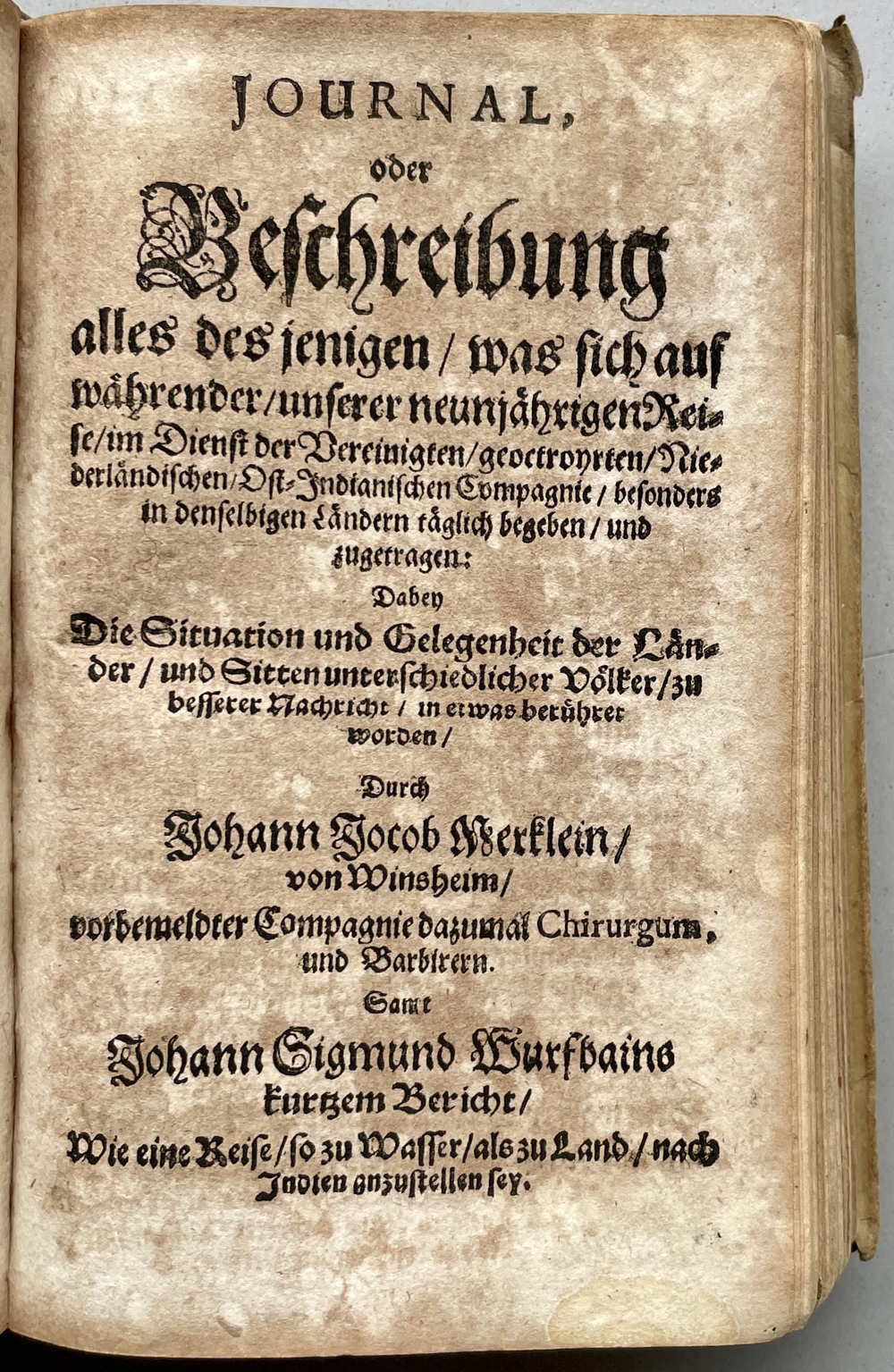 本書ではメルクライン『東洋遍歴記』を補う記事として、ヴルフバイン(Johann Siegmund Wurffbain, 1613 - 1661)による「東インドへと至るための陸路、海路についての小論」が収録されていることも注目に値します。ヴルフバインは、オランダ東インド会社社員として1632年から1644年までバタヴィアを中心とした東インド各地で活躍した人物で、メルクラインと同じく当時の東インド事情に最も通じた人物の一人と目されていましたが、本書刊行時点ではまだ彼の航海記は刊行されておらず、後年刊行されることになる主著に先駆けて、貴重な彼のもたらした情報を掲載したこの作品は当時極めて大きな意義を持ったものと思われます。
