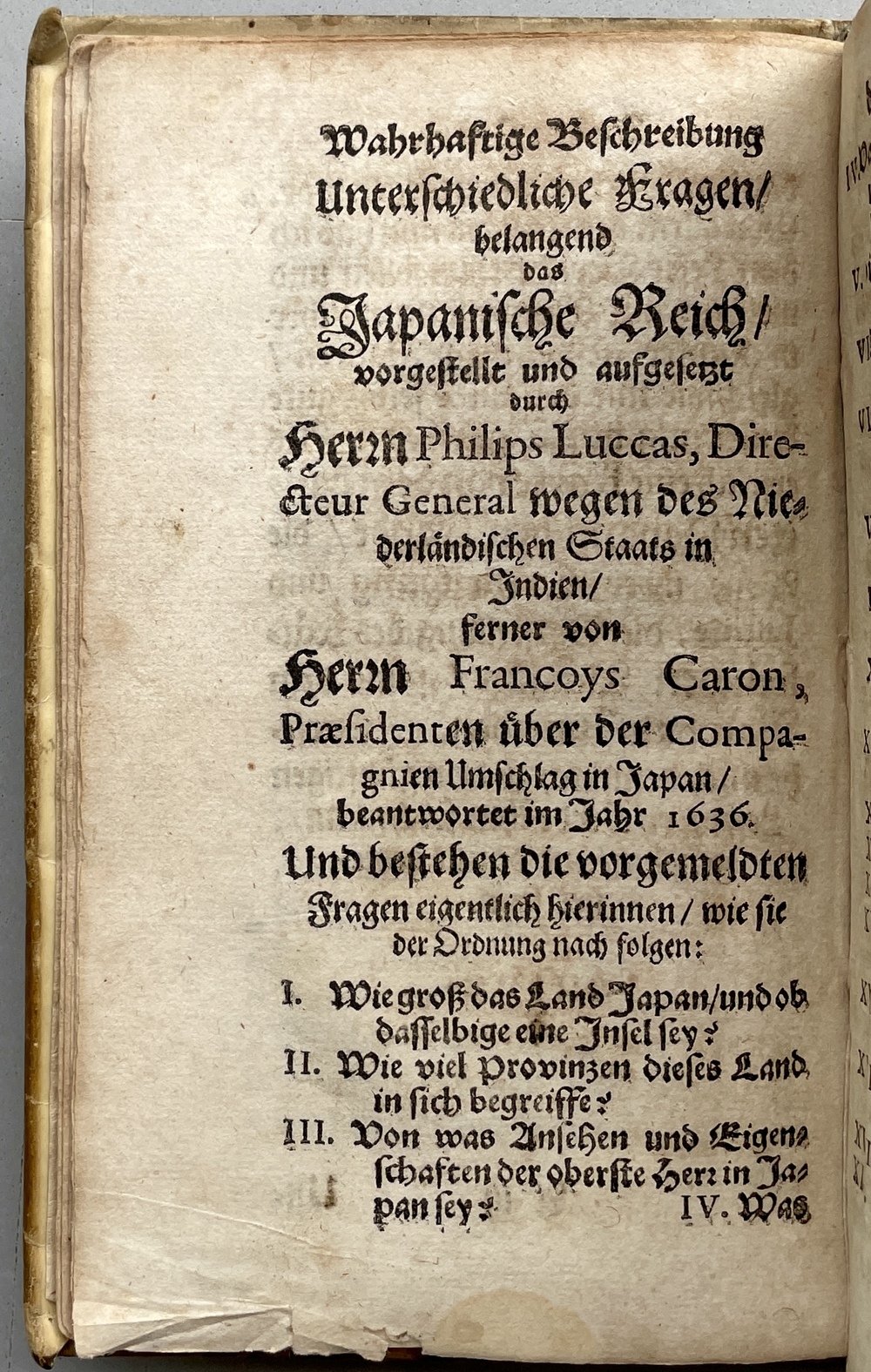 「同書は、館長代理時代、バタヴィア商務総監のフィリップ・ルカースゾーンによる、以下の31の質問に回答する形で執筆されています。1.日本国の大きさ、日本は島国か、2.如何に多くの州を含むか、3.日本における最上支配者の特質と権力、4.将軍の住居・地位・行列、5.兵士の数と武器、6.幕閣およびその権力、7. 大名とその勢力、8.大名の収入とその源泉、9.処刑の方法、10.何が重罪に相当するか、11.住民の信じる宗教、12.寺院、13.僧侶、14.宗派、15.キリシタンの迫害、16. 家屋・建具、17.来客の接待、18.結婚生活、19.子供の教育、20.遺言が無い場合の相続、21.日本人は信用できるか、22.貿易および貿易従事者、23.内地商業および外国航海、24.商業の利益、25.外国との交際、26.日本の物産、27.貨幣および度量衡、28.鳥獣類、29.鉱泉、30.将軍への謁見、31.言語・写字・計算方法・子孫に歴史を公開するか。」