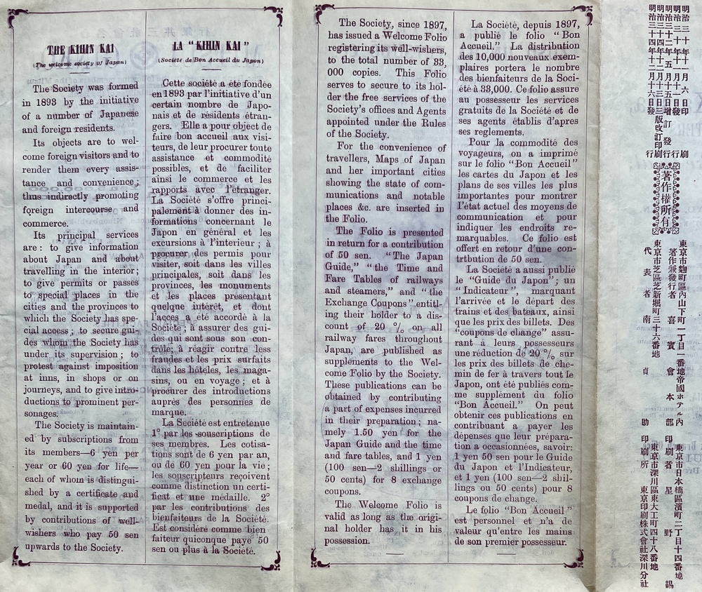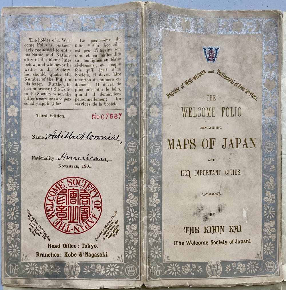 THE WELCOME FOLIO CONTAINING MAPS OF JAPAN AND HER IMPORTANT CITIES. Register of Well-wishers and Testimonial of Free services.