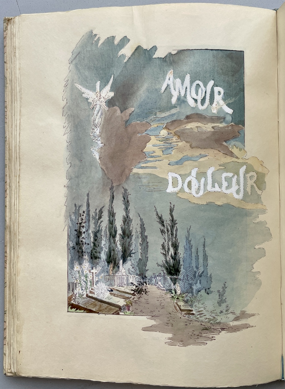 Original water color painting on hand made vellum binding with hand made illustrated vellum dust jacket.