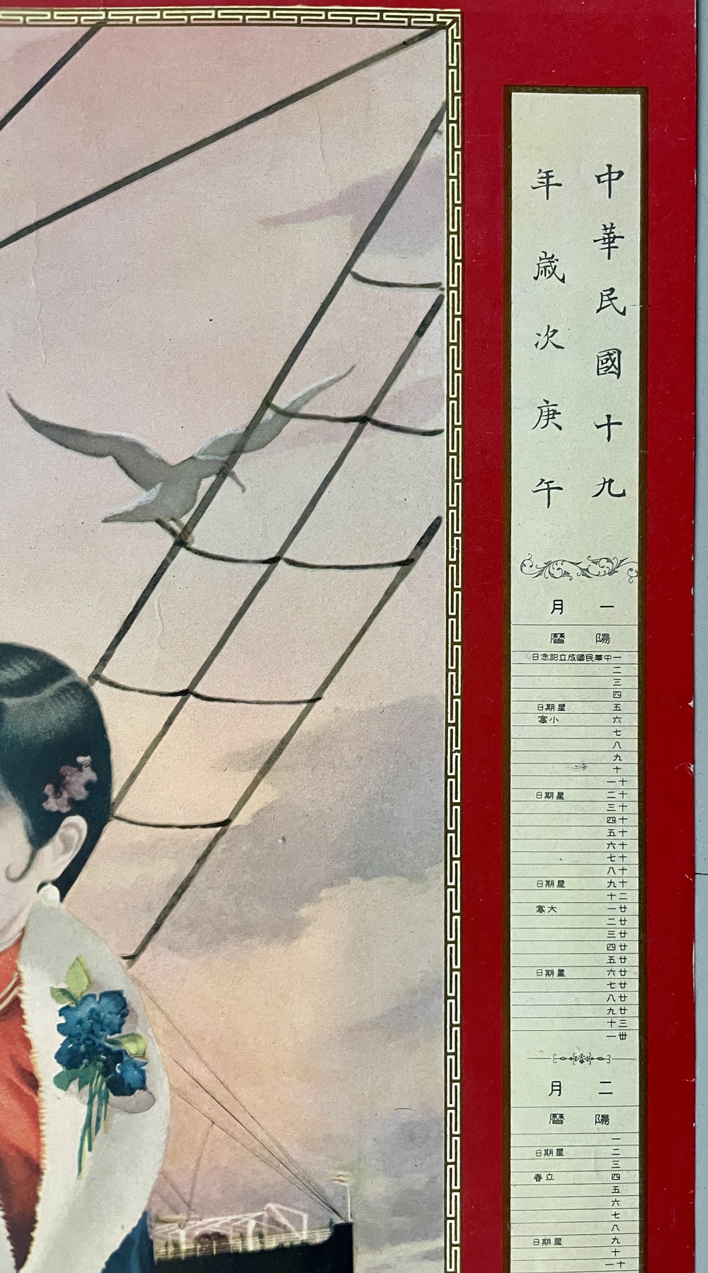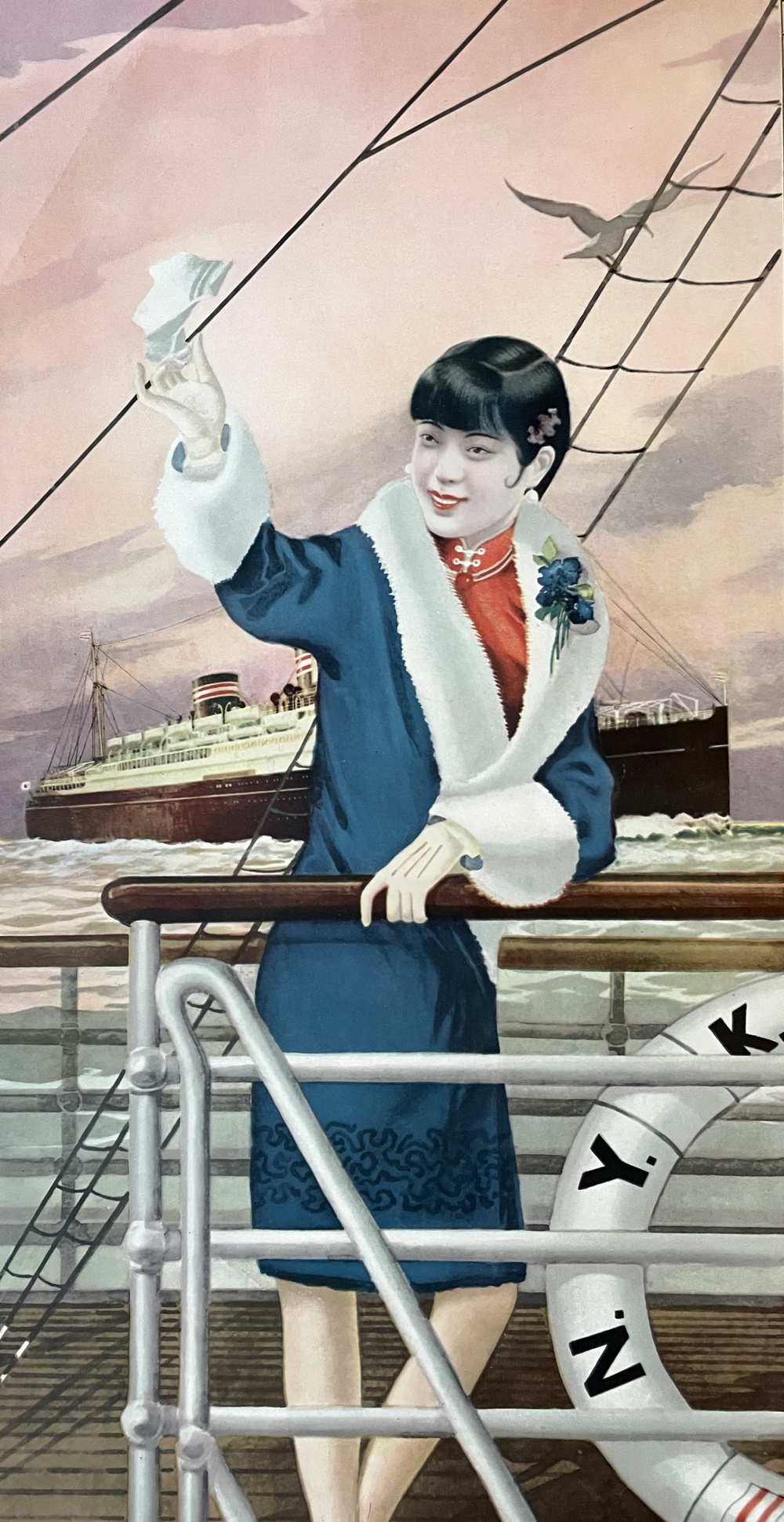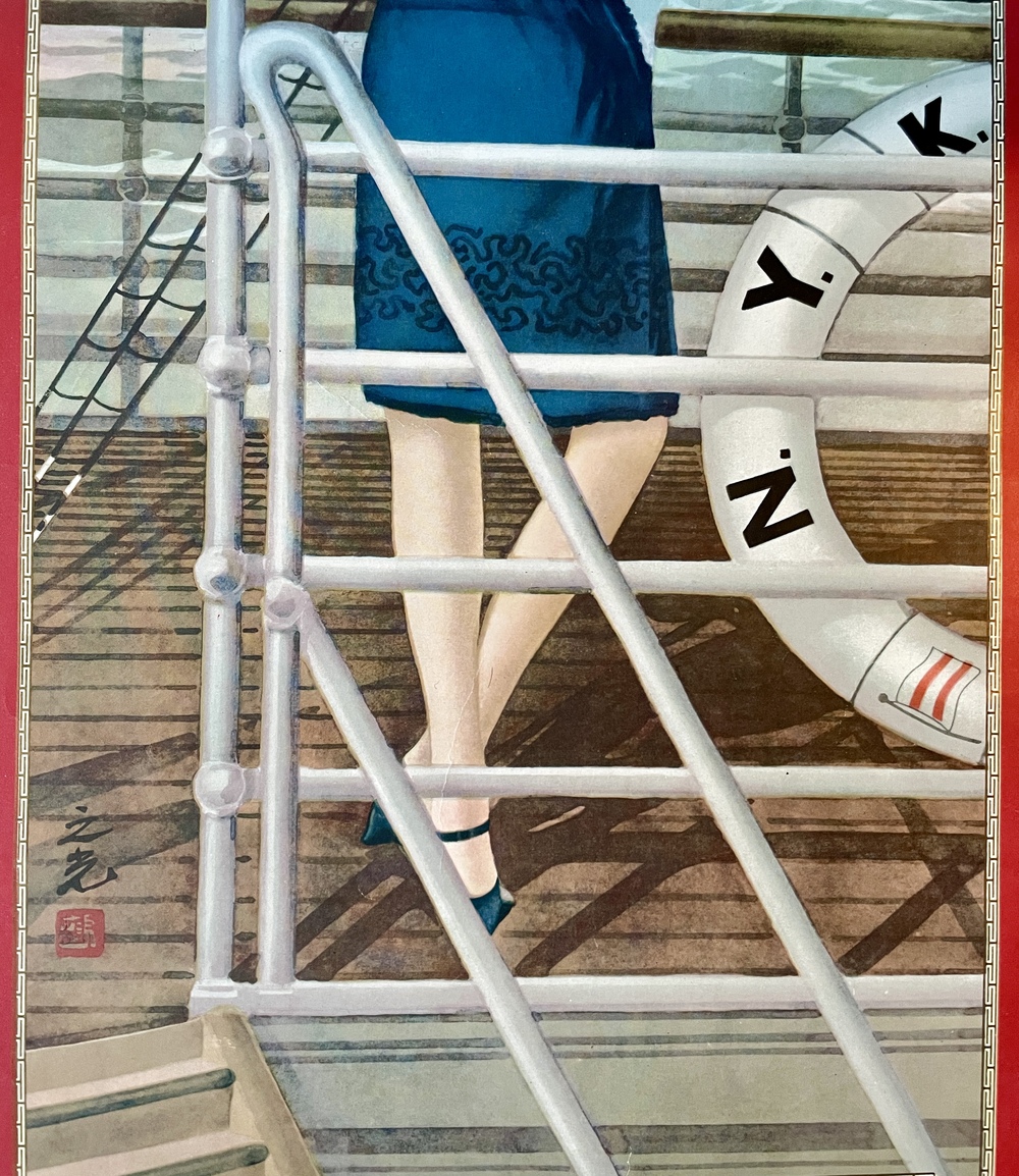 このポスターは日本郵船が作成した1930年のカレンダーを兼ねた宣伝ポスターで、テキストが中国語で記されているほか、中華民国が建国した際に創設された民国紀元(19年)が併記されているという大変珍しい作品です。 日本国内や西洋諸国向けのポスターやカレンダーとはやや形状の異なる、縦長の短冊のような図面の中心に描かれているデッキで寛ぐ女性の背景には日本郵船の大型客船とカモメが描き込まれており、足元に置かれた救命浮輪には「N(ippon)Y(usen)K(aisha」と明記されていて、さりげなく同社のポスターであることを画中でもアピールしていることがわかります。図面下部のテキストでは日本郵船の簡単な社史と、同社が当時就航していた上海や香港をはじめとした中国大陸各地への航路と支店が記されています。このカレンダーのデザインは、日本のポスター黎明期に多く見られたいわゆる「美人画」の系譜にあるとも言えなくはありませんが、背面に鮮やかな赤を据えた独特のデザインは日本国内や西洋諸国向けのポスターや広告等には見られない色使いで、このカレンダーが中国市場の好みに合わせて特別に製作されたことを示唆しています。図面左下には絵師の落款と思しきものも見受けられますが、店主には絵師を特定することができておりません。 このカレンダーの色鮮やかな印刷を手掛けたのは、石版多色印刷技術に秀でていたことで知られる三間印刷で、同社社主の三間隆次はドイツをはじめとした海外の最新印刷技術の導入に積極的なパイオニア的人物であったことでも知られています。三間印刷は東洋汽船による美しいポスターも手がけており、高度な印刷技術力が求められる海外向けのポスター製作にも豊富な経験がありました。 なお、このポスターは著しい褪色などもなく、比較的状態の良いものと思われますが、ポスター下部の発行年や発行地を示す小さなテキストの一部が切れていることからも分かるように、最下部の一部が切り取られているようです。また、裏面に幾つかの補修跡も見られ、「OAKLAND PUBLIC LIBRARY DEPARTMENT OF FINE, ARTS」という(かなり古い年代と思われる)押印がみられます。