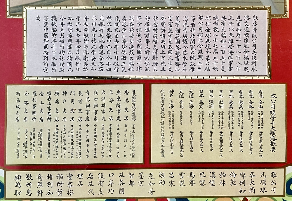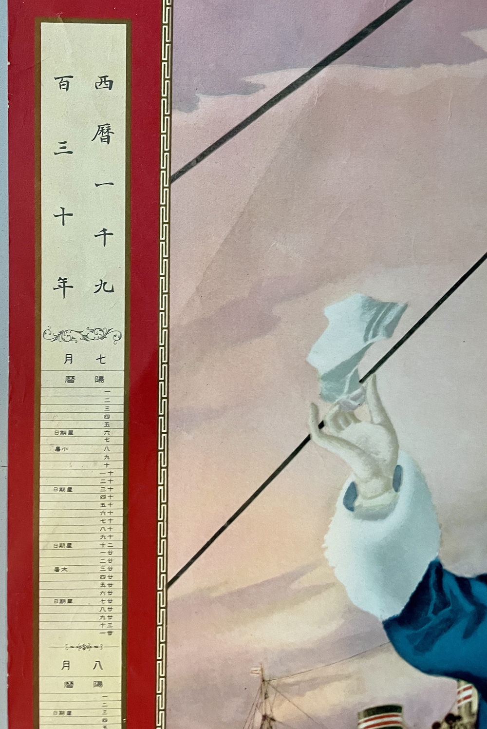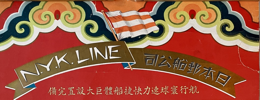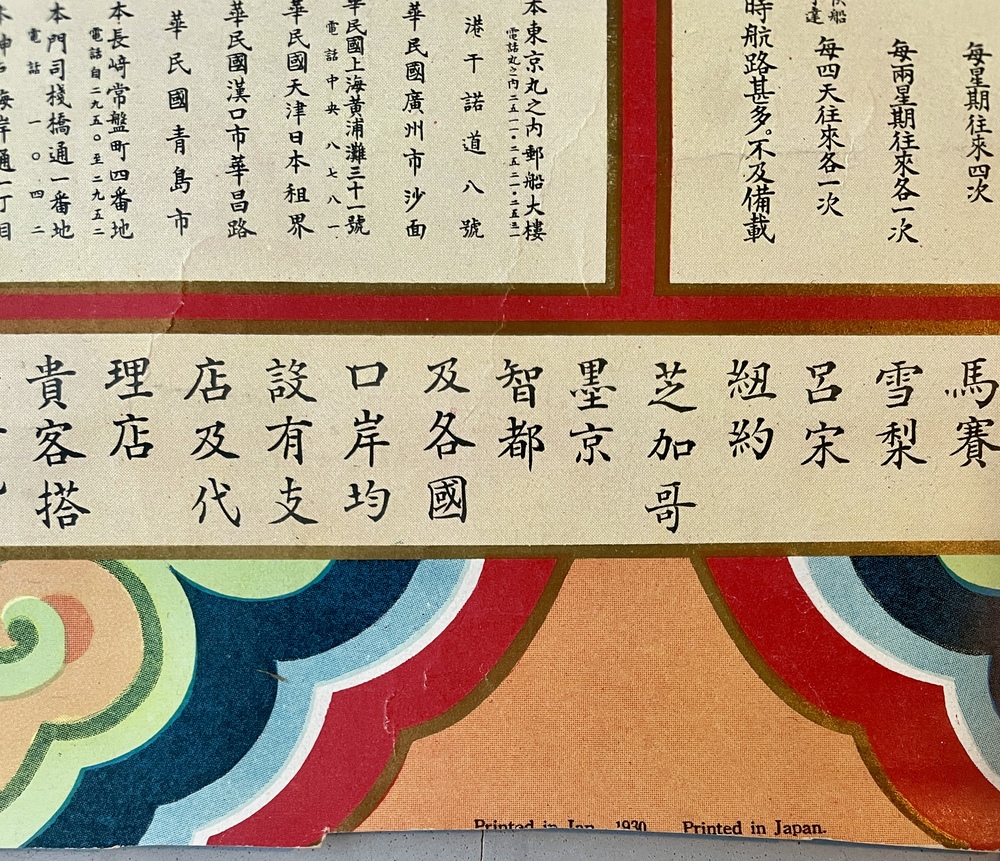 このポスターは日本郵船が作成した1930年のカレンダーを兼ねた宣伝ポスターで、テキストが中国語で記されているほか、中華民国が建国した際に創設された民国紀元(19年)が併記されているという大変珍しい作品です。 日本国内や西洋諸国向けのポスターやカレンダーとはやや形状の異なる、縦長の短冊のような図面の中心に描かれているデッキで寛ぐ女性の背景には日本郵船の大型客船とカモメが描き込まれており、足元に置かれた救命浮輪には「N(ippon)Y(usen)K(aisha」と明記されていて、さりげなく同社のポスターであることを画中でもアピールしていることがわかります。図面下部のテキストでは日本郵船の簡単な社史と、同社が当時就航していた上海や香港をはじめとした中国大陸各地への航路と支店が記されています。このカレンダーのデザインは、日本のポスター黎明期に多く見られたいわゆる「美人画」の系譜にあるとも言えなくはありませんが、背面に鮮やかな赤を据えた独特のデザインは日本国内や西洋諸国向けのポスターや広告等には見られない色使いで、このカレンダーが中国市場の好みに合わせて特別に製作されたことを示唆しています。図面左下には絵師の落款と思しきものも見受けられますが、店主には絵師を特定することができておりません。 このカレンダーの色鮮やかな印刷を手掛けたのは、石版多色印刷技術に秀でていたことで知られる三間印刷で、同社社主の三間隆次はドイツをはじめとした海外の最新印刷技術の導入に積極的なパイオニア的人物であったことでも知られています。三間印刷は東洋汽船による美しいポスターも手がけており、高度な印刷技術力が求められる海外向けのポスター製作にも豊富な経験がありました。 なお、このポスターは著しい褪色などもなく、比較的状態の良いものと思われますが、ポスター下部の発行年や発行地を示す小さなテキストの一部が切れていることからも分かるように、最下部の一部が切り取られているようです。また、裏面に幾つかの補修跡も見られ、「OAKLAND PUBLIC LIBRARY DEPARTMENT OF FINE, ARTS」という(かなり古い年代と思われる)押印がみられます。