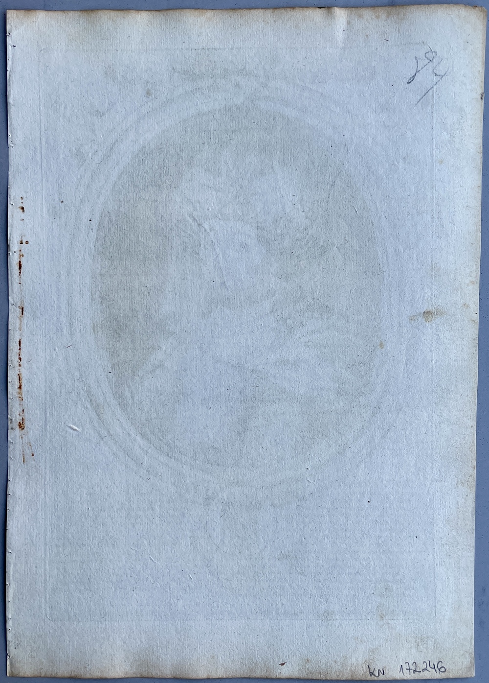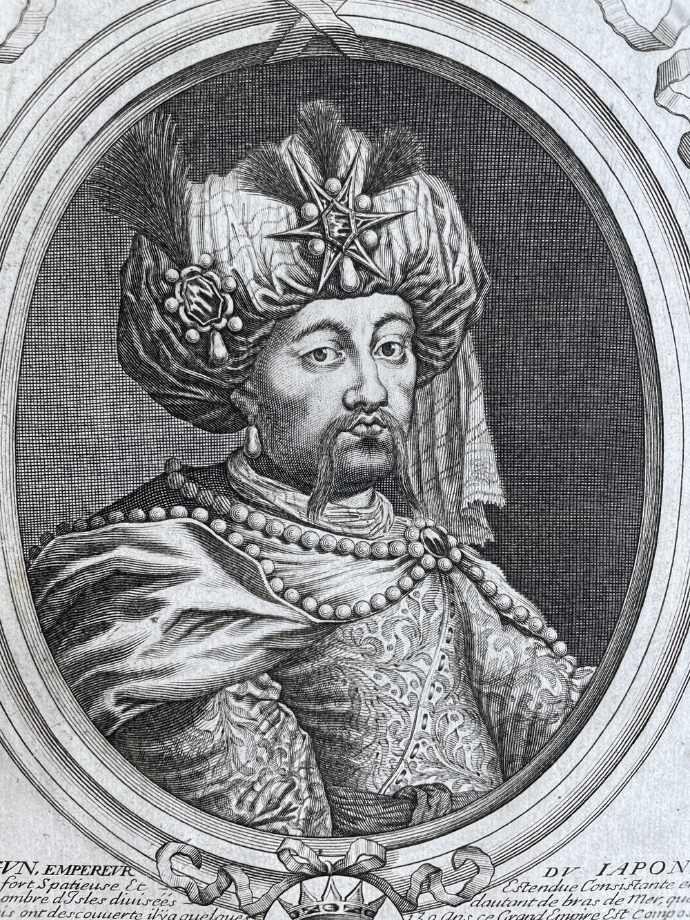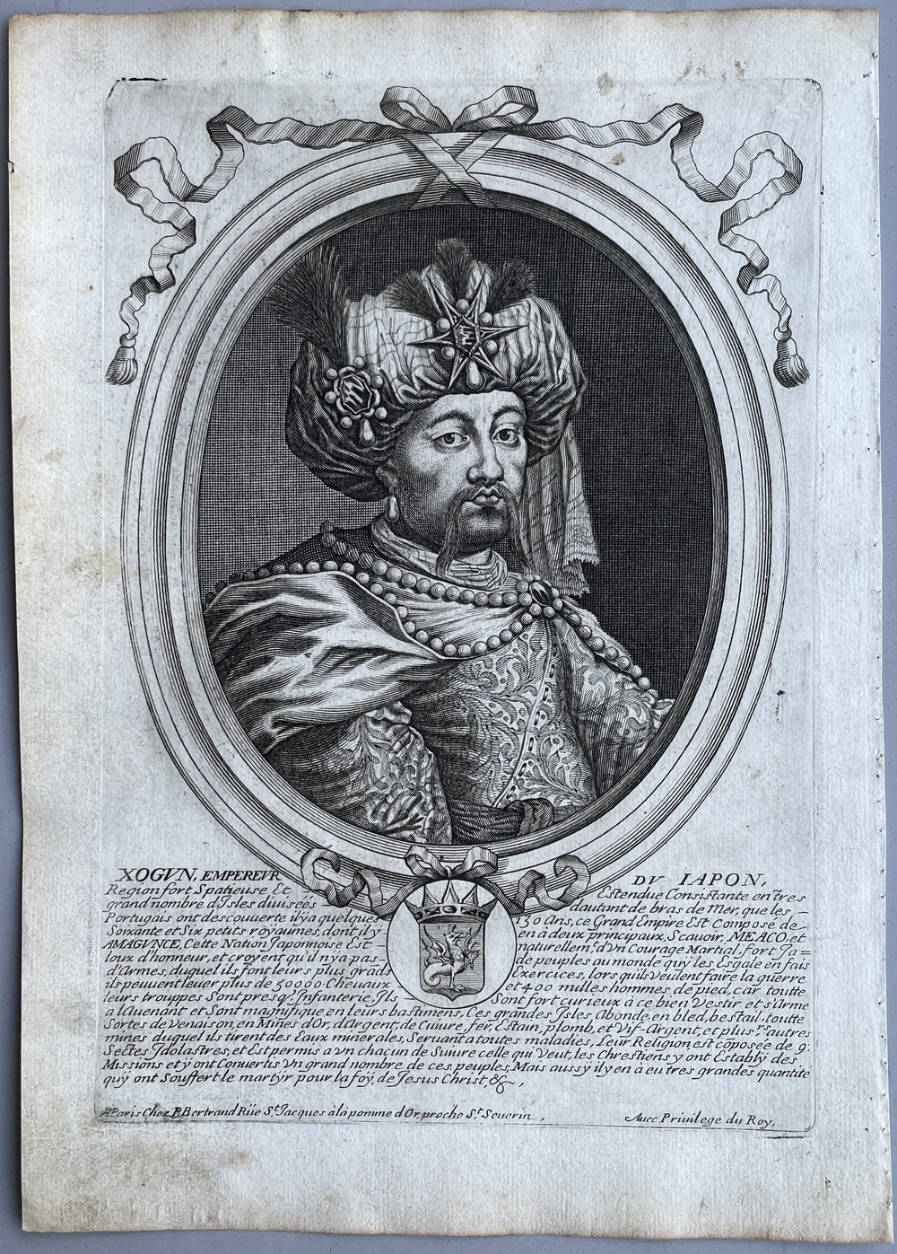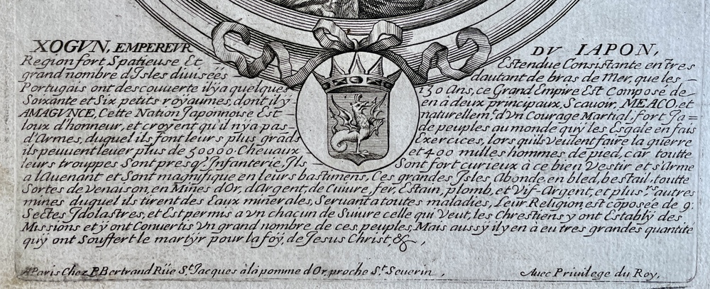 このユニークな銅版画は、日本の将軍を想像で描いたもので、17世紀後半頃にパリで出版されたものです。描写自体は非常に精巧で写実的ですが、実際に日本の衣装とはかけ離れた姿で描かれていて、当時のヨーロッパにおける日本の君主像の一例を垣間見せてくれる作品です。本図が製作された17世紀のヨーロッパでは、日本の殉教者を描いた様々な銅版画作品が製作されていますが、本図は、そうした殉教事件を引き起こした迫害者である「暴君」としての日本の為政者を描いた同時代の作品として、非常に興味深い作品ということができます。 この図を描いたのは、ラルメッサン(一世、Nicolas de Larmessin I, 1632-1694)で、 ルイ14世をはじめとして本図を含めた世界の君主を描いた銅版画作品を制作したことで知られています。これらの君主を描いた銅版画作品は、何らかの書籍のために用意されたものではなく、当初から独立した個別の作品としてそれぞれ製作されたようで、全体でどれほどの作品が製作されたのかについては定かではありません。いずれの作品も非常に精巧で写実的な表現がなされていることが特徴で、版画作品としては高い評価を受けているようです。 ラルメッサンがなぜ「日本の将軍」を描こうとしたのかは不明ですが、図像の下部にびっしりと記されたテキストから推察すると、おそらくはイエズス会士らの日本報告書などを参照にして本図を製作しているようです。テキストでは、日本についての概説的な解説がなされていて、日本は「約130年前にポルトガル人が発見した」島国であるとされています。この記述から、この図版が製作されたのがおおよそ1670年代前後であることが推測できます。日本は66の小さな王国から構成されていて、それらのうちの主要な王国は「京都(Meaco)」と「山口(Imagunce)」であると説明されていて、江戸時代以降のオランダ人らによる日本情報ではなく、それ以前のイエズス会士らの日本報告を参照していることがうかがえます。日本の人々は名誉を重んじて、軍人として極めて勇敢で、幼い頃から武器とっているとして、強大な軍隊が存在することが強調されています。また、金、銀、銅、鉄、鈴、鉛等の鉱物資源が豊富に産出するとも紹介されています。日本の宗教については、9つの偶像崇拝の宗派があるが、宣教師によるキリスト教の改宗が行われ、その結果多くのキリスト教信者が生まれたが、その信仰のゆえに殉教を余儀なくされた人々が日本には数多くいるとしています。この短いながらも充実した記事からは、日本の将軍に対してラルメッサンがいかなる評価を有していたのかを具体的に伺うことはできませんが、文末にキリスト教の迫害と殉教者のことについて言及していることから、こうした迫害を行なった「将軍」を少なくとも肯定的には捉えていないのではないかと思われます。 秀吉や家康といった、キリスト教迫害期に強大な権力を獲得していった日本の為政者を銅版画作品で描く試みは、イタリア人クラッソ(Lorenzo Crasso, 1623 - 1691)が1683年にヴェネツィアで出版した『著名武将列伝 (elogii di capitani illustri scritti. Venice, 1683)』において描かれた秀吉、家康の図が代表的なものとして知られていますが、本図はこれに連なる同時代の優れた作品と考えることができます。本図とクラッソの作品に共通しているのは、キリスト教徒を迫害した残忍な為政者として「将軍」を描く一方で、その強大な権力と富を、西洋諸国の強大な君主に匹敵する存在として描く姿勢です。こうした描き方は、(それが作者の意図であったかどうかは別にして)結果的に、こうした強大な権力を有する「暴君」による迫害にもかかわらず、それに屈することなく信仰を貫いたキリスト教信者を間接的に称賛する効果をもたらしているとも言えます。その意味では、17世紀のヨーロッパで製作された日本の殉教者を描いた様々な銅版画作品と並んで、そうした迫害をもたらした側の為政者(「暴君」)を描いた同時代の銅版画作品として、大変興味深い作品と言えるでしょう。なお、クラッソの作品が書物として出版されているのに対して、本図は1枚ごとの単独の銅版画作品として製作されているため、その現存数は、かなり少ないのではないかと思われます。