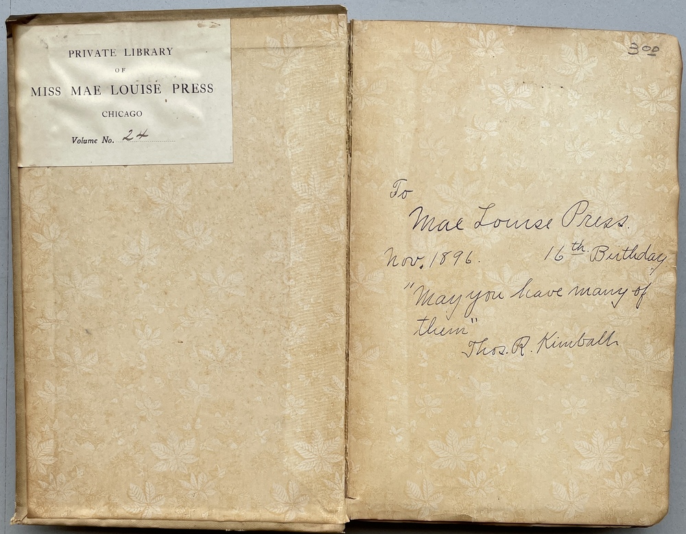 装丁装飾にに褪色が見られ、本文小口部に傷みが見られる。旧蔵者による蔵書票の貼り付けと書き込みあり。