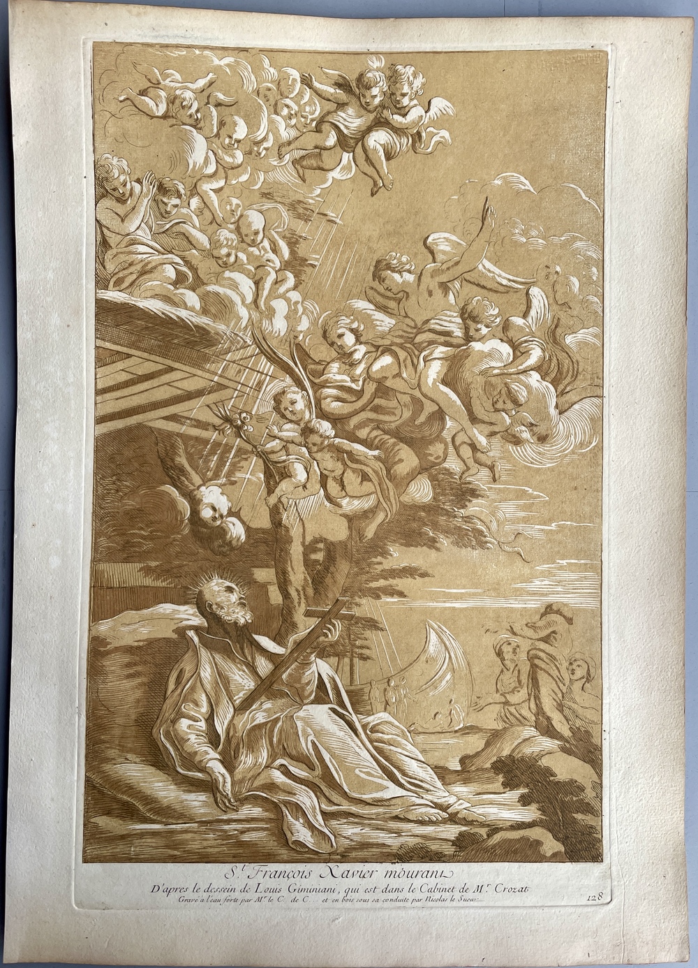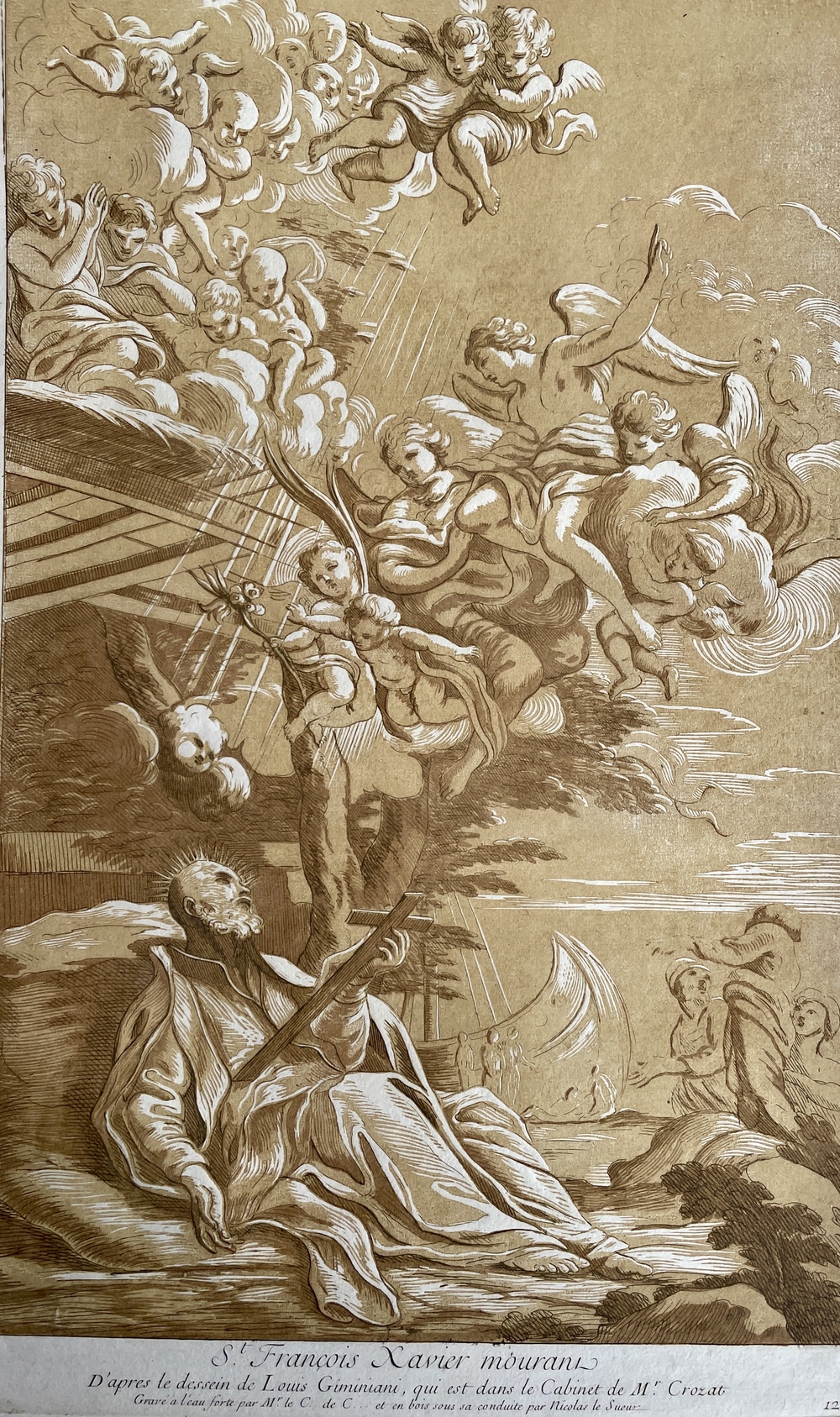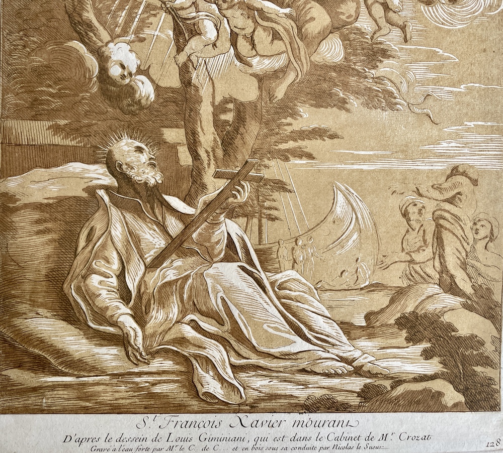 St. Francois Xavier mourant. D’après le dessein de Louis Giminiani, qui est dans le Cabinet De M.r Crozat. Gravé a l’eau forte par M.r le C… De C… et en bois sous sa conduite par Nicolas le Sueur.