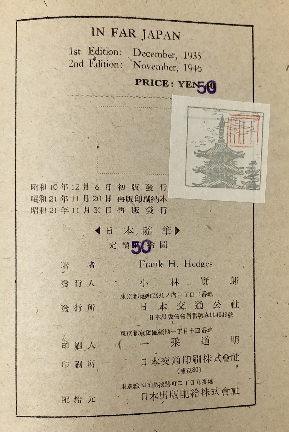 昭和10年12月6日初版発行 昭和21年11月20日再版印刷納本 11月30日再版発行.