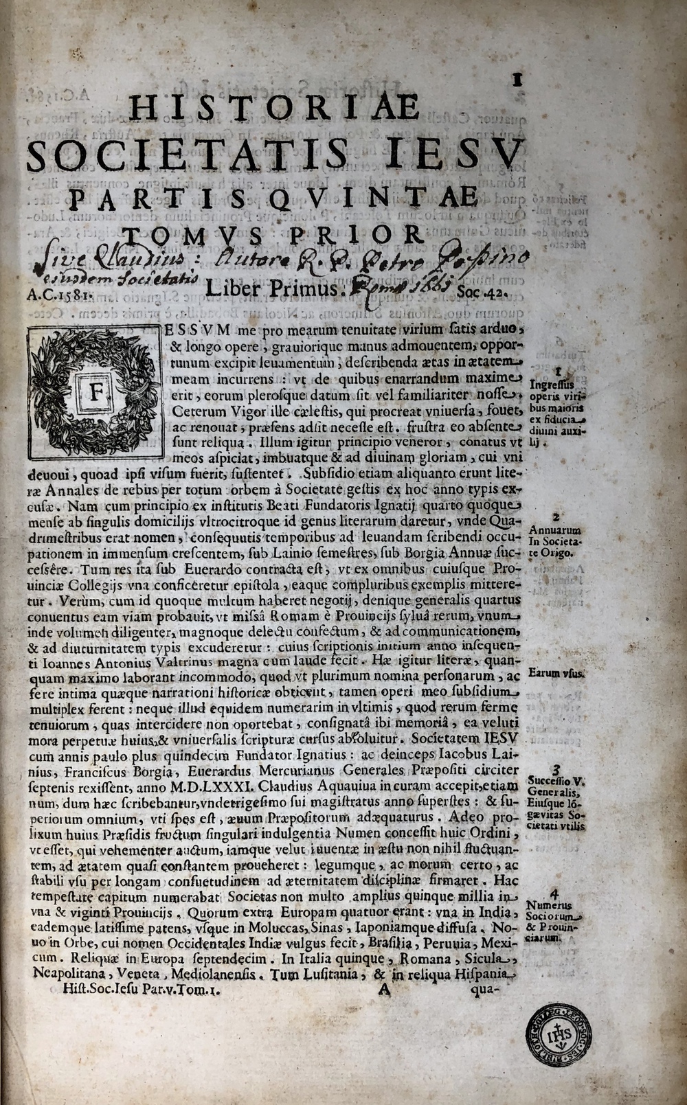 HISTORIAE SOCIETATIS IESV PARS QVINTA SIVE CLAVDIVS TOMVS PRIOR...