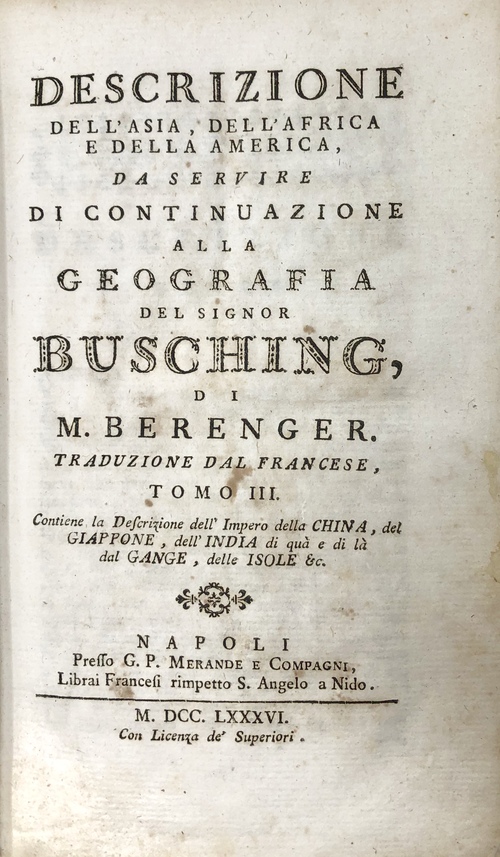 DESCRIZIONE DELL' ASIA, DELL' AFRICA E DELLA AMERICA, DA SERVIRE DI CONTINUAIONE ALLA GEOGRAFIA DEL SIGNOR BUSCHING, DI M. BERENGER. TRADUZIONE DAL FRANCESE, TOMO III.