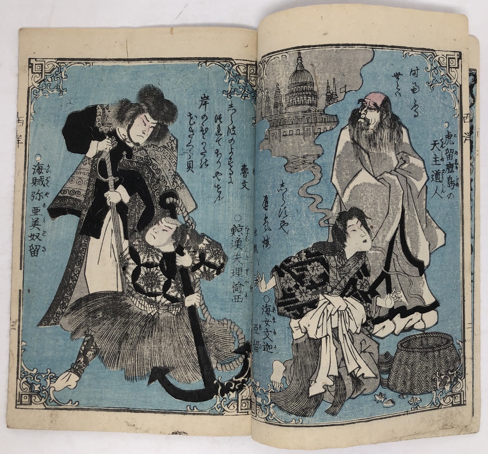 初編上下の表紙。合わせることで1枚の絵となる作り。「左がコルシカ島の少年ナポレオン。『白縫譚』初編の漁師春吉のような姿で、いかり綱を肩に掛けて見得を切ったところ。右は船首フロヂの娘ポテンニヤ。派手なスカートに風呂敷のようなガウンをまとい、紙は島田髷で、不思議な形のいかりを突く。背景をよく見ると怪しげなローマ字をちりばめ、洋風の印象作りに努めているらしい。」