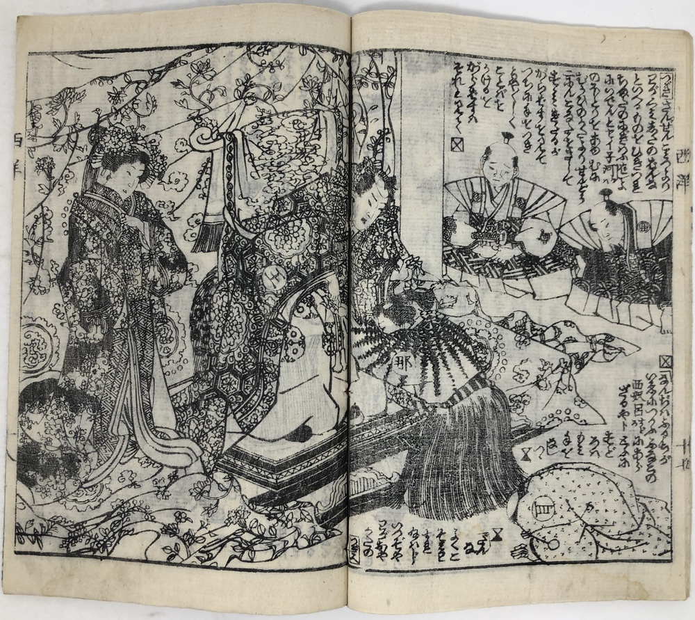 明治初期に広く読まれながらも読み捨てられる草双紙でもあった本書は、現存するものがあまりなく、全体でどのような構成になっていたのかについても不明瞭なところがあります。おそらくこの作品は未完に終わったようで、少なくとも第三編までは刊行されたようですが、それ以降は刊行されなかったものと推察されます。本書は第二編までとなっていますが、上記にあるような販売当時の袋も付属している大変状態の良いもので、視覚資料としての側面が強い資料だけに大変貴重なものと言えます。