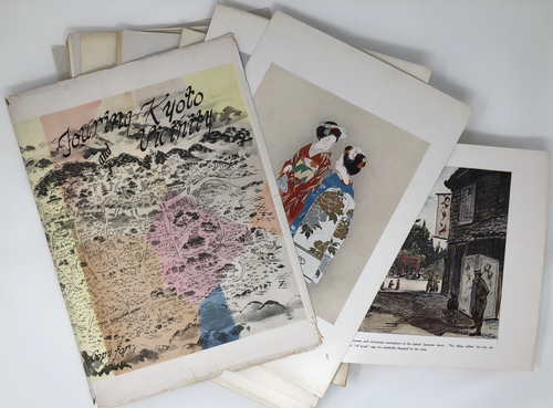 本資料は、GHQが占領期の京都に駐留する高官、要人、あるいは日本の他の占領地から京都を訪れる同種の人に向けて作成されたと思われる異色の京都案内図です。当時の京都を代表する画壇の作家と一部のアメリカ人画家によるカラー34枚、モノクロ53枚からなる、京都とその近郊の風景、そしてその位置を記した地図からなる資料です。しかも、印刷を手がけているのは、これもまた京都を代表する老舗便利堂で、その美しさは、画集としても特筆すべきものがあります。