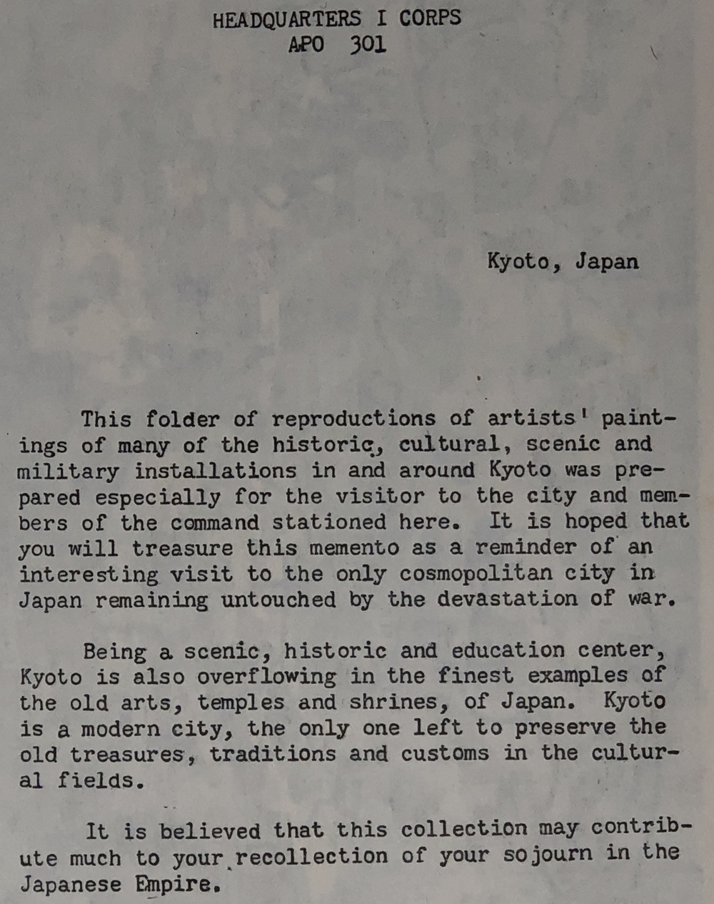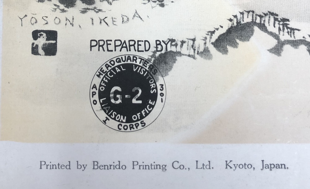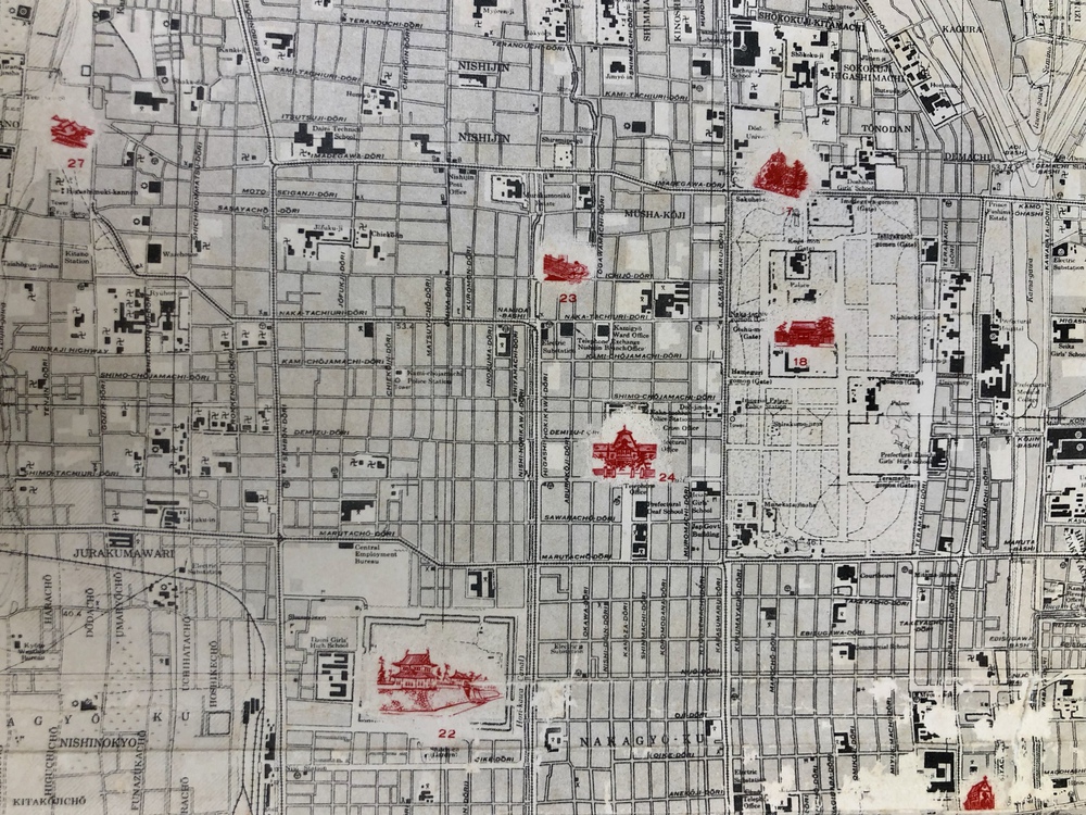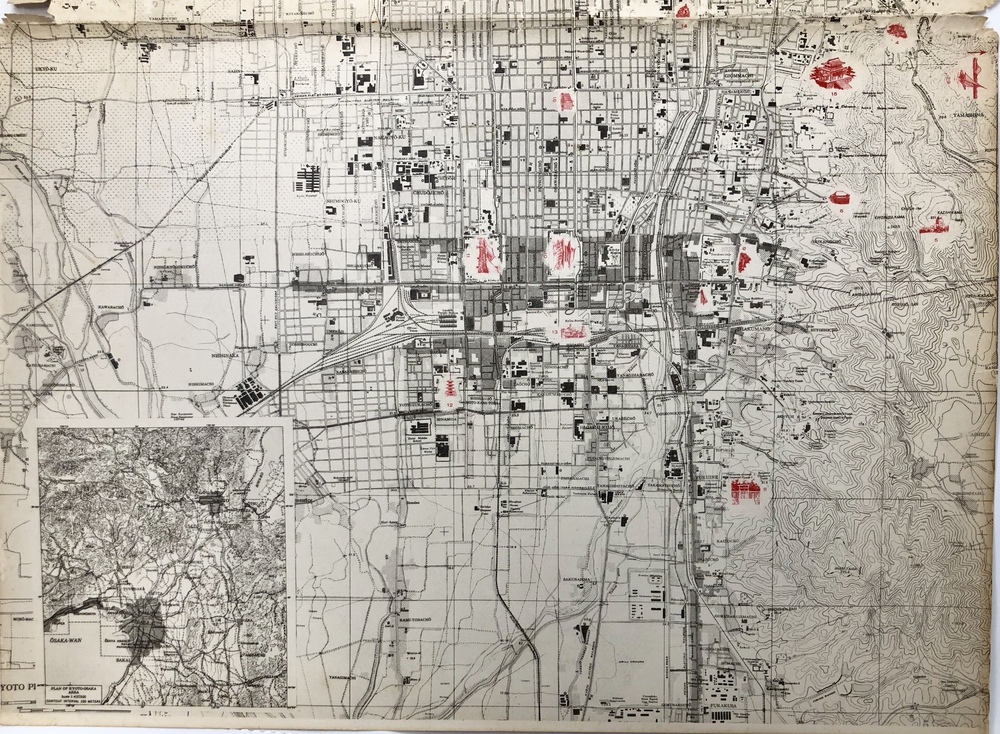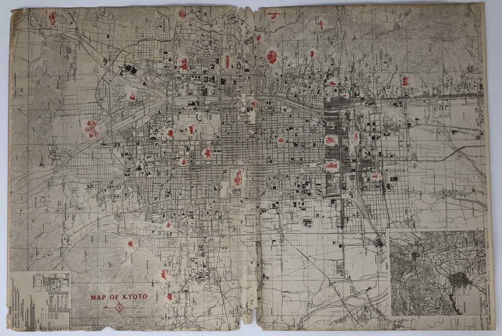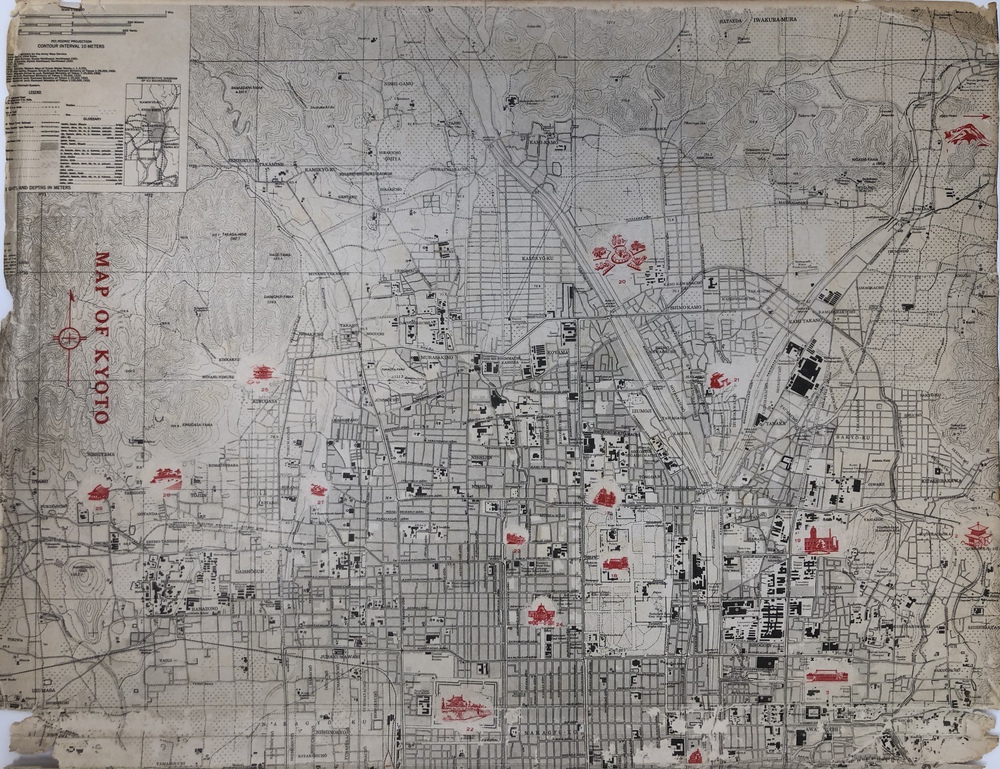 本資料を企画・作成したのは、占領軍公人訪問連絡部(OFFICIAL VISITORS LIAISON OFFICE)で、その名の通り、主に占領軍の高官や要人の接待、予定調整などを行なっていた部門です。当時の京都は、戦禍によって荒廃した日本における、被害が相対的に少なかった都市の一つで、日本に駐留する他の占領軍人の休暇時の保養先でもあったことから、こうした資料が作成されたのではないかと思われます。本資料に付属するタイプ文書には、京都のことを「戦火による災厄を逃れた日本における唯一の国際都市」として紹介しており、その作成の背景を見ることができます。実際に京都を訪問することを想定して本資料が作成されていることは、カバー表紙の裏面に印刷された詳細な京都市内地図から伺え、作品で描かれている地点には目立つように赤い印とその番号が付されています。この地図はそのテキスト情報が示すように、戦中に爆撃計画作成の為に作成されたもので、結果的に正確で詳細且つ簡明な地図だったことから、対象を破壊するための地図から、戦後統治、そして観光するための地図へと転用されたものと思われます。
