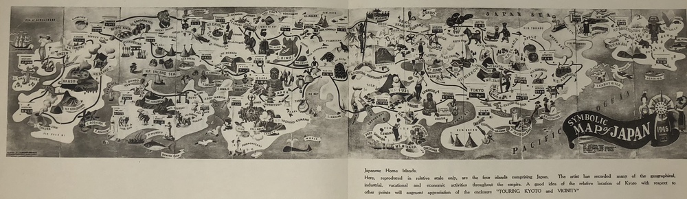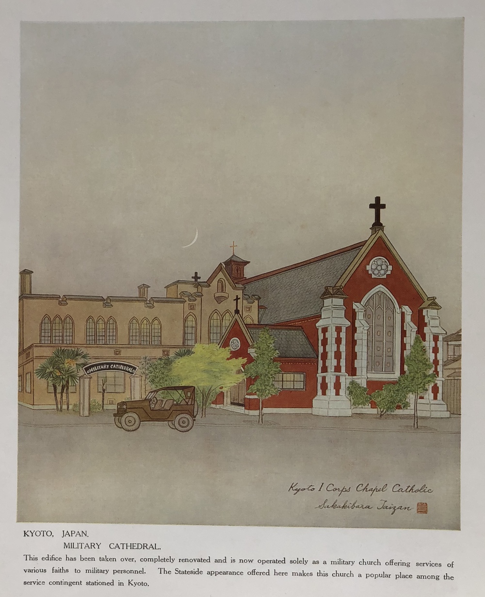 連合国軍による日本占領が1945年8月終わりに開始されてから、早くも9月21日には、京都に占領軍の調査班が入り、同25日には連合国軍第6軍が進駐を開始しています。占領軍は次々と市内の建築物の接収を開始し、大建ビル(現KOKON KARASUMA)に司令部が設置されます。また、植物園は、占領軍の家族用住宅地となったほか、第一赤十字病院も占領軍用病院として接収されるなど、官民問わず多くの施設が占領軍施設、あるいは関連する娯楽施設として用いられました。本資料で描かれる京都は、伝統的な名所、観光地と同時に、こうした占領軍にとって関係の深い建物が多く含まれており、「占領者の目から見た京都」がいかなるものであったかを垣間見ることができます。