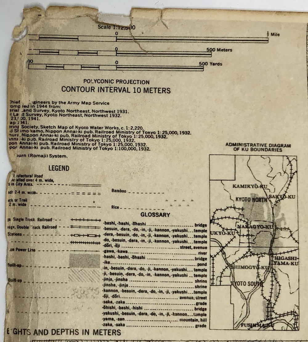 占領期の京都研究については多くの蓄積があり、最近(2017年)では西川裕子氏による、画期的な『古都の占領』(平凡社)も刊行され、戦中から連続する戦争状態としての占領期の京都を社会史の視点で捉えようとする、同書に続く意欲的な研究が今後も待たれます。店主の知る限り、本資料の具体的な企画者や作成過程、日本側の関係者の動きがいかなるものであったかなど、全く明らかにされていないように思われます。そもそも、国内外を問わず、本資料を所蔵する研究機関がほとんど無い模様ですから、これまでの占領軍資料研究でも知られることがなかった資料なのかもしれません。資料の背景や、他の米軍占領地域でも同様の資料が作成されたのかなど、今後、様々な角度からの研究が期待される大変興味深い資料です。