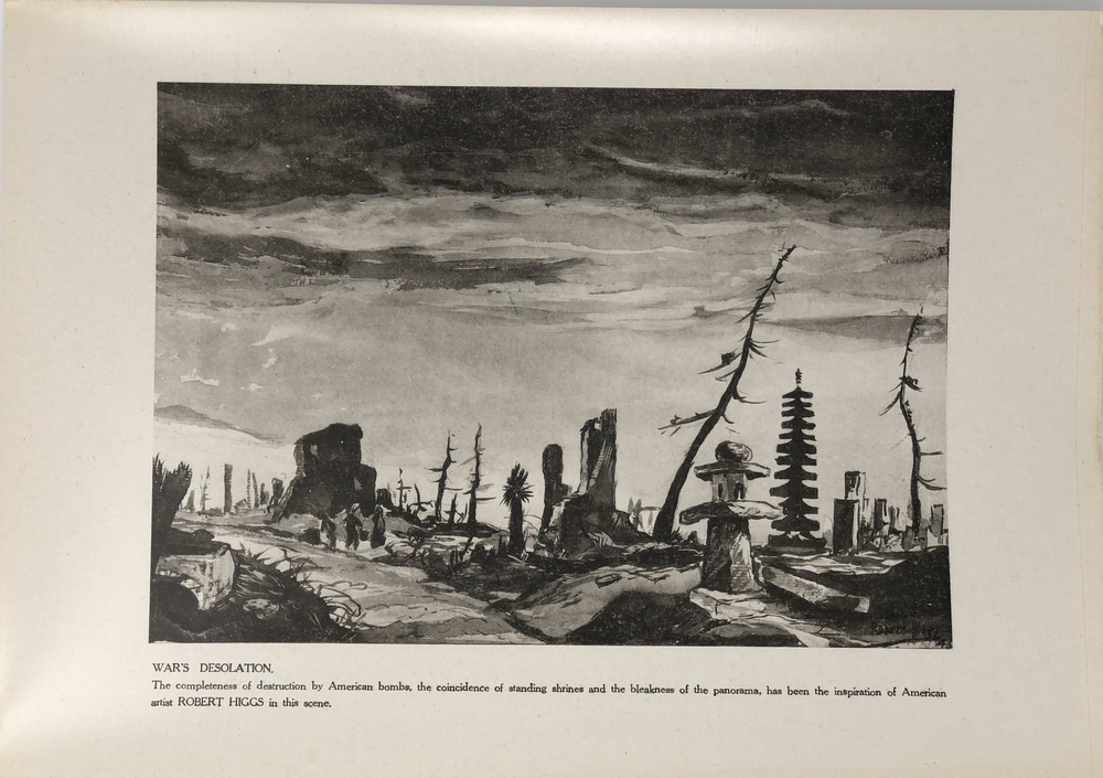 また、本資料はこうした日本の画家だけでなく、アメリカ人画家による作品も含まれており、「日本の街路風景」「戦争による荒廃」「日本の鳥居(白髭神社の湖中大鳥居)」「日本の漁船(広島)」「東本願寺」を描いたのは、ロバート・ヒッグス(Robert Higgs, 1916 - 1967)ですし、それ以外にも無記名ながら、アメリカ人によるものと思われる「呉港」「東大寺大仏」「大阪城」3枚の作品があります。