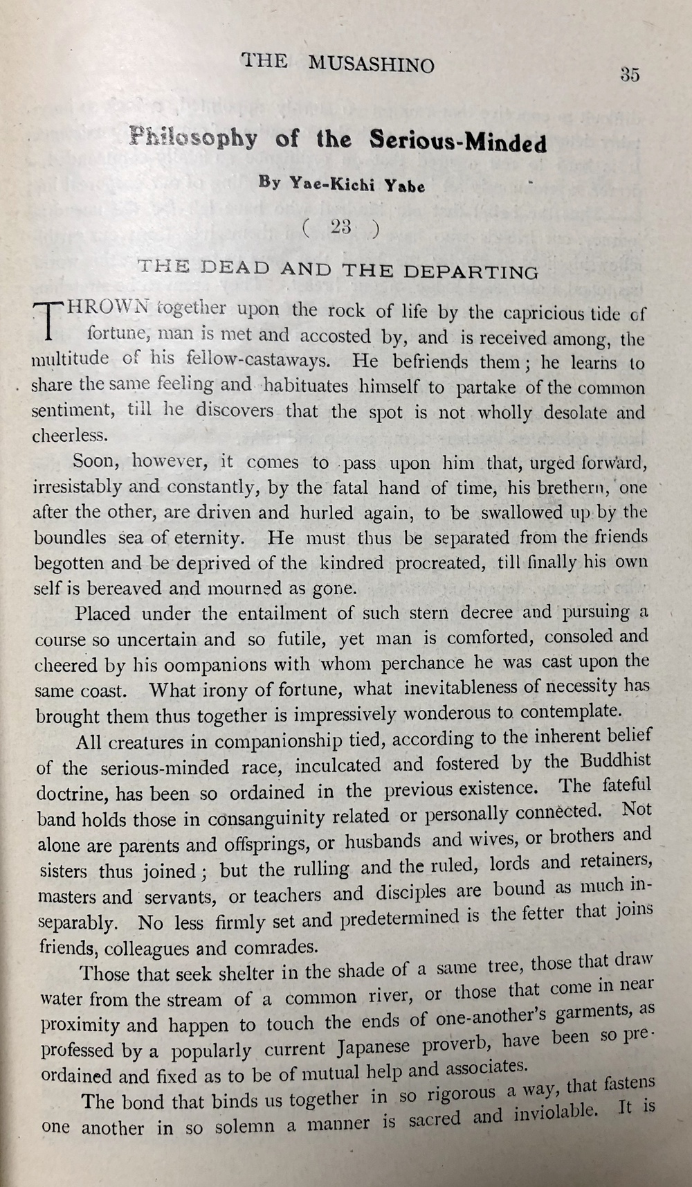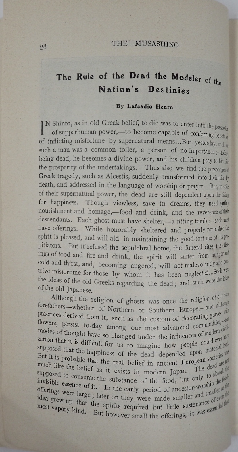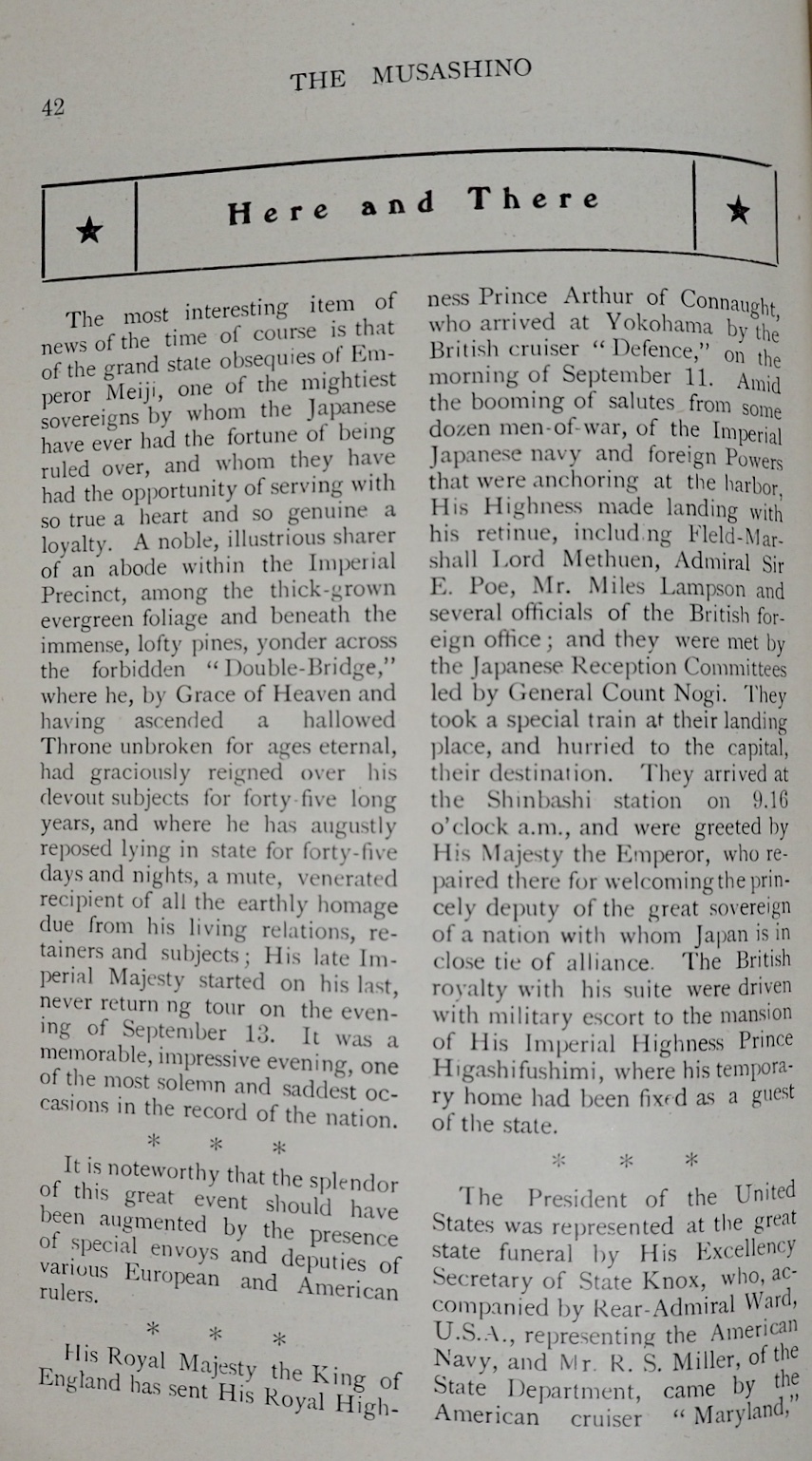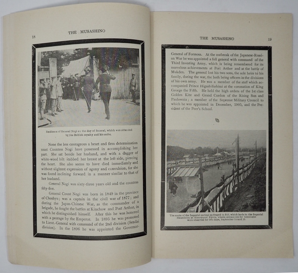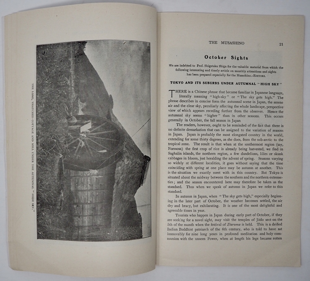 本書は、東京の帝国ホテル内で発行されていた英文月刊雑誌で、日本を訪れた外客に向けて発行されていたと思われるものです。編者の矢部八重吉は、フロイトにも面会している日本における最初期の精神分析導入の立役者として知られる心理学者ですが、一方でジャパン・ツーリスト・ビューロー発行の雑誌「ツーリスト」の常連寄稿者でもあって、外客誘致活動にも積極的に関与していたことが伺えます。この雑誌は、1911年に発刊されたようで1913年8月の第34号をもって、後継雑誌「日本(JAPAN)」に号数をそのまま引き継いで移行し、1916年11月頃まで刊行されていたようです。英文で発行された訪日外客向け雑誌の先駆けとも言えるもので、ビューロー発足前後の外客誘致活動を知る上で大変貴重なものです。 1912年10月に発行された第24号となる本書は、明治天皇崩御の特集号となっています。明治天皇崩御とそれに伴う様々な儀式の模様や、乃木中将の殉死について詳細に論じているほか、各国の政府関係者が弔問に訪れる様子などを写真を交えて紹介しています。一方、通常記事と思われる内容では、10月の日本の見どころを紹介していて、秋が深まり始めた日本の農村の風景を写真とともに解説しています。こうした書き下ろし記事に加えて、ラフカディオハーンの小論を引用掲載するなど編集内容にかなりのこだわりが感じられます。編者の矢部自身による連載記事もあって、ほぼ毎号のペースで連載を続けていたことが伺えます。また、冒頭と巻末の広告ページも興味深いもので、南貞吉の漫遊用達所南商会や高島屋といった、今で言うところのインバウンド需要をターゲットにしていた各種商店の広告を見ることができます。