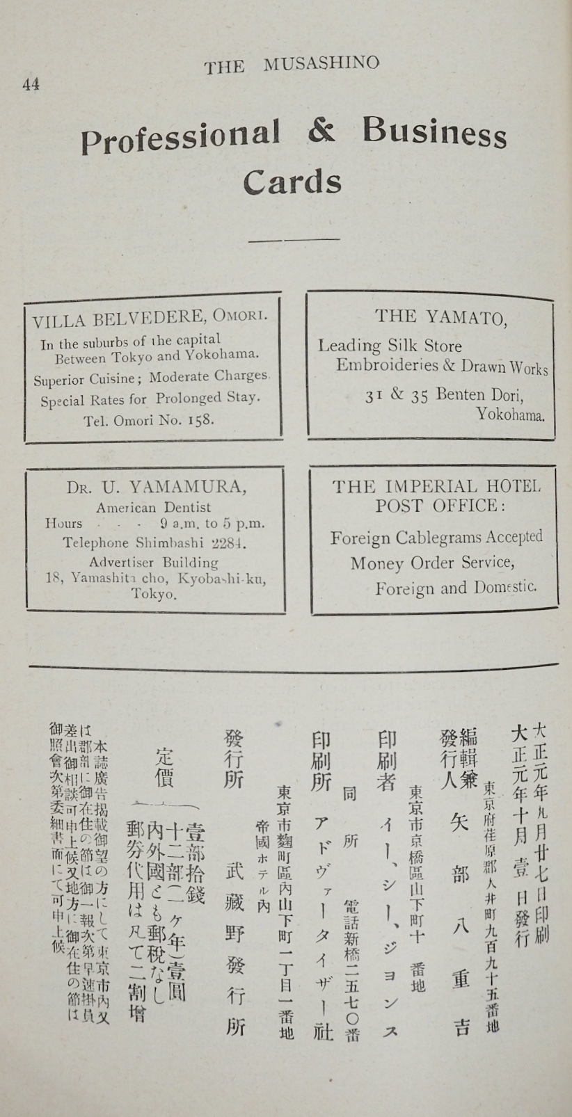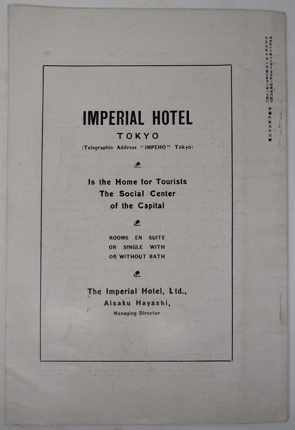 東京市, The Musashino Publishing Office, The IMPERIAL HOTEL, Tokyo.(武蔵野発行所), OCTOBER 1912(大正元年九月廿七日印刷 十月壹日発行). <AB2018190>