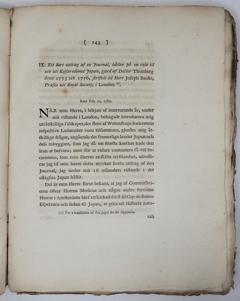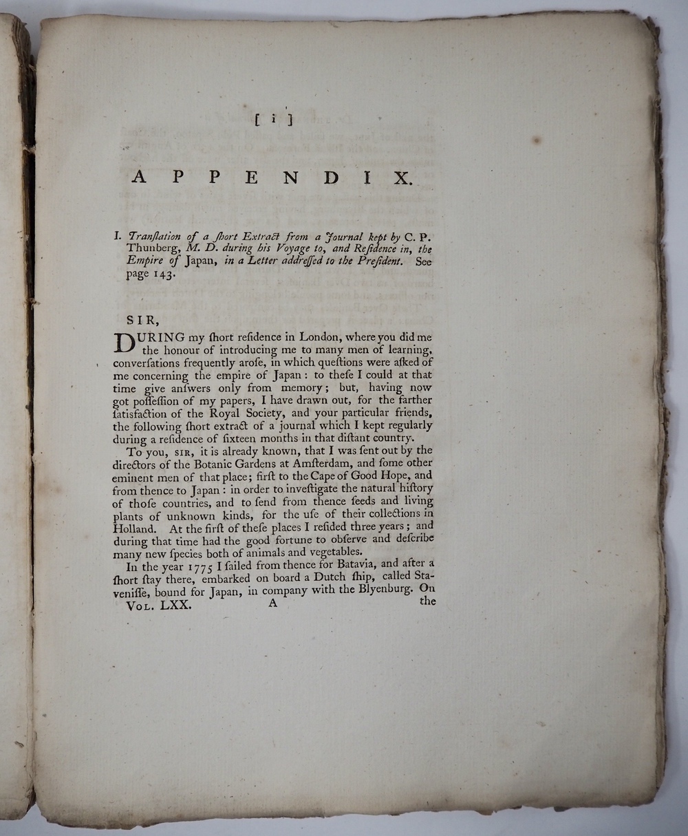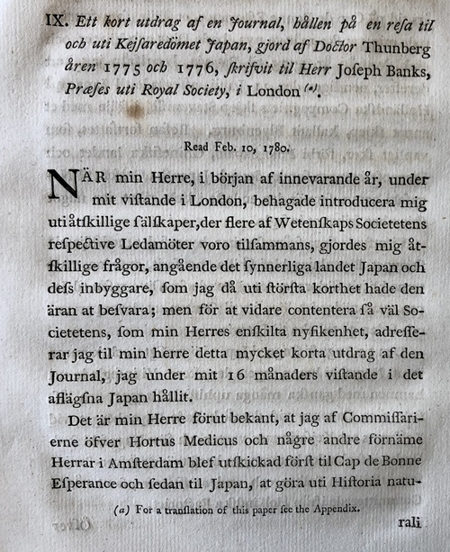 Ett kort utdrag af en journal, hållen på en resa til och uti Kejsardömet Japan, gjord af Doctor Thunberg åren 1775 och 1776, Skrivit til Herr Joseph Banks, praeses uti Royal Society, i London. Read Feb. 10, 1780. [IN ] PHILOSOPHICAL TRANSACTIONS, OF THE